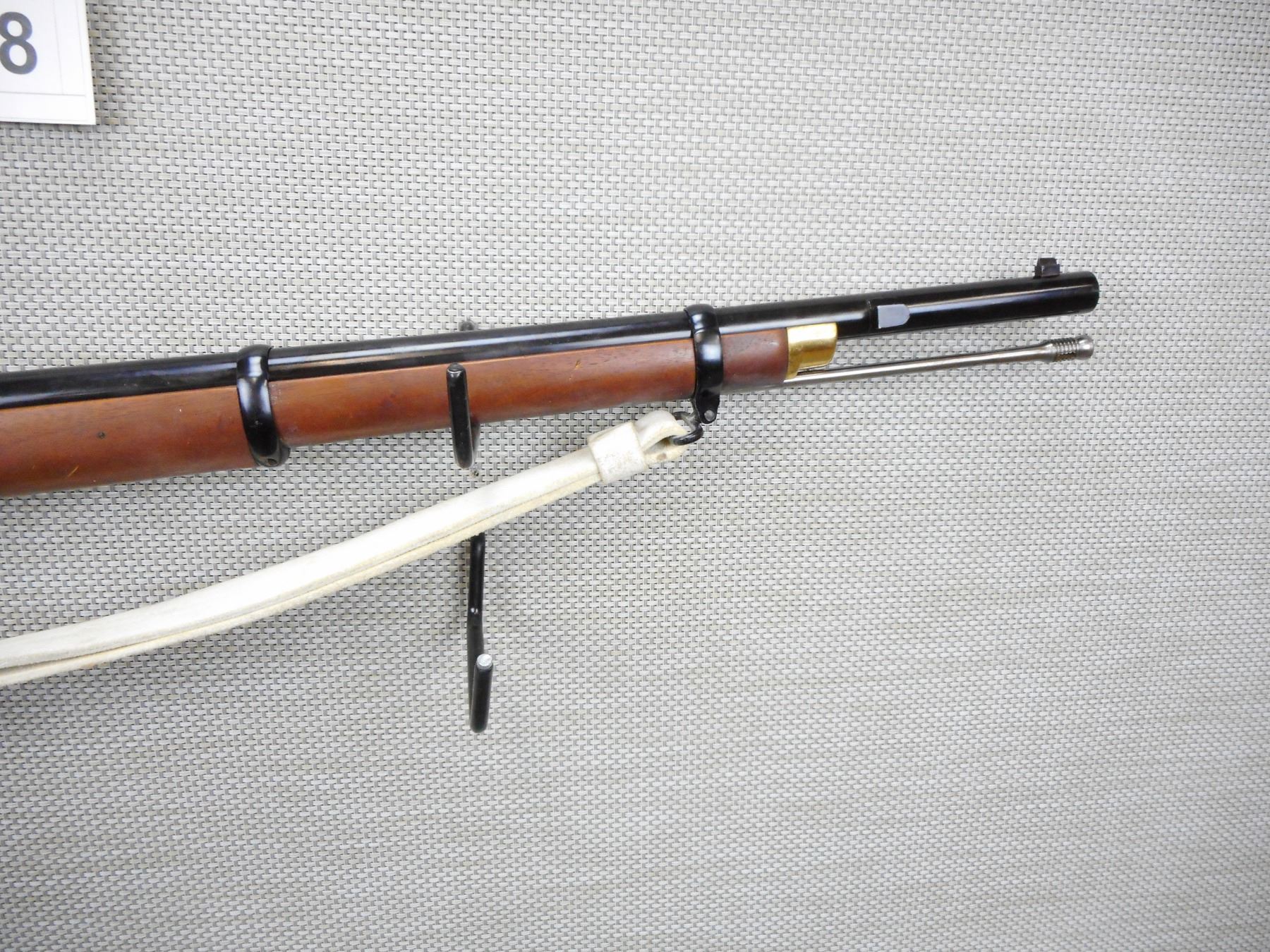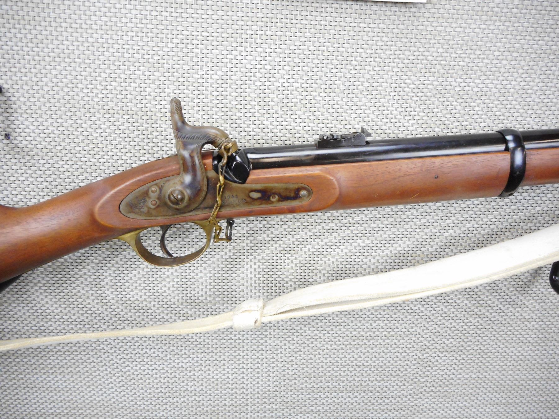 PARKER HALE , MODEL: ARTILLERY CARBINE , CALIBER: 577 PERCUSSION , BORE IS VERY GOOD, RAISED V FRONT SIGHT, ADJUSTABLE REAR SIGHT, BRASS FOREND TRIGGER GUARD AND BUTT PLATE, MARKED ENFIELD 1861 ON THE LOCK, FEATURES A NIPPLE PROTECTOR, ONE PIECE HARDWOOD STOCK, SHOWS VERY LITTLE HANDLING MARKS, SLING SWIVELS WITH WHITE LEATHER SLING, REPRODUCTION OF THE ENFIELD ARTILLERY CARBINE, COMES WITH RAM ROD , SERIAL # N/A , ACTION: SINGLE SHOT RIFLE , BARREL LENGTH: 23" , CONDITION: 8/10 , STOCK # 9123 , CLASS: CANADIAN NON RESTRICTED CLASS