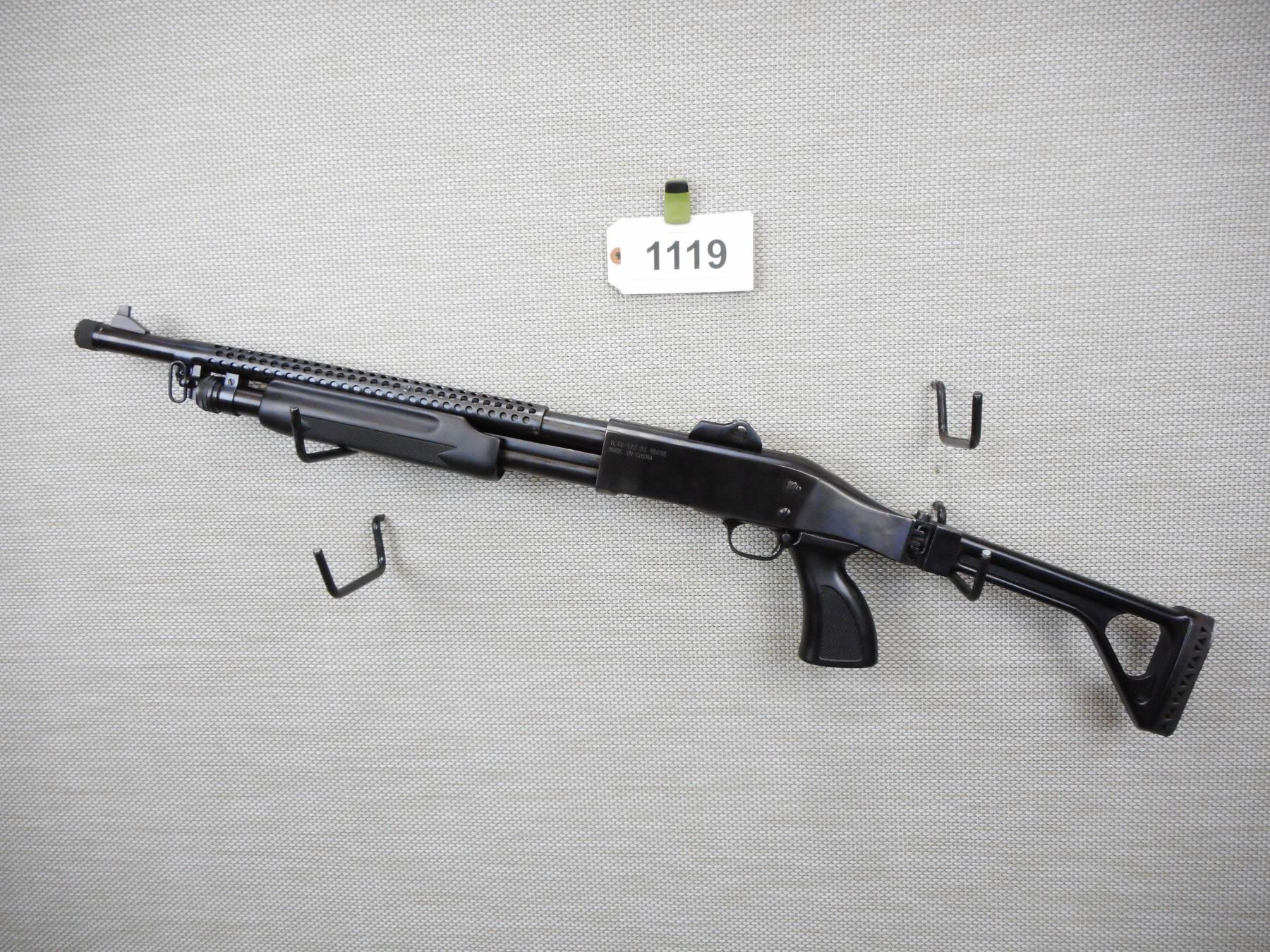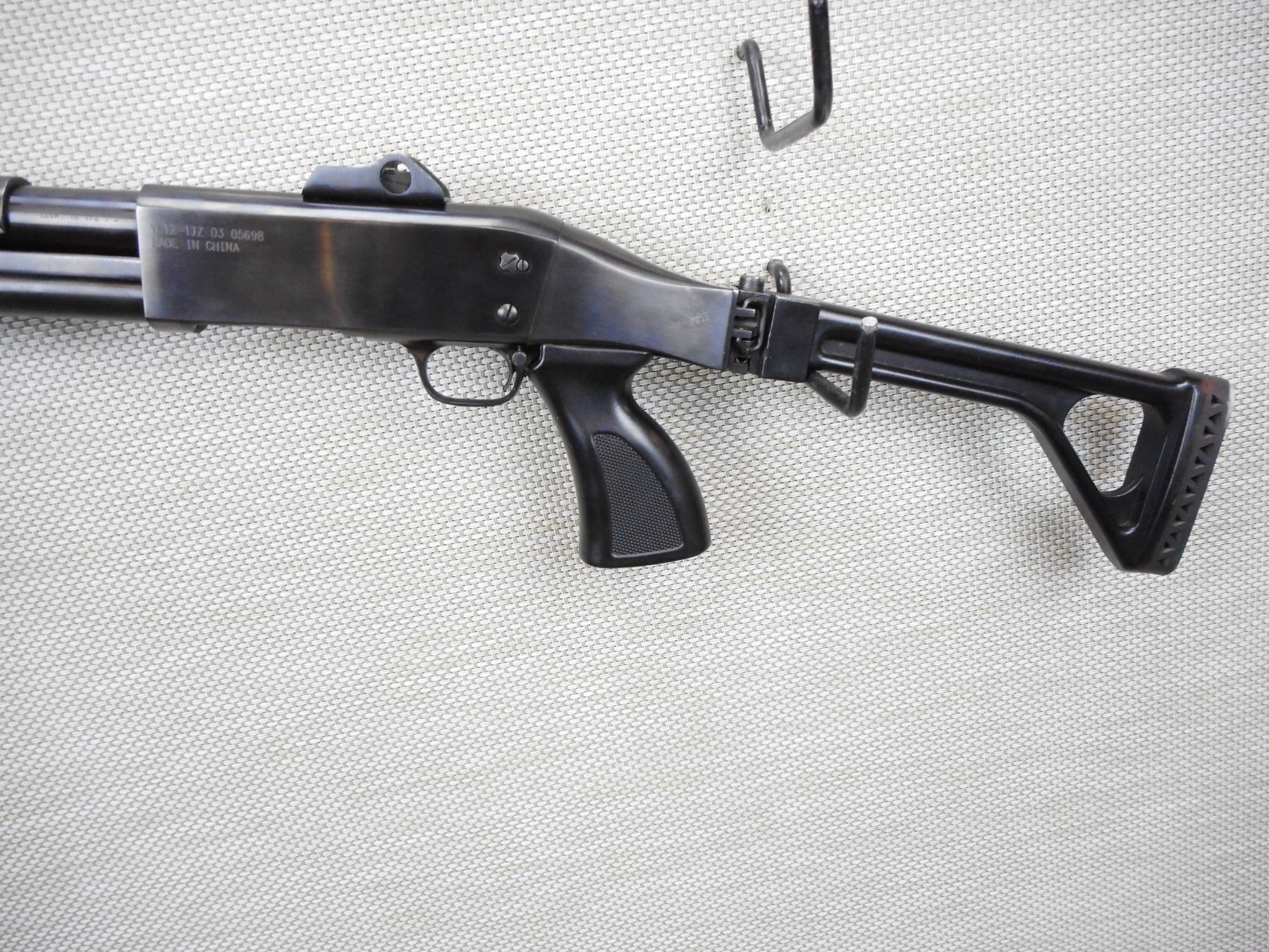 NORINCO , MODEL: YL12-IJZ , CALIBER: 12GA X 3" , BORE IS VERY GOOD, REMOVABLE CHOKE INSTALLED, VENTED BARREL SHROUD, RAMP FRONT AND PEEP ADJUSTABLE REAR SIGHT, SYNTHETIC FOREND WITH FULL PISTOL GRIP AND FOLDING BUTT STOCK, SLING SWIVEL LOOPS , SERIAL # 0305698 , ACTION: PUMP ACTION SHOTGUN , BARREL LENGTH: 18 1/2" , CONDITION: 8/10 , STOCK # 9124 , CLASS: CANADIAN NON RESTRICTED CLASS