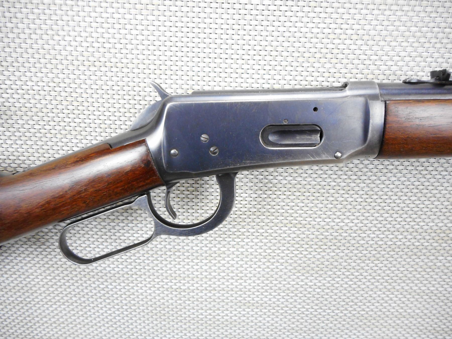 WWII ERA, WINCHESTER , MODEL: 94 , CALIBER: 30 WCF , WWII ERA, MANUFACTURED BETWEEN 1943-1947, VERY GOOD BORE, BLADE FRONT AND ADJUSTABLE REAR SIGHT, STRAIGHT GRIP STOCK WITH STEEL BUTT PLATE, SHOWS SOME HANDLING MARKS , SERIAL # 1487238 , ACTION: LEVER ACTION RIFLE , BARREL LENGTH: 20" , CONDITION: 7/10 , STOCK # 9125 , CLASS: CANADIAN NON RESTRICTED CLASS