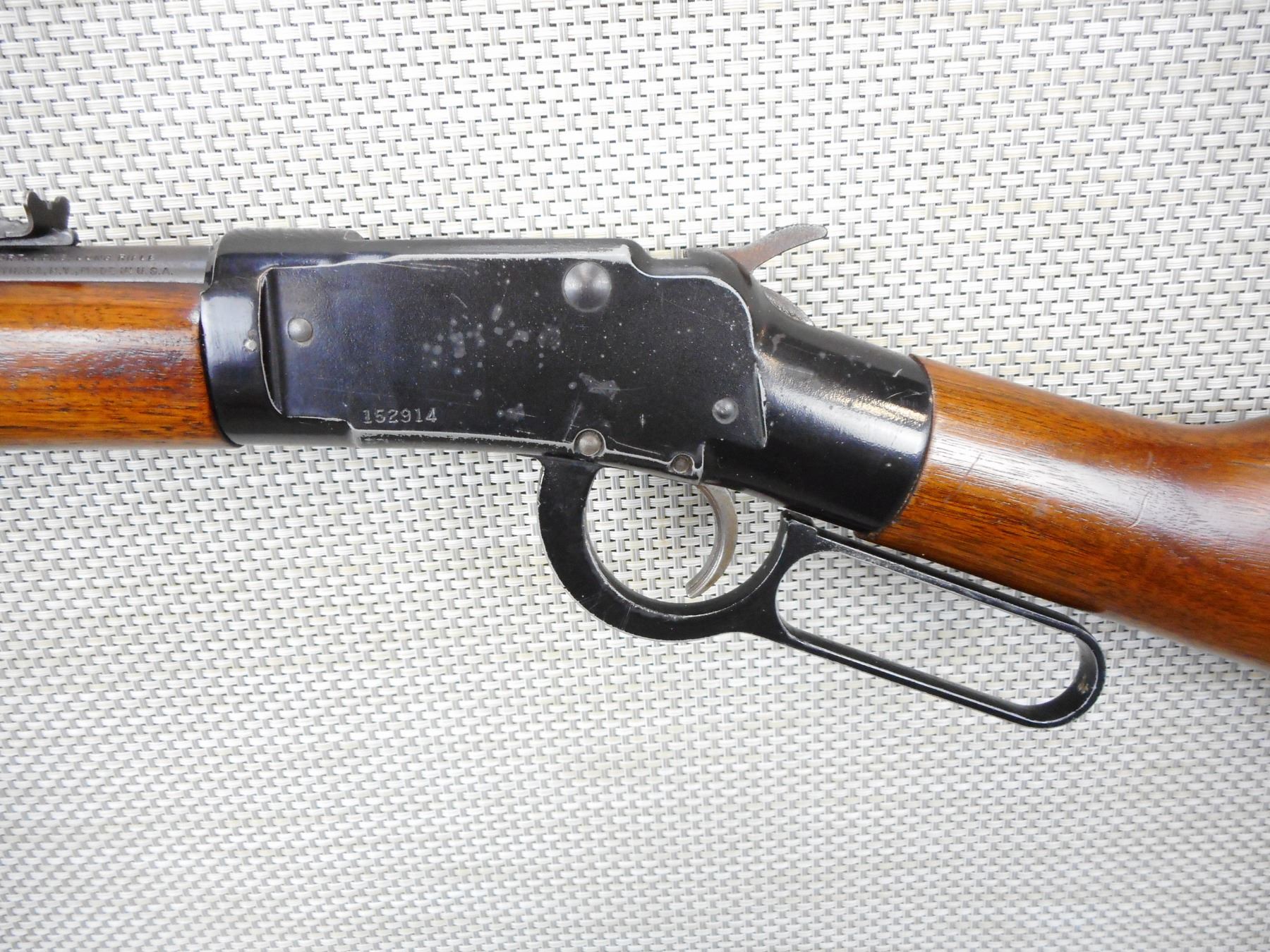 ITHICA , MODEL: M49 , CALIBER: 22 LR , BORE IS VERY GOOD, BLADE FRONT AND ADJUSTABLE REAR SIGHTS, STRAIGHT GRIP BUTT STOCK WITH PLASTIC BUTT PLATE, SHOWS SOME HANDLING MARKS , SERIAL # 152914 , ACTION: SINGLE SHOT LEVER ACTION RIFLE , BARREL LENGTH: 18" , CONDITION: 7/10 , STOCK # 9127 , CLASS: CANADIAN NON RESTRICTED CLASS