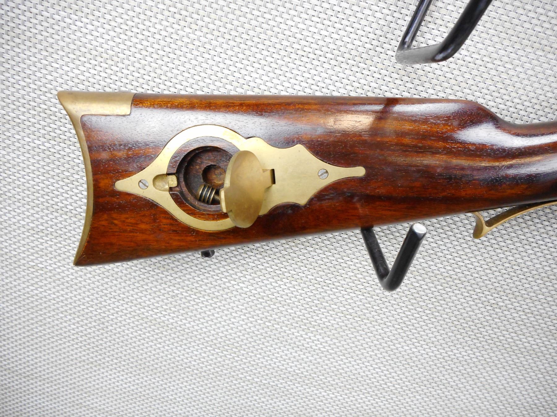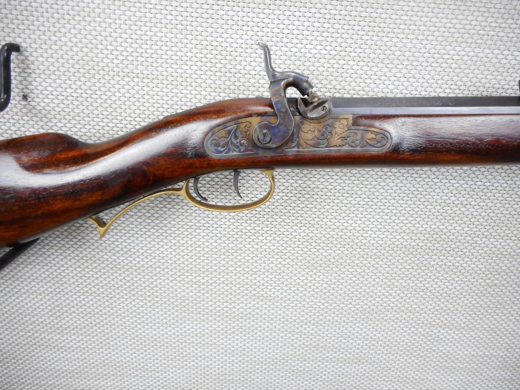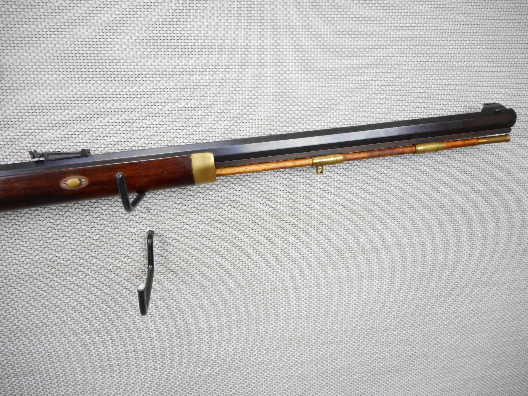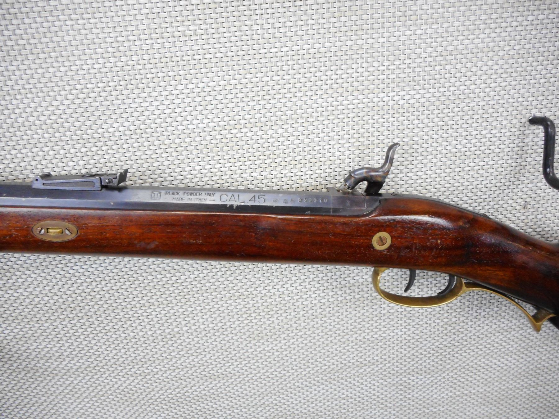 INVESTARM , MODEL: HAWKEN RIFLE , CALIBER: 45 CAL PERC , BLADE FRONT AND ADJUSTABLE REAR SIGHTS, BRASS FOREND CAP, SET TRIGGER, BRASS PATCH BOX AND CRESCENT BUTT PLATE, SLING SWIVEL LOOPS, ENGRAVED RECEIVER, BORE IS GOOD , SERIAL # 232310 , ACTION: SINGLE SHOT PERCUSSION , BARREL LENGTH: 28" , CONDITION: 7/10 , STOCK # 9129 , CLASS: CANADIAN NON RESTRICTED CLASS