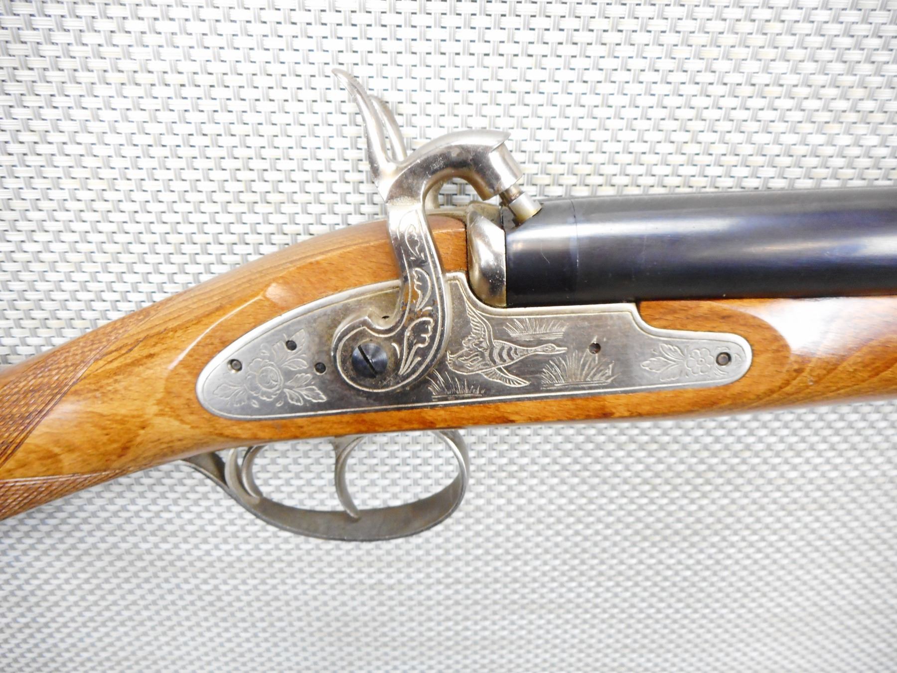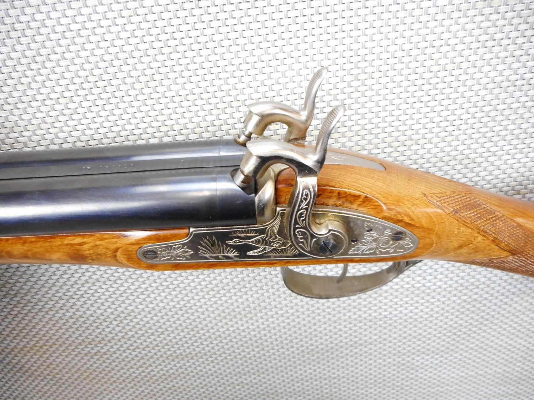 DIKAR , MODEL: PERCUSSION SHOTGUN , CALIBER: 12 BORE , GOOD BORES, HAS A RAM ROD, BEAD FRONT SIGHT, DOUBLE TRIGGERS AND HAMMERS, GAME SCENE ENGRAVED RECEIVER, CHECKERED STRAIGHT GRIP HARDWOOD STOCK, WITH CHECKERED BUTT END, SHOWS VERY LITTLE HANDLING MARKS , SERIAL # 85059326 , ACTION: MULTI BARREL PERCUSSION , BARREL LENGTH: 28 1/2" , CONDITION: 7/10 , STOCK # 9132 , CLASS: CANADIAN NON RESTRICTED CLASS