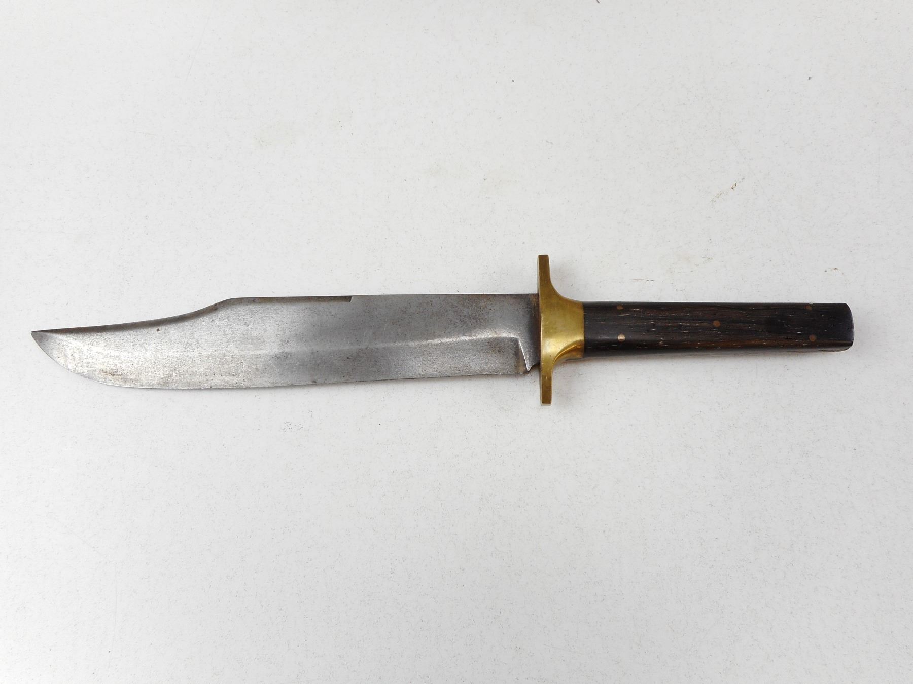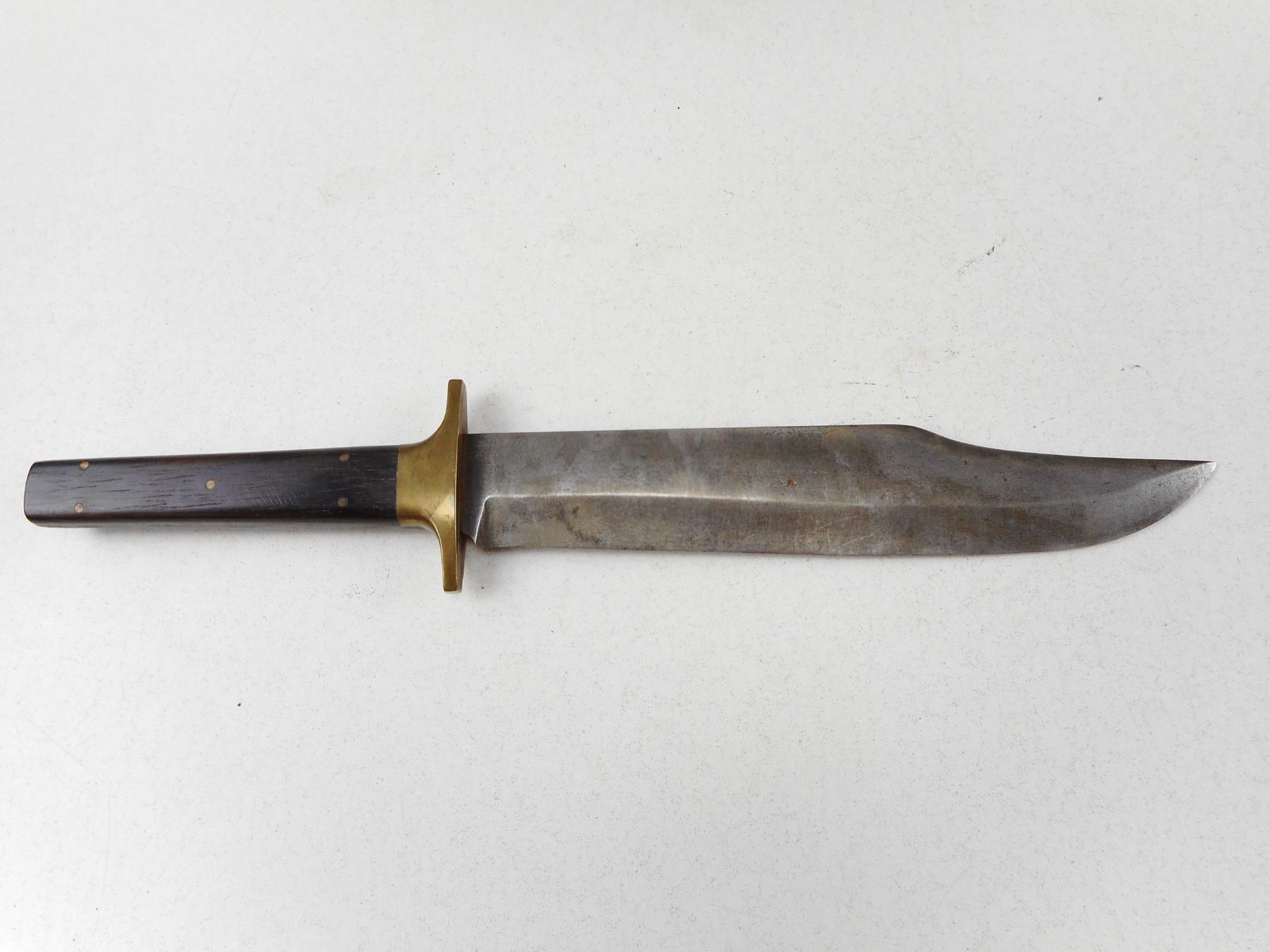 VINTAGE BOWIE KNIFE WITH BRASS GUARD , 9 1/2" BLADE 14 1/2" OVERALL WITH A ROSE WOOD HANDLE, NO SHEATH