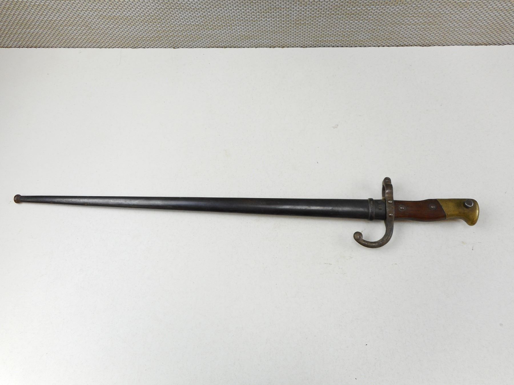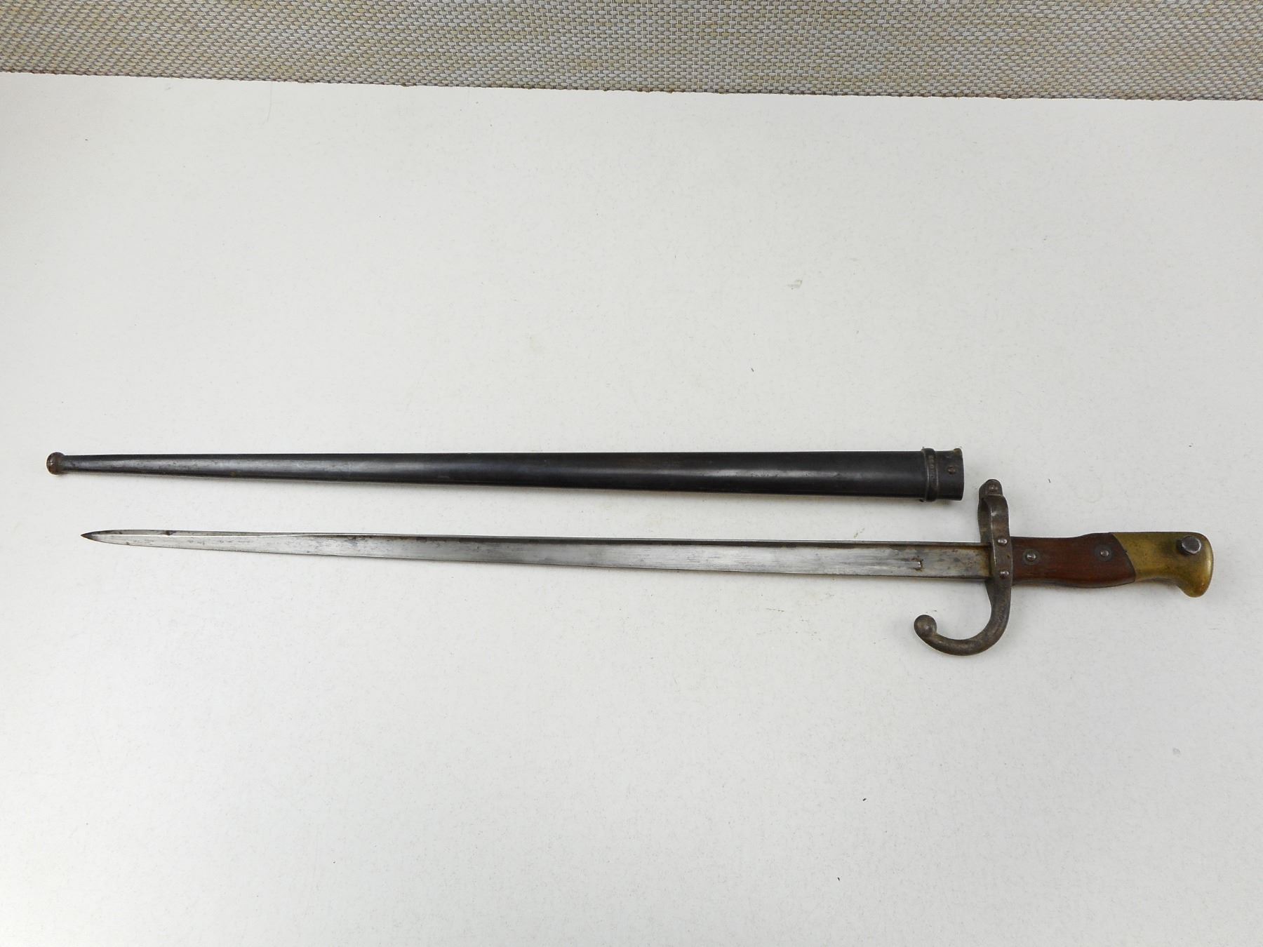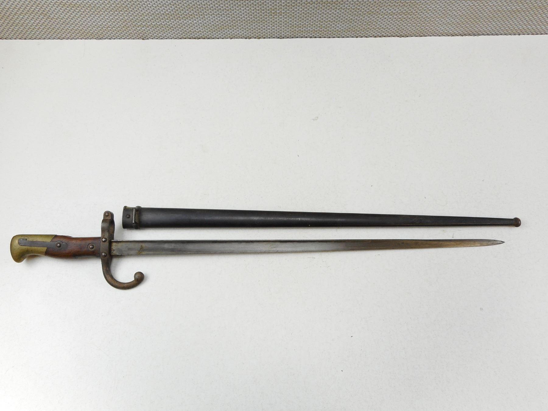FRENCH 1878 BAYONET , BACK ETCHED BUT WORN DATED NOVEMBRE 1878, CROSSGUARD MARKED 84437, WITH SCABBARD MARKED N 19033