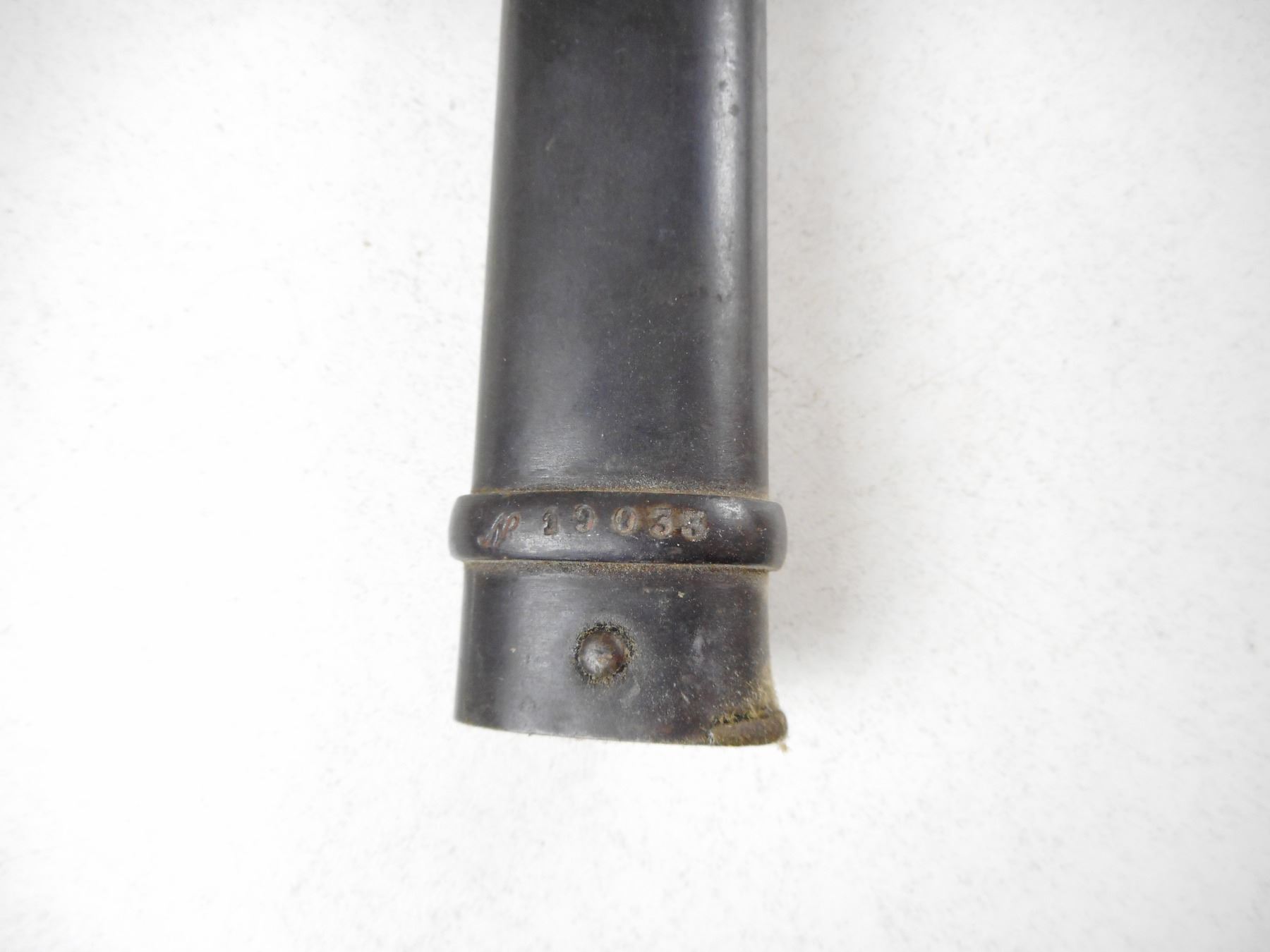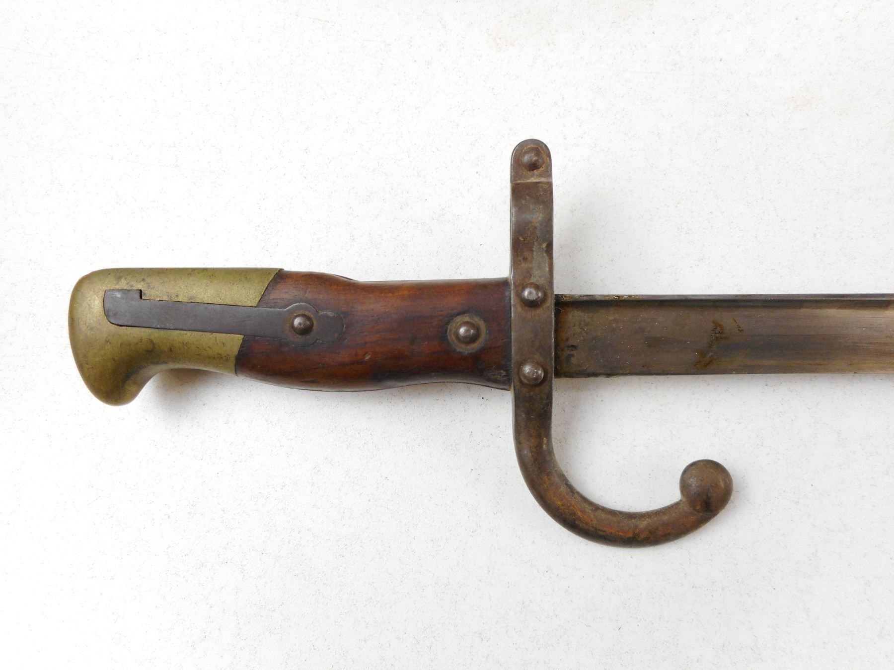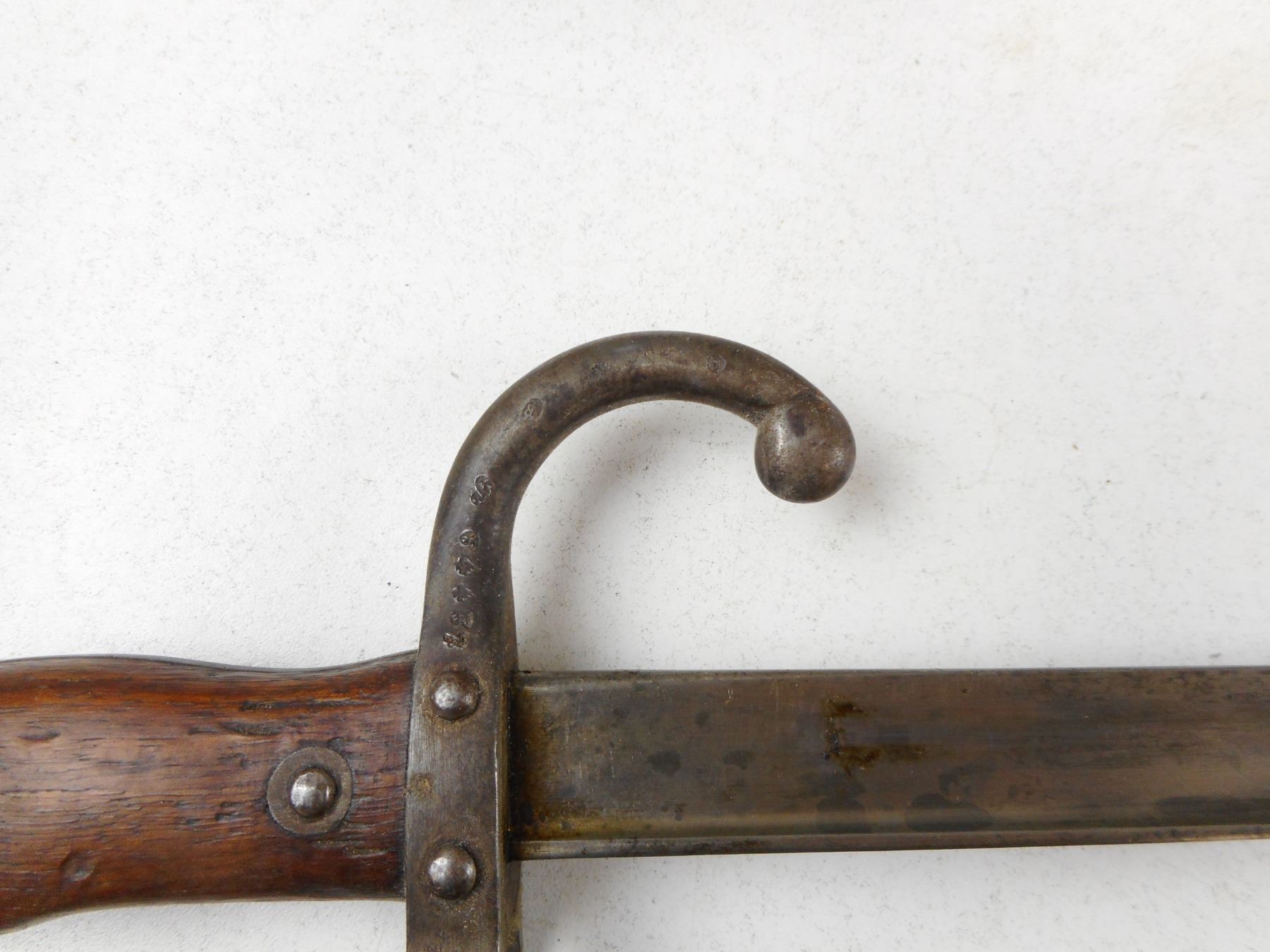 FRENCH 1878 BAYONET , BACK ETCHED BUT WORN DATED NOVEMBRE 1878, CROSSGUARD MARKED 84437, WITH SCABBARD MARKED N 19033