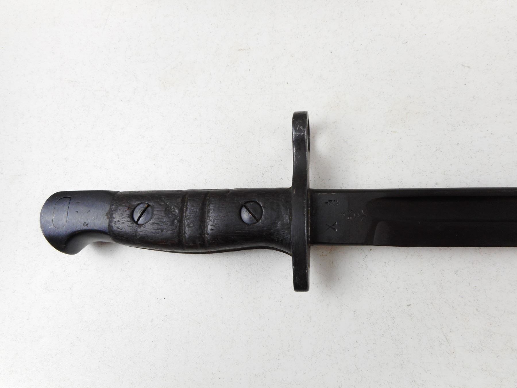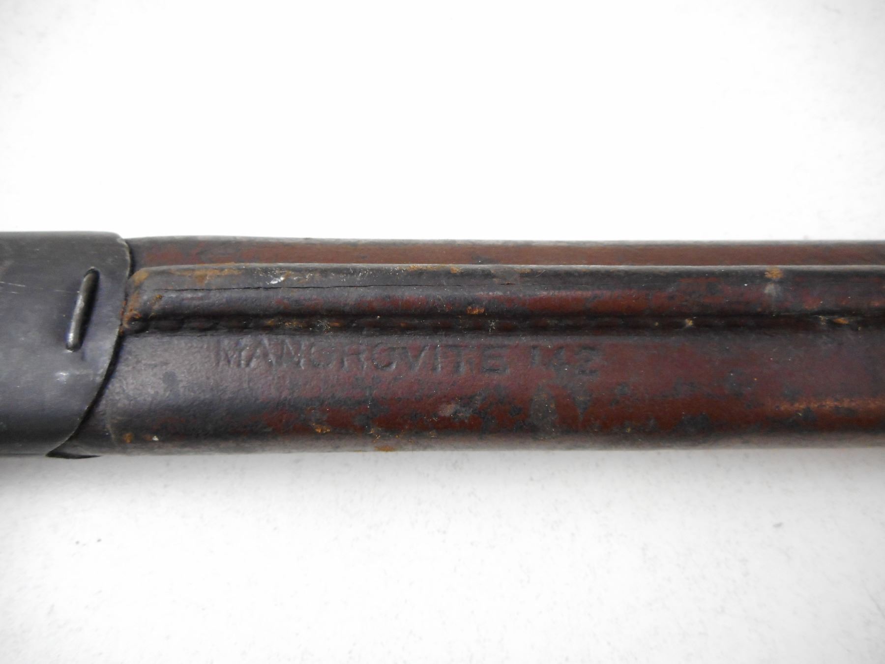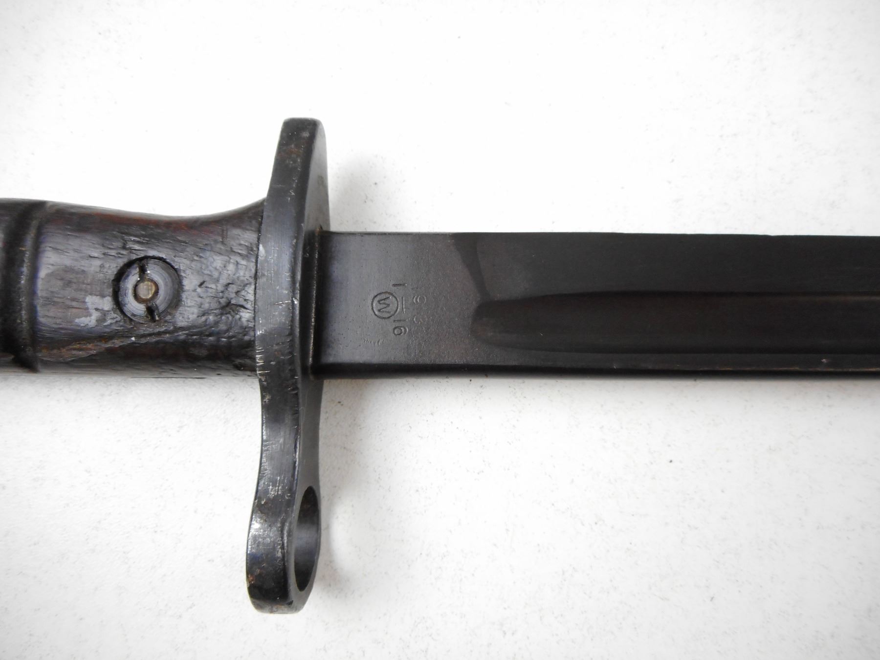 WWI ERA, WINCHESTER PATTERN 1913 PATTERN BAYONET WITH SCABBARD , RICASSO WITH ENCIRCLED W FOR WINCHESTER & BRITISH PROOF MARKS, DATED 1916, LEATHER SCABBARD MARKED MANGROVITE 142 WITH BROAD ARROW OVER B , EDGE MARKED 2ND M.D. 57115