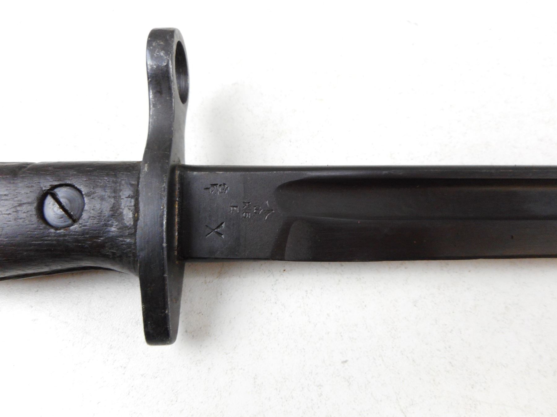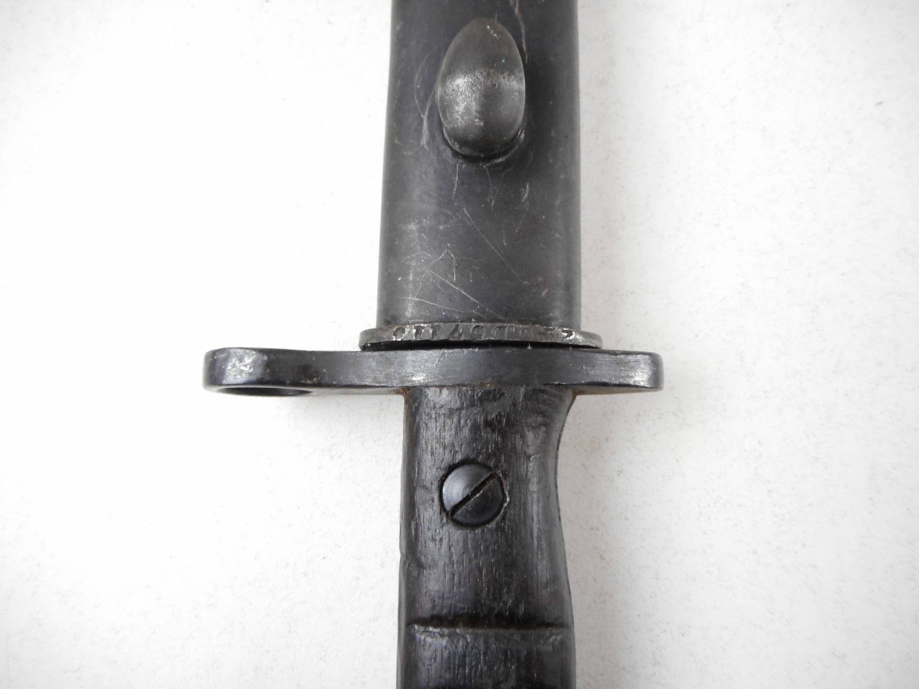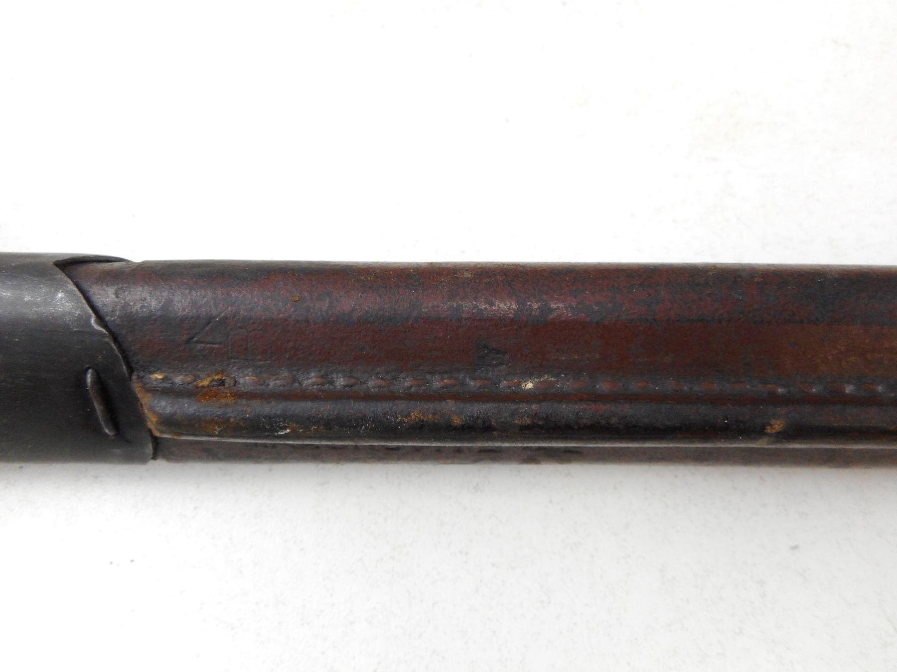 WWI ERA, WINCHESTER PATTERN 1913 PATTERN BAYONET WITH SCABBARD , RICASSO WITH ENCIRCLED W FOR WINCHESTER & BRITISH PROOF MARKS, DATED 1916, LEATHER SCABBARD MARKED MANGROVITE 142 WITH BROAD ARROW OVER B , EDGE MARKED 2ND M.D. 57115