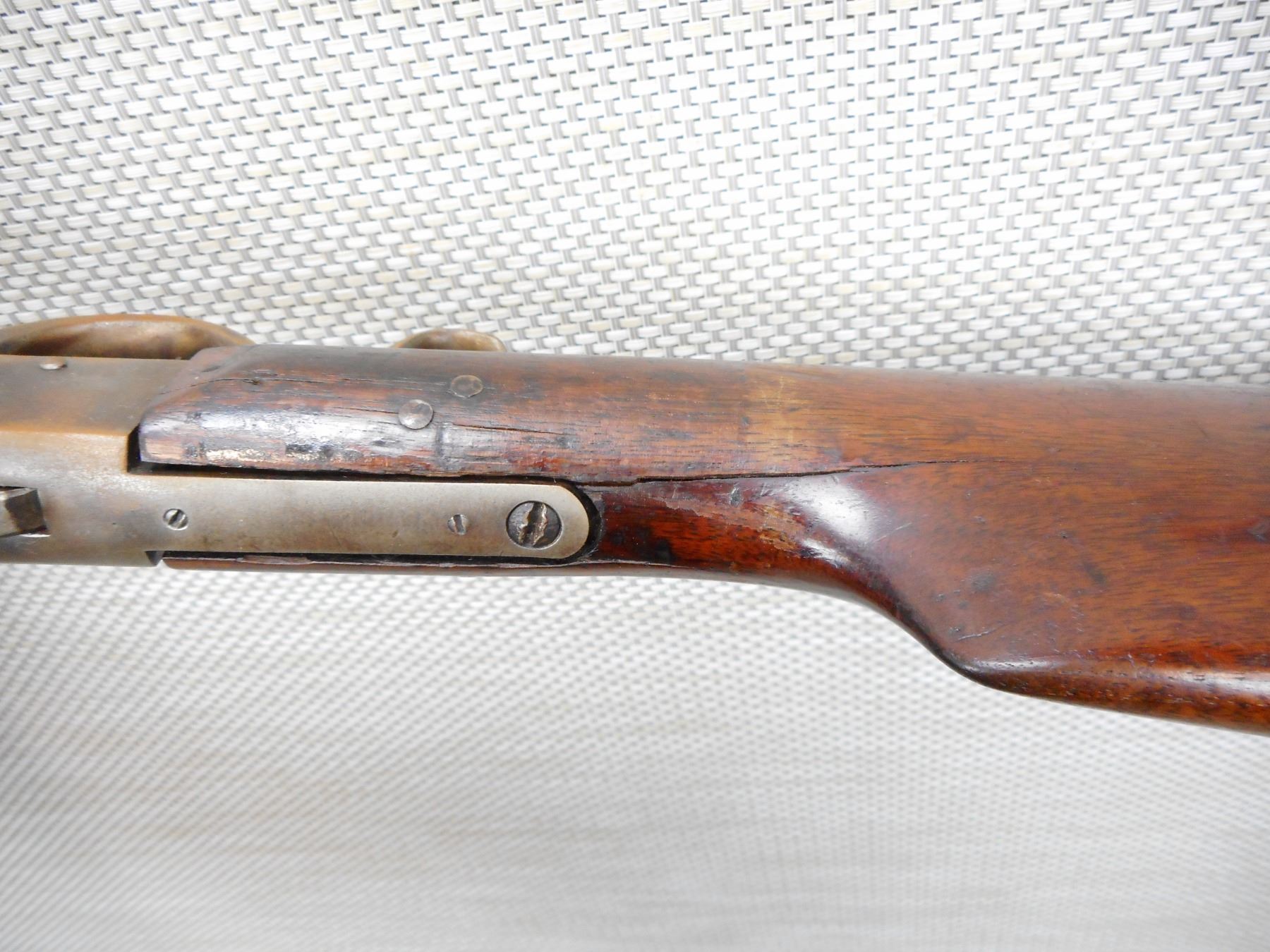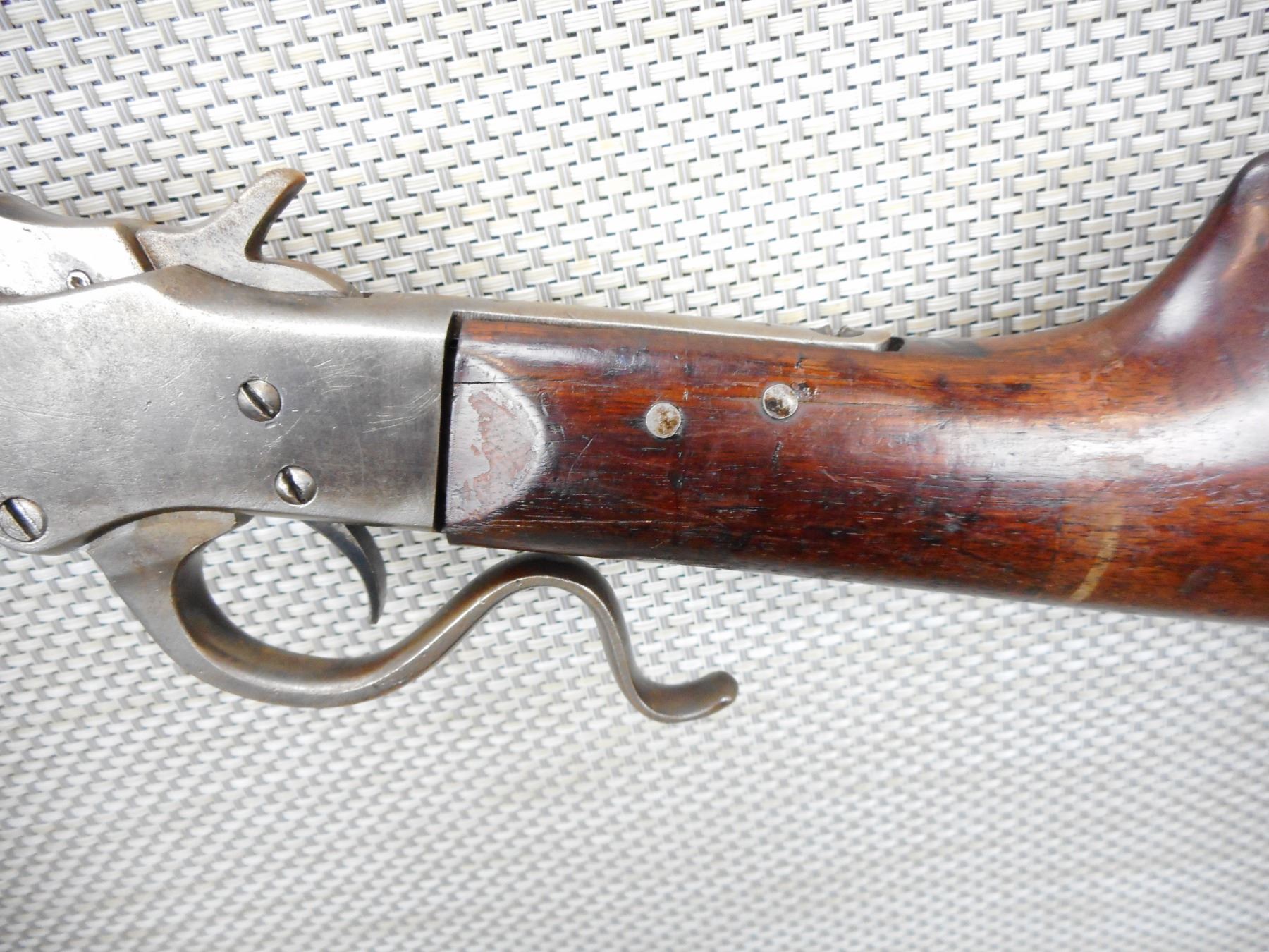 STEVENS , MODEL: MARKINGS REMOVED, BELIEVED TO BE A FAVORITE , CALIBER: 32 LONG RIM FIRE , 1/2 ROUND 1/2 OCTAGONAL BARREL, DARK BORE, BLADE FRONT AND FLIP ADJUSTABLE REAR SIGHT, STOCK IS CRACKED AND REPAIRED AT THE WRIST, REPLACED ALUMINUM BUTT PLATE, SHOWS SOME HANDLING MARKS , ACTION: SINGLE SHOT RIFLE , SERIAL # F166 , BARREL LENGTH: 22" , CONDITION: 4/10 , STOCK # 8611 , CLASS: CANADIAN NON RESTRICTED CLASS