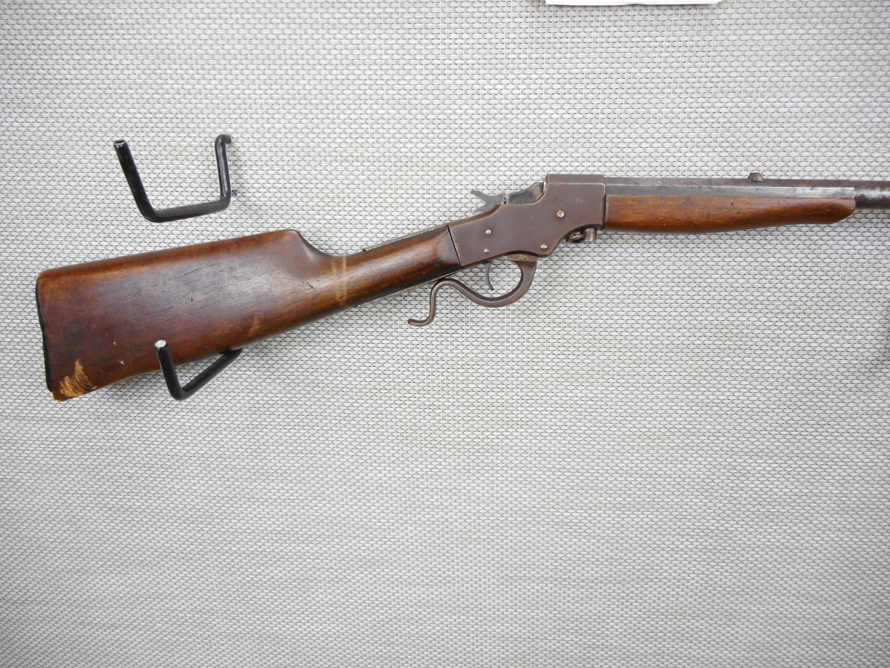STEVENS , MODEL: MARKINGS REMOVED, BELIEVED TO BE A FAVORITE , CALIBER: 25 STEVENS RIM FIRE , 1/2 ROUND 1/2 OCTAGONAL BARREL, MISSING THE FRONT SIGHT, FIXED REAR SIGHT, GOOD BORE, BROKEN HAMMER SPRING, SHOWS SOME HANDLING MARKS, BUTT STOCK HAS A LARGE CRACK AT THE TOE AND A CHIPPED AND CRACKED BUTT PLATE, SOME SCREWS ARE NON ORIGINAL , ACTION: SINGLE SHOT RIFLE , SERIAL # X644 , BARREL LENGTH: 22" , CONDITION: 3/10 , STOCK # 8612 , CLASS: CANADIAN NON RESTRICTED CLASS