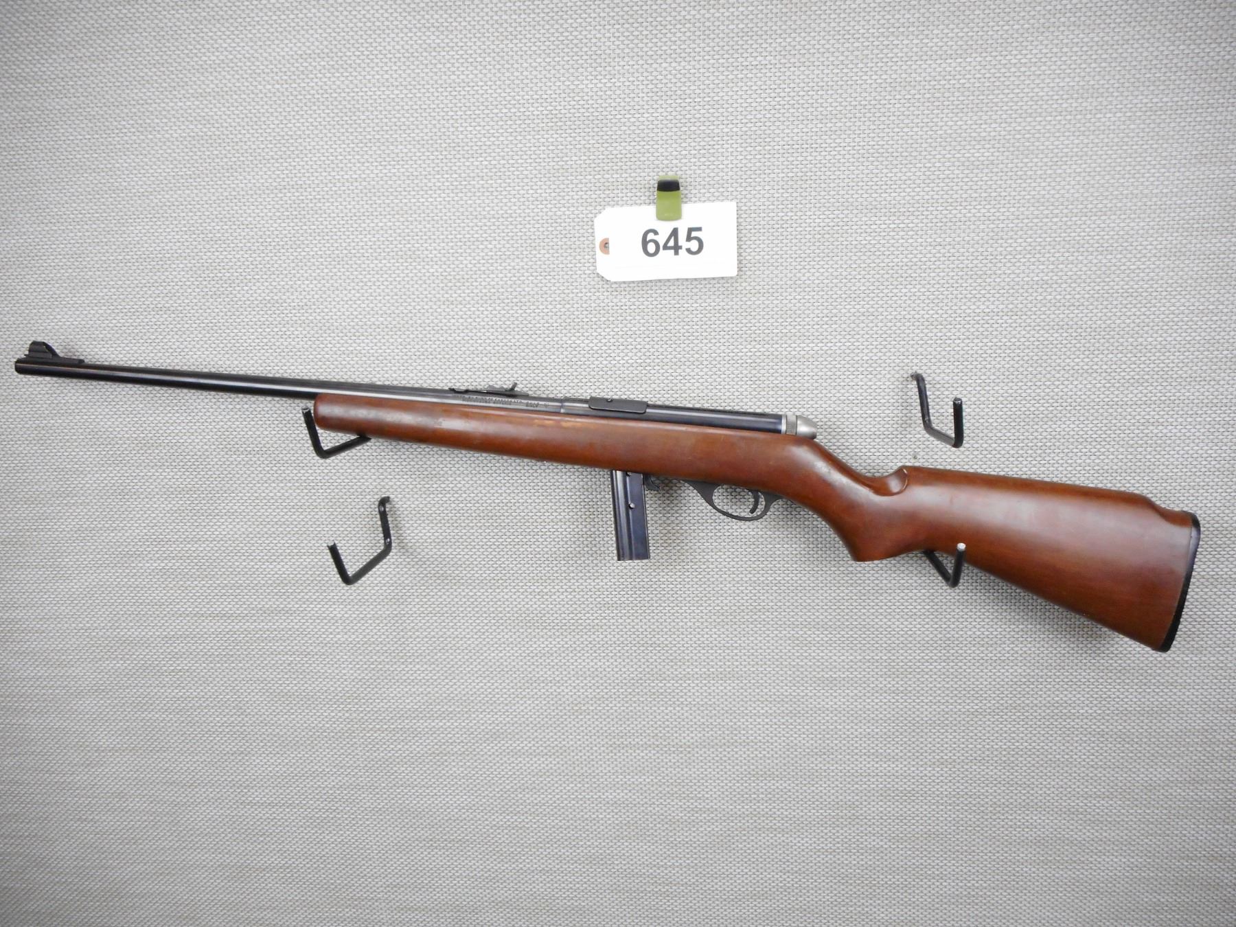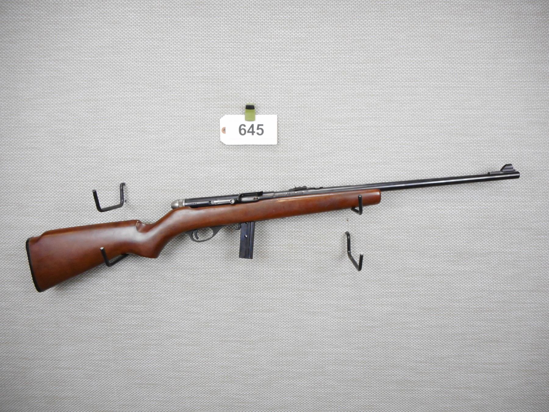 SQUIRES BINGHAM , MODEL: 20P , CALIBER: 22 LR , COMES WITH MAGAZINE, GOOD BORE, HOODED FRONT SIGHT AND ADJUSTABLE REAR SIGHTS, SHOWS SOME HANDLING MARKS, ONE PIECE MONTE CARLO STOCK WITH PLASTIC BUTT PLATE , ACTION: SEMI AUTOMATIC RIFLE , SERIAL # A580068 , BARREL LENGTH: 21" , CONDITION: 7/10 , STOCK # 8650 , CLASS: CANADIAN NON RESTRICTED CLASS