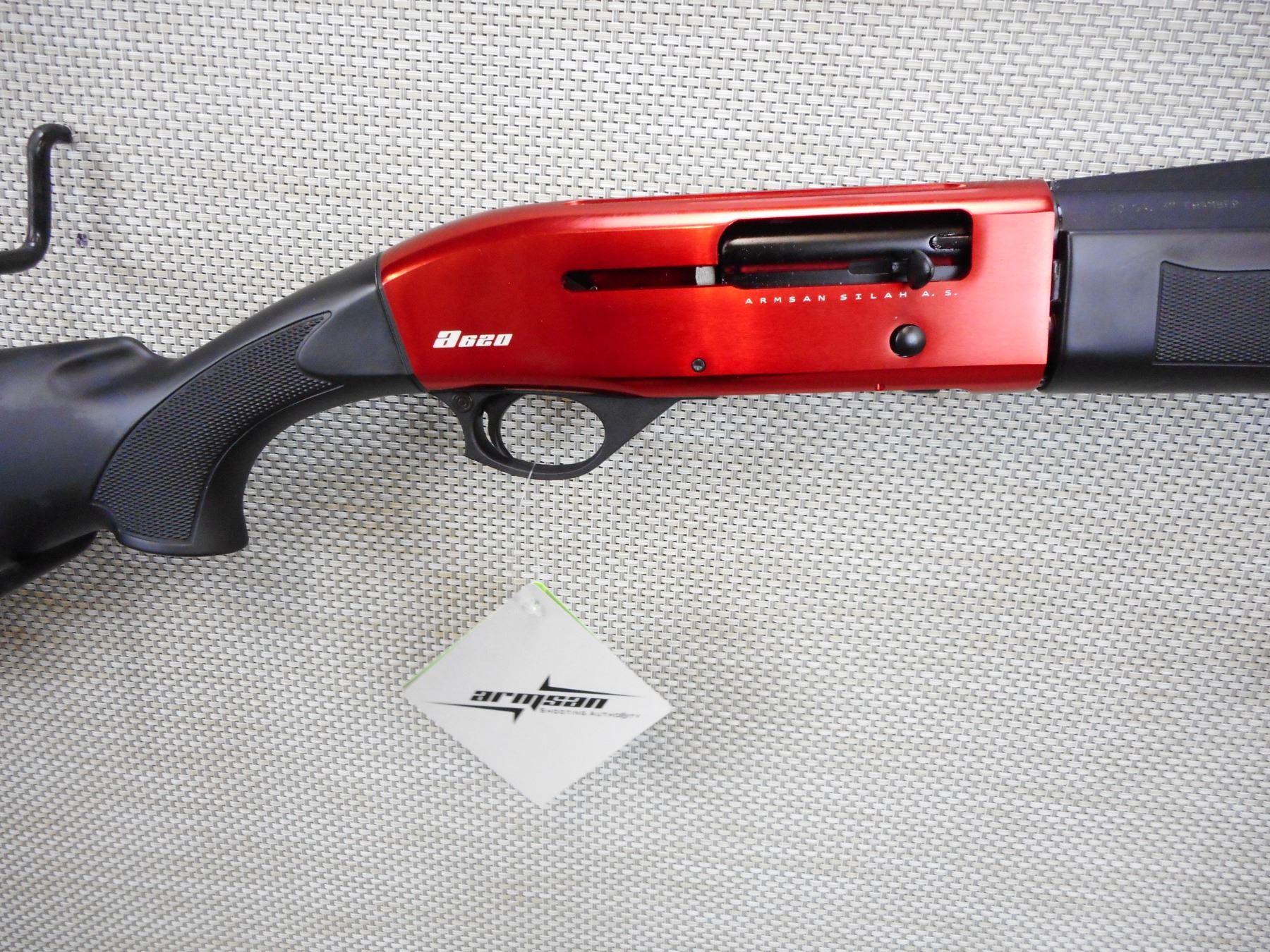 ARMSAN , MODEL: A620 RED , CALIBER: 20GA X 3" , COMES NEW IN BOX WITH REMOVABLE CHOKES , FIBER OPTIC FRONT SIGHT ON VENTED RIB BARREL, RED ANODIZED RECEIVER, BLACK SYNTHETIC STOCK WITH VENTED RUBBER RECOIL PAD, SLING SWIVEL LOOPS , ACTION: SEMI AUTOMATIC SHOTGUN , SERIAL # 17K10539 , BARREL LENGTH: 26" , CONDITION: NEW IN BOX , STOCK # 8893 , CLASS: CANADIAN NON RESTRICTED CLASS
