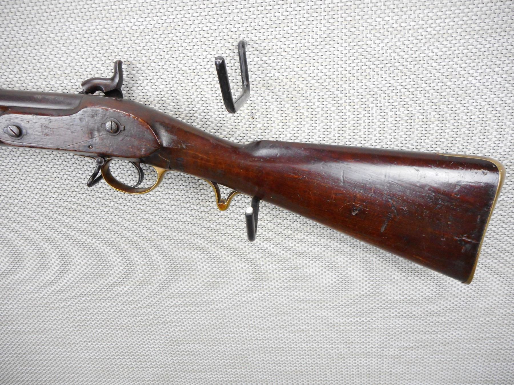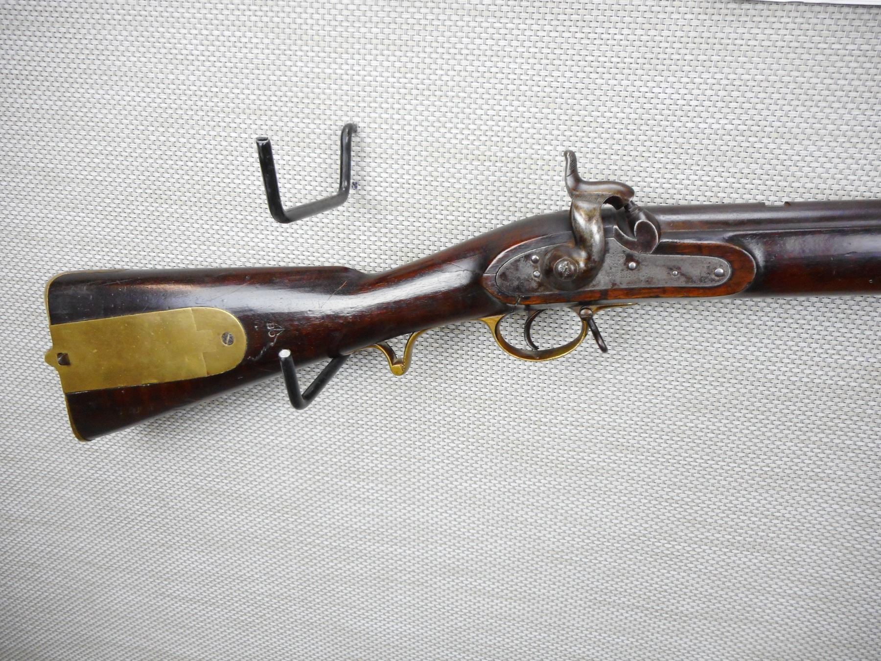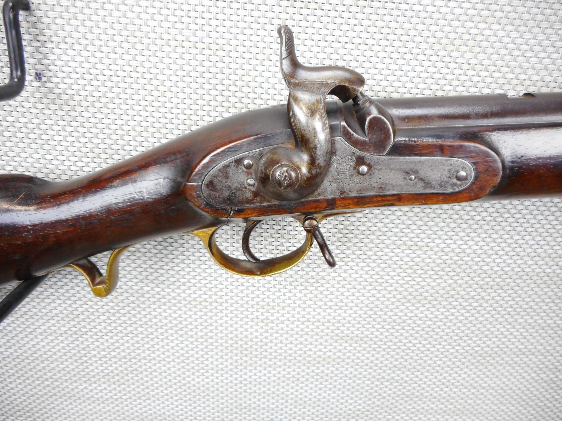 BRITISH SERVICE , MODEL: BRUNSWICK RIFLE , CALIBER: 70 CAL PERC , MANUFACTURED BY TOWER DATED 1847, PITTED BORE, NUMEROUS BRITISH PROOFS, FULL WOOD STOCK WITH A BAYONET LUG, BRASS NOSE CAP TRIGGER GUARD PATCH BOX AND BUTT PLATE, RETAINS ORGINAL CLEANING ROD AND BORE CLEANING ATTACHMENT, SLING SWIVEL LOOPS, SMALL CHIPS IN THE WOOD AROUND THE LOCK PLATE, MISSING THE REAR SIGHT, DOVETAIL FRONT SIGHT, SHOWS SOME HANDLING MARKS, ACTIONN IS TIGHT , ACTION: SINGLE SHOT PERCUSSION , SERIAL # N/A , BARREL LENGTH: 30" , CONDITION: 6/10 ANTIQUE CLASS , STOCK # , CLASS: CANADIAN ANTIQUE CLASS