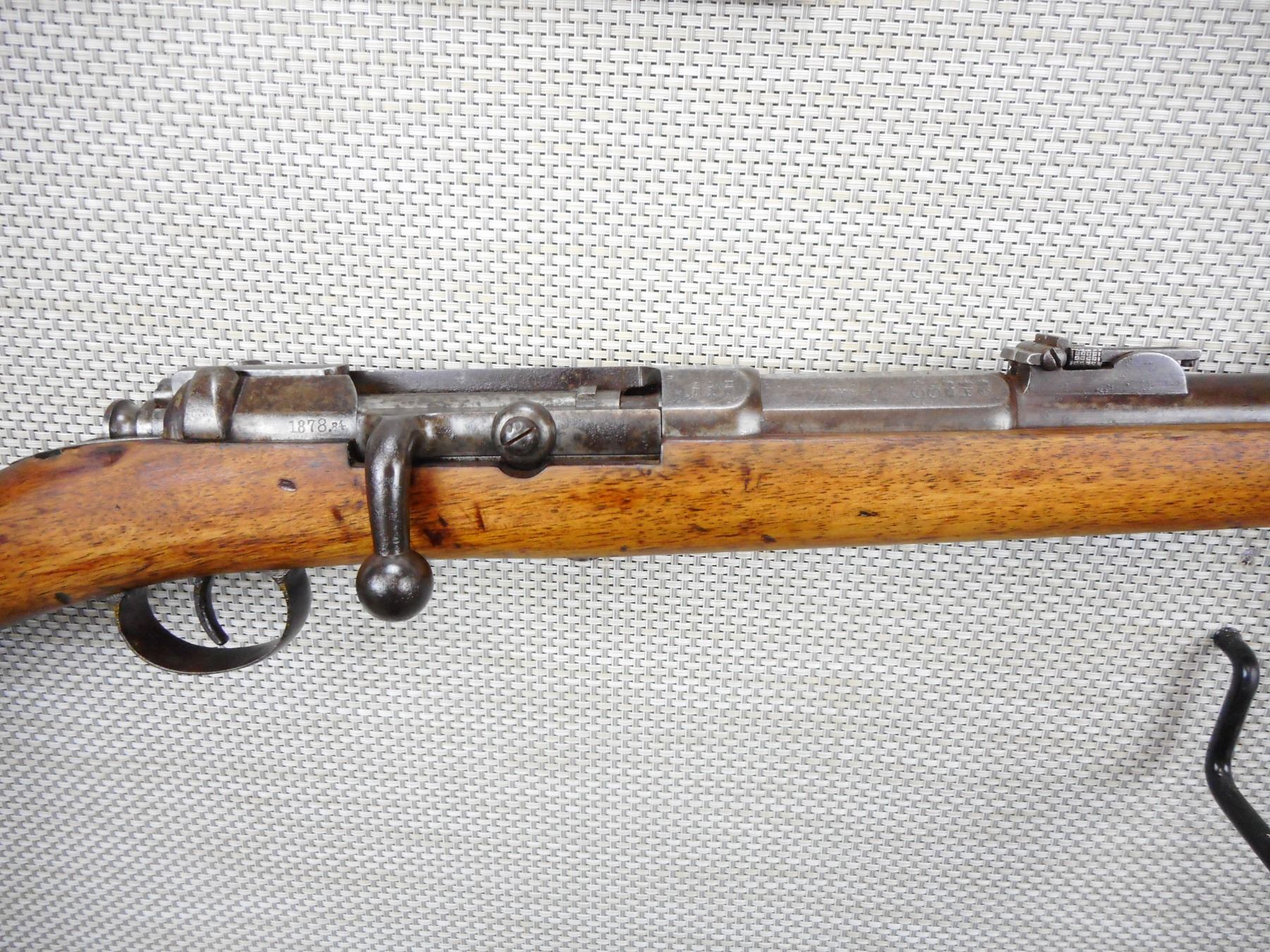 MAUSER , MODEL: 71 SPORTER , CALIBER: 43 MAUSER , MADE IN 1878, BOLT AND RECEIVER MATCH BY SERIAL #, FULL WOOD STOCK HAS BEEN SPORTERIZED, SHOWS EXTENSIVE HANDLING MARKS, BLADE FRONT AND FULLY ADJUSTABLE REAR SIGHT, RETAINS ORIGINAL MILITARY SLING SWIVELS, STEEL BUTT PLATE , ACTION: SINGLE SHOT BOLT ACTION RIFLE , SERIAL # 3360 , BARREL LENGTH: 20" , CONDITION: 5/10 ANTIQUE , STOCK # , CLASS: CANADIAN ANTIQUE CLASS