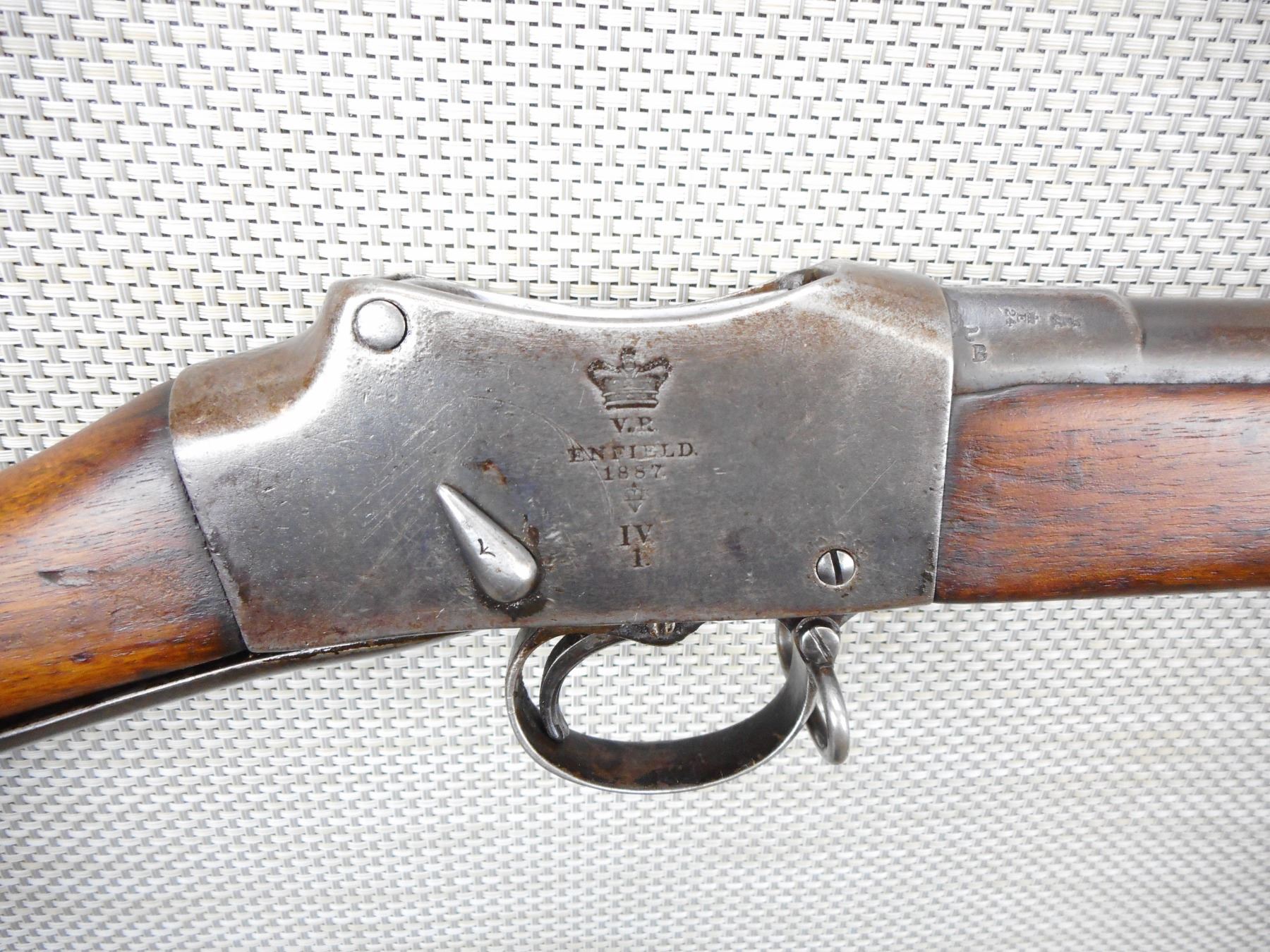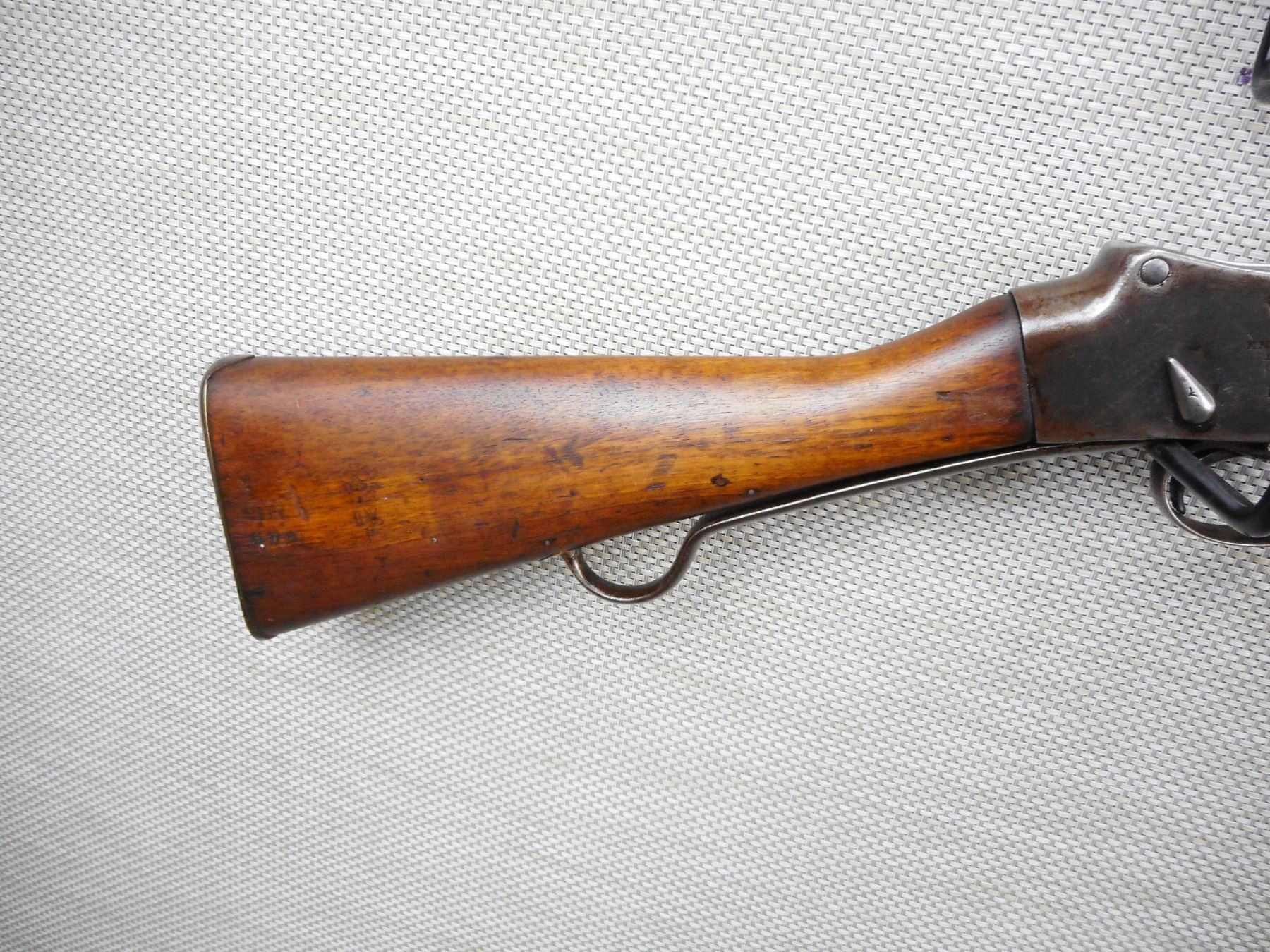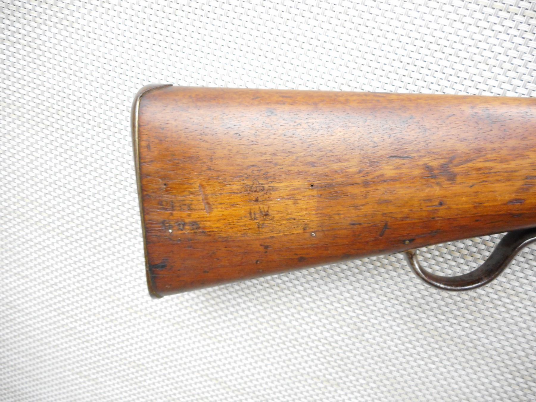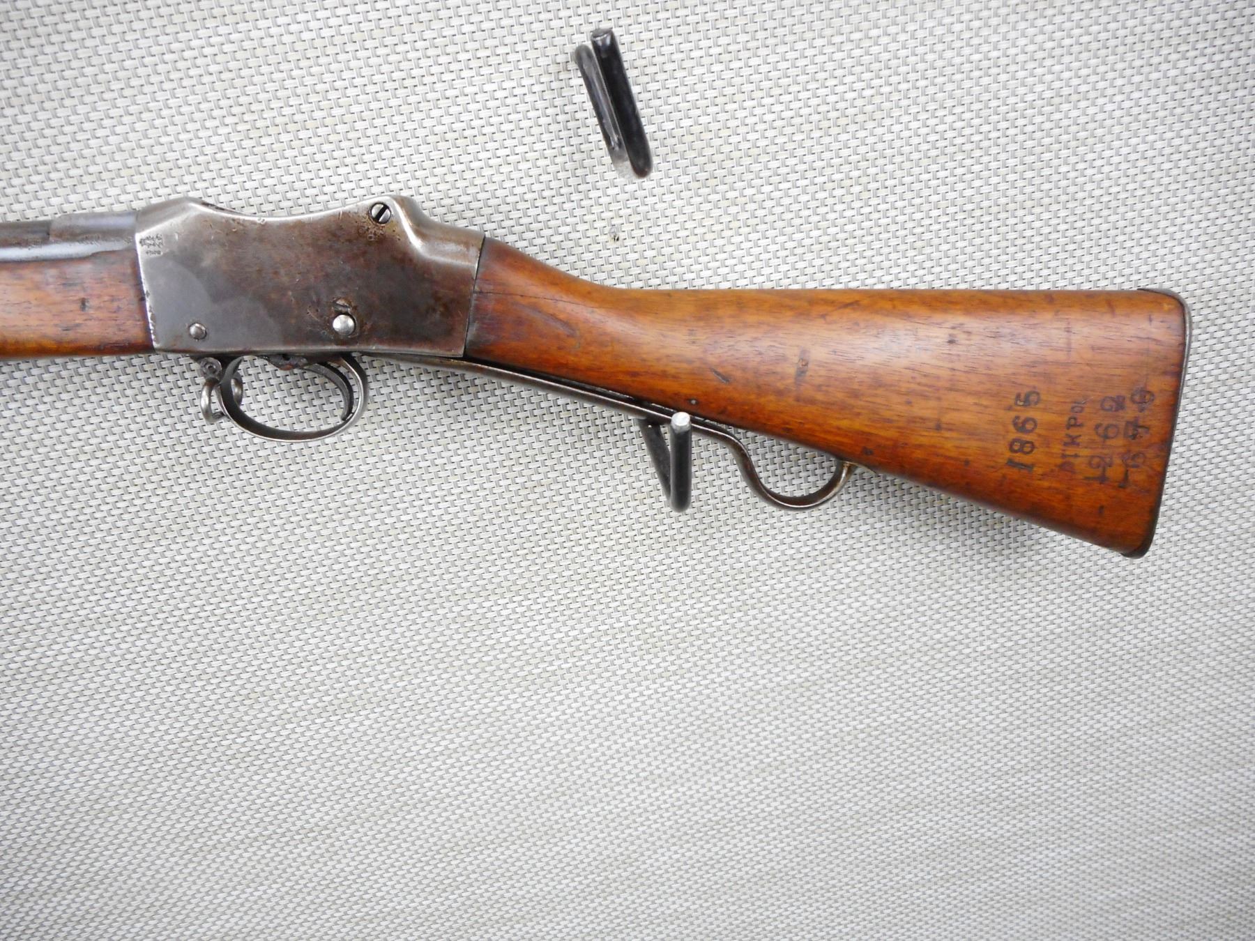 MARTINI ENFIELD , MODEL: MKIV , CALIBER: 577-450 , DATED 1887 LONG LEVER VERSION, BORE IS GOOD, BLADE FRONT AND ADJUSTABLE REAR SIGHTS, TWO PIECE HARDWOOD STOCK THAT IS RICHLEY REGIMENTALLY MARKED, STEEL BUTT PLATE, SHOWS SOME HANDLING MARKS, SLING SWIVEL LOOPS, SOME ACTION SCREWS ARE BADLY MARRED , ACTION: FALLING BLOCK MARTINI SINGLE SHOT , SERIAL # 966 , BARREL LENGTH: 33" , CONDITION: 6/10 ANTIQUE CLASS , STOCK # , CLASS: CANADIAN ANTIQUE CLASS