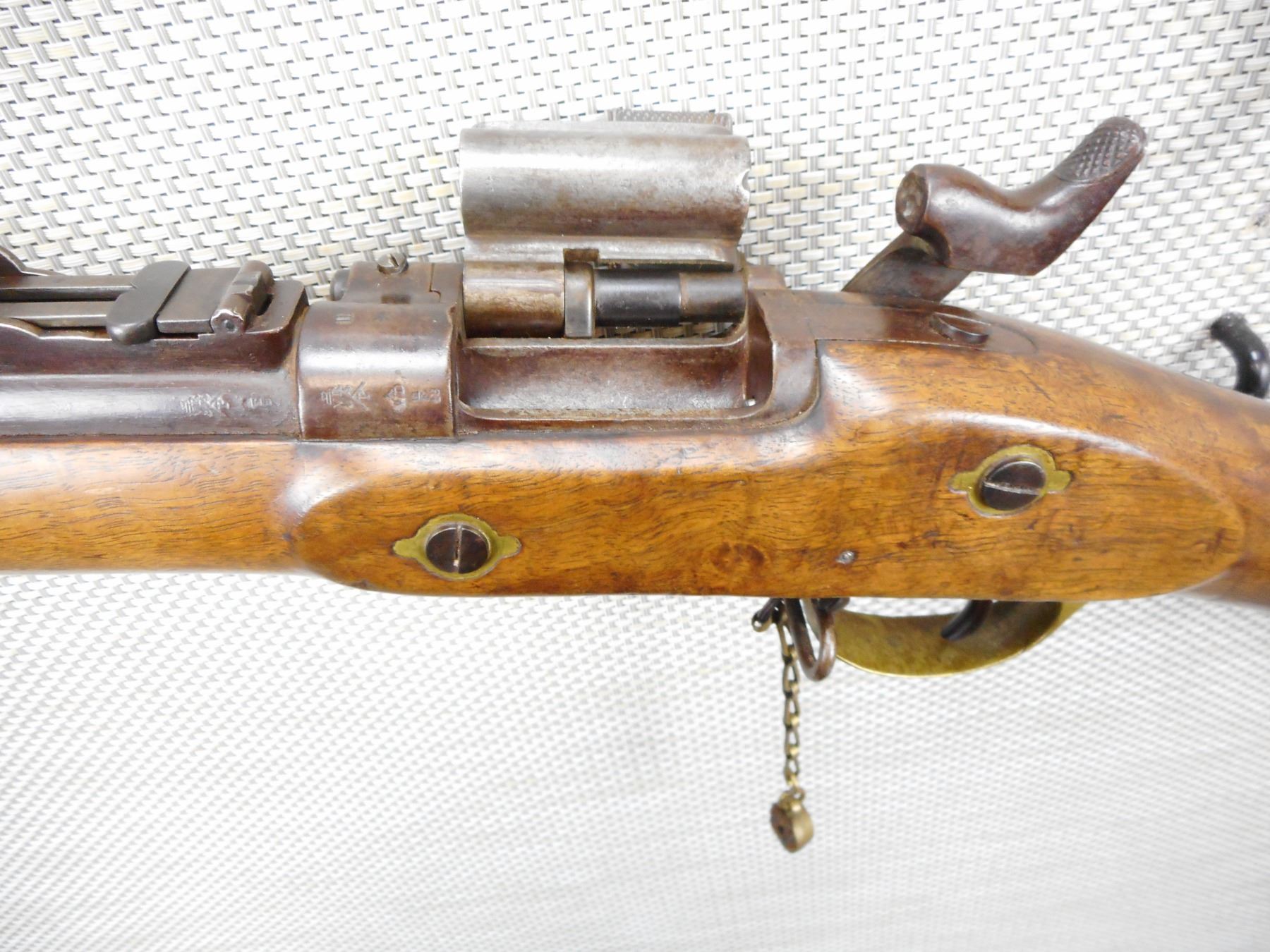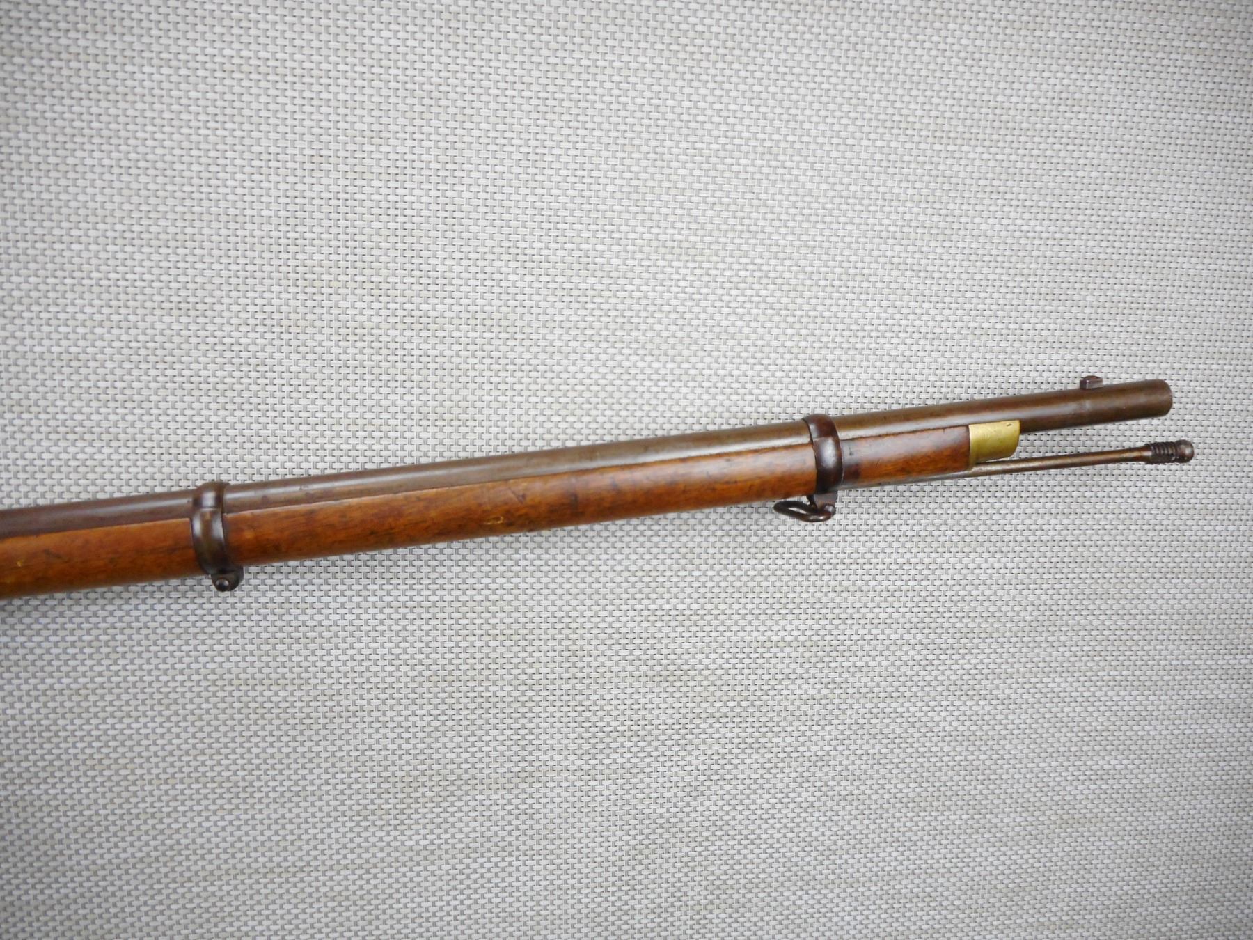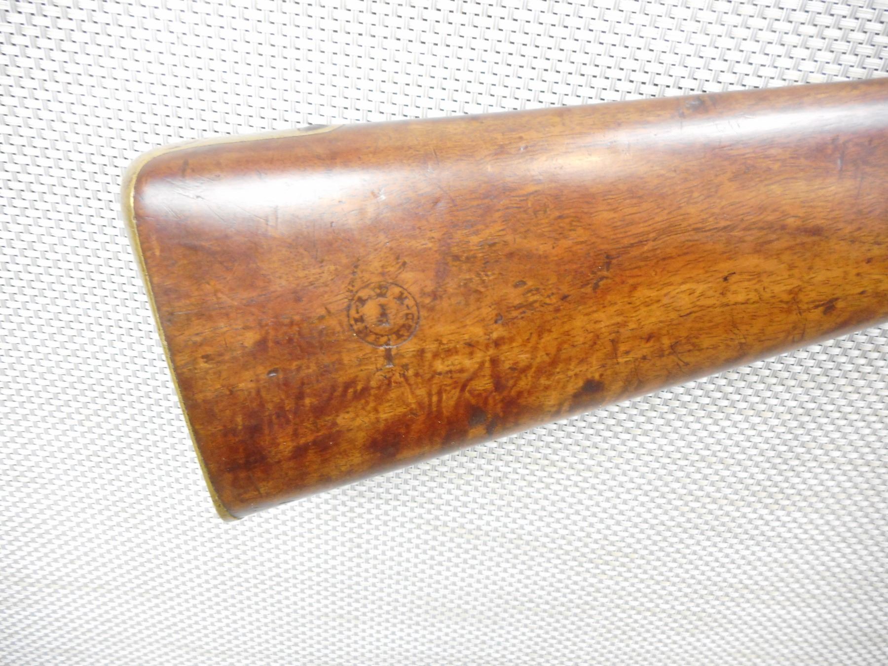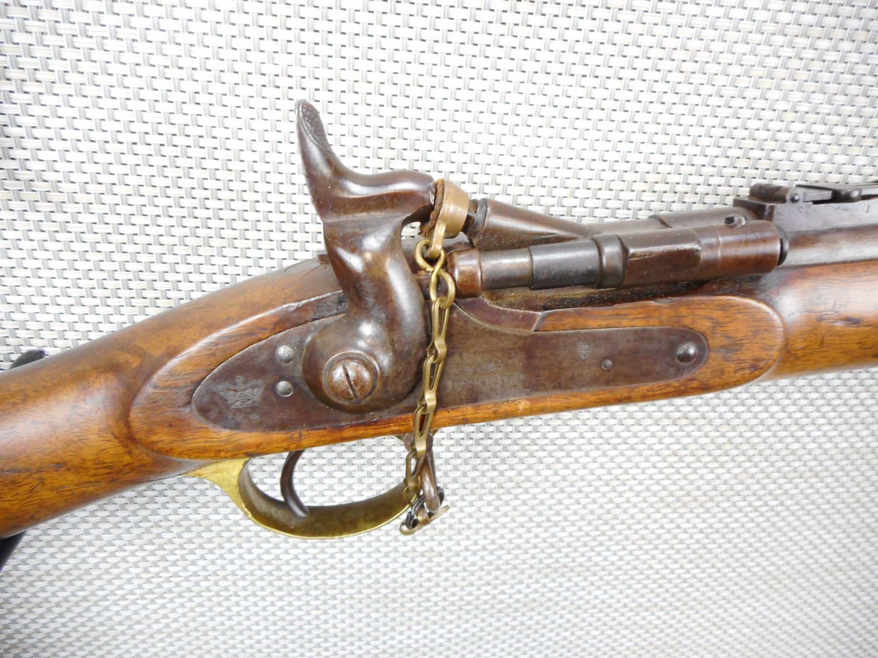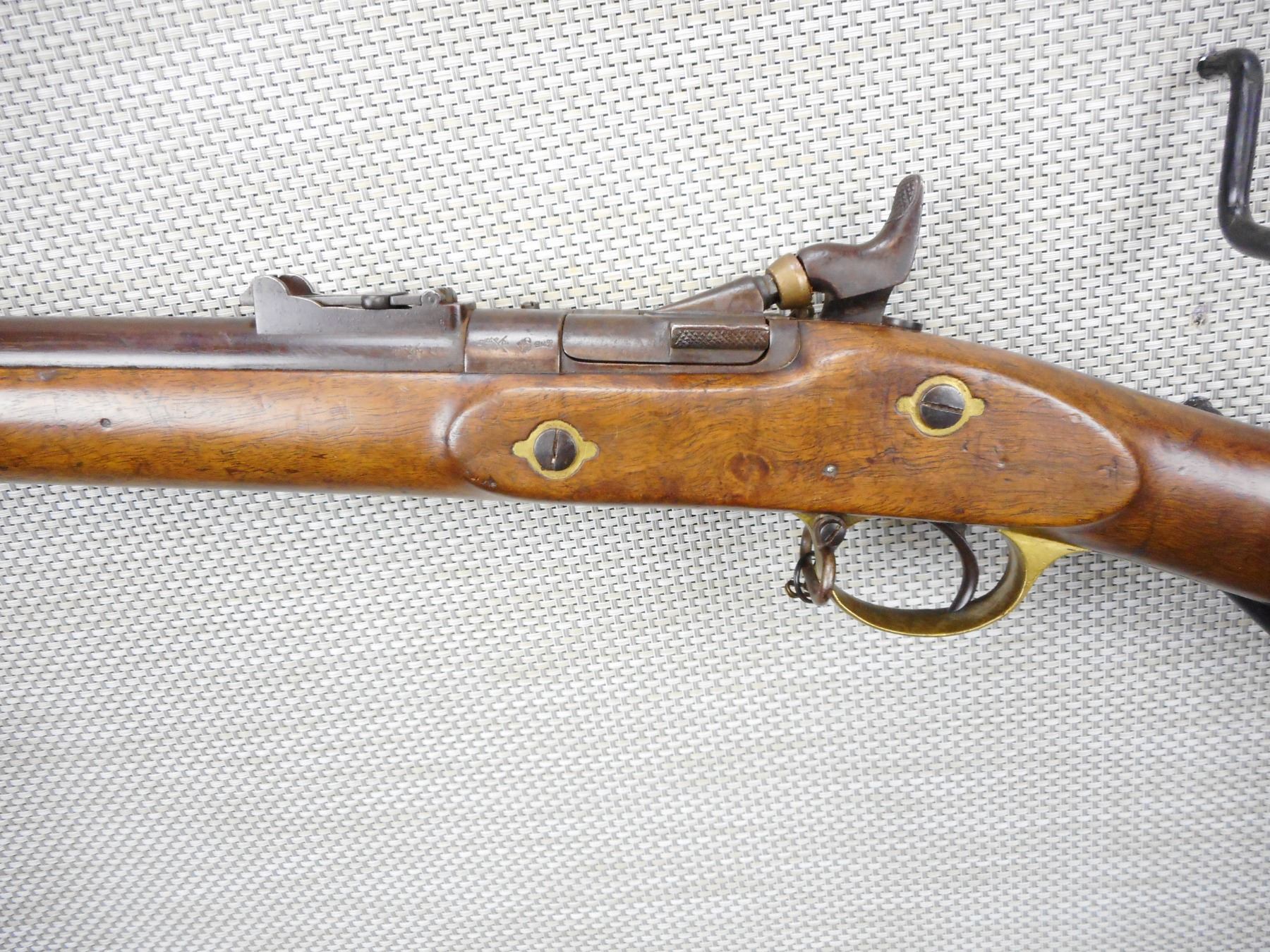SNIDER ENFIELD , MODEL: III BAND MKII* , CALIBER: 577 SNIDER , DATED 1857, BLADE FRONT AND ADJUSTABLE REAR SIGHTS, RETAINS ORIGINAL NIPPLE PROTECTOR AND CHAIN, BORE IS VERY GOOD, ORIGINAL CLEANING ROD, BRASS TRIGGER GUARD AND BUTT PLATE, SHOWS SOME HANDLING MARKS , ACTION: SINGLE SHOT PERCUSSION , SERIAL # 7629 , BARREL LENGTH: 39" , CONDITION: 6/10 ANTIQUE CLASS , STOCK # , CLASS: CANADIAN ANTIQUE CLASS