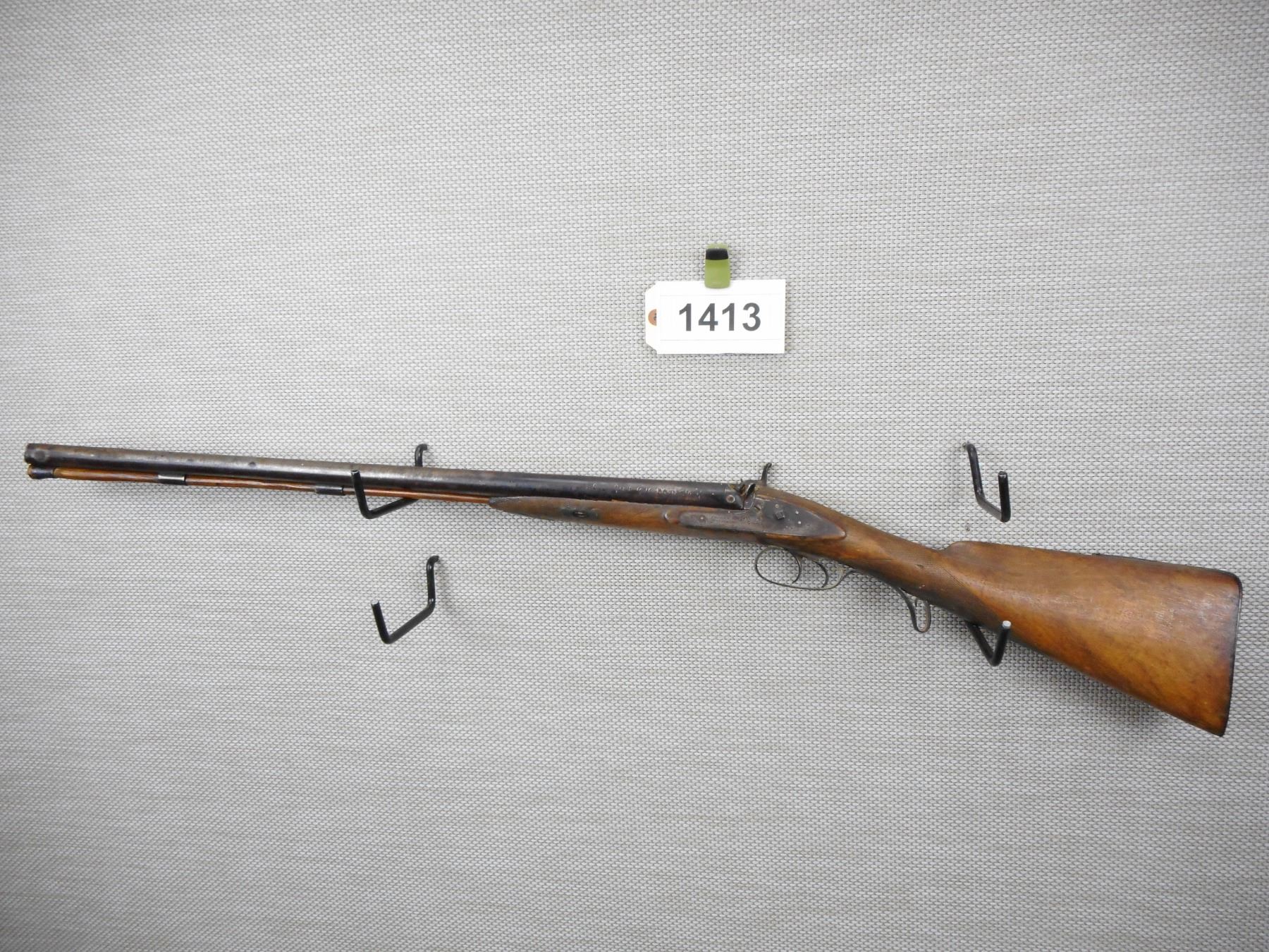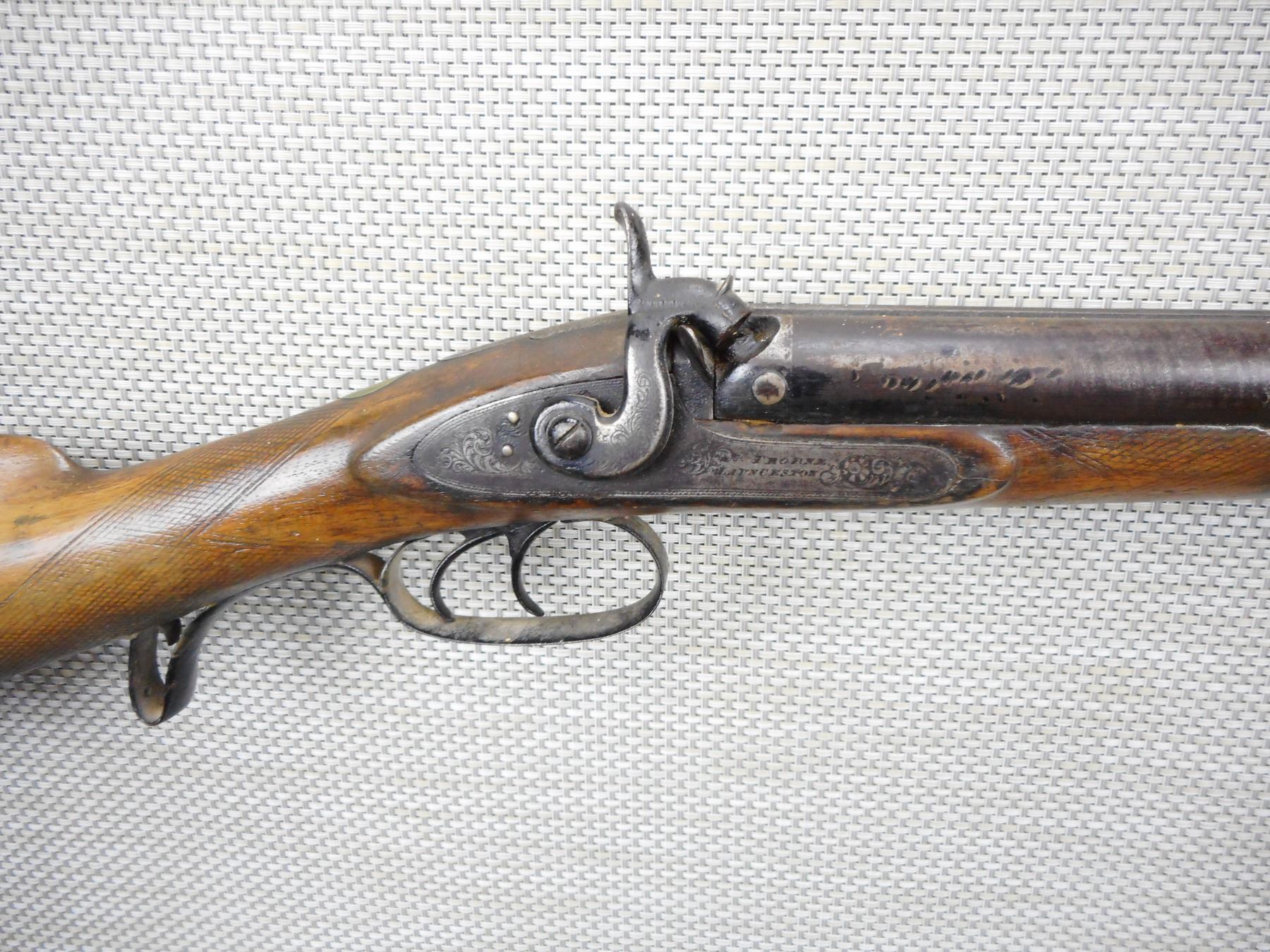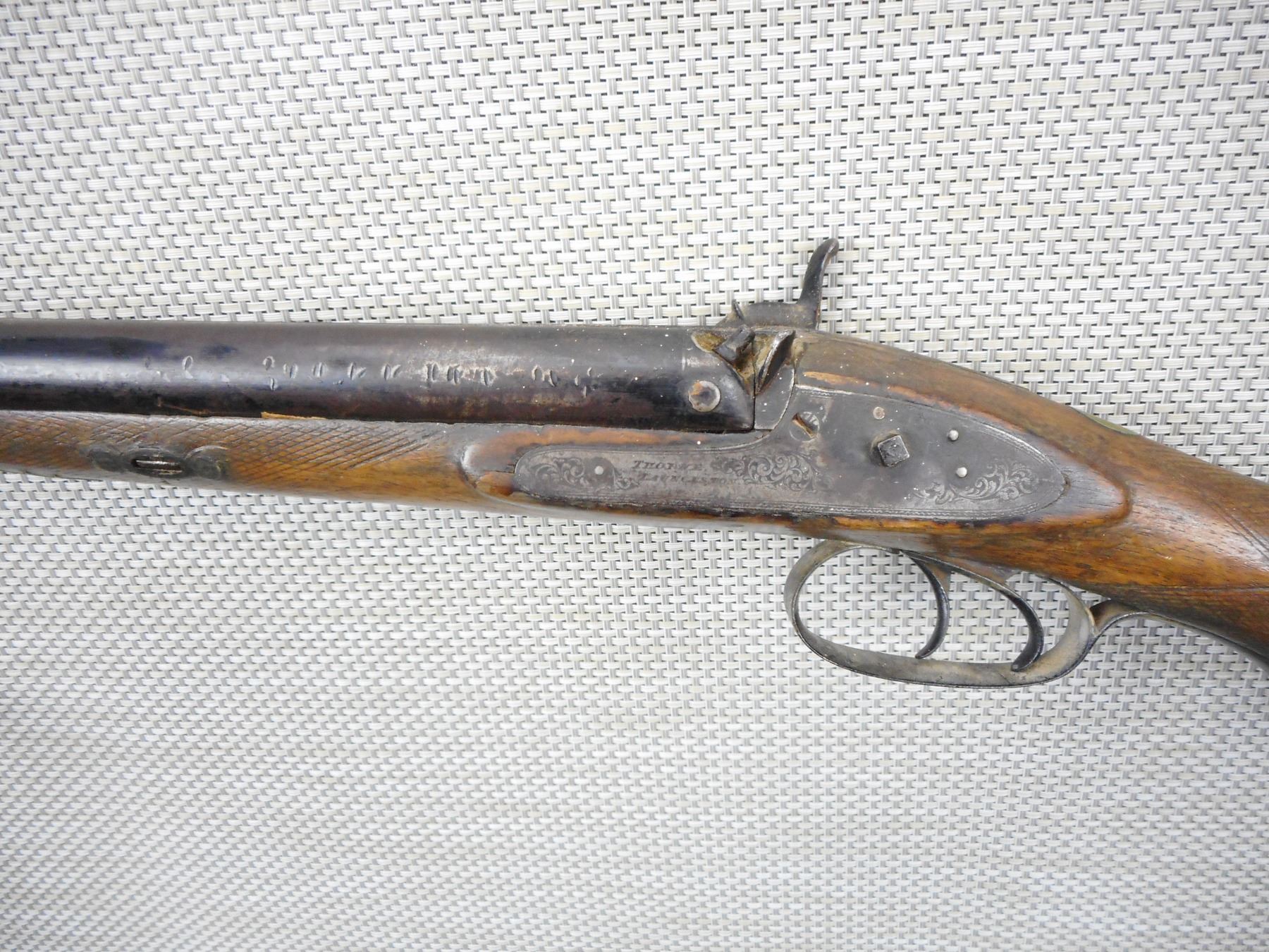 THORNE , MODEL: LAUNCESTON , CALIBER: 12 BORE , MADE IN LAUNCESTON, BORES ARE PITTED, BARRELS ARE DENTED ALL OVER, MISSING THE LEFTT HAMMER, RIGHT HAMMER DOES NOT HOLD IN THE COCKED POSITION, DOUBLE TRIGGERS, FINGER GRIP TRIGGER GUARD, HAS ORIGINAL WOOD RAM ROD, FLATTENED FRONT BEAD SIGHT, ENGRAVED SIDE LOCKS, CHECKERED STRAIGHT GRIP STOCK, STEEL BUTT PLATE, SHOWS EXTENSIVE HANDLING MARKS AND POSSIBLY SOME PREVIOUSLY PAINTED PARTS , ACTION: SIDE BY SIDE PERCUSSION SHOTGUN , SERIAL # N/A , BARREL LENGTH: 26" , CONDITION: 3/10 ANTIQUE , STOCK # , CLASS: CANADIAN ANTIQUE CLASS