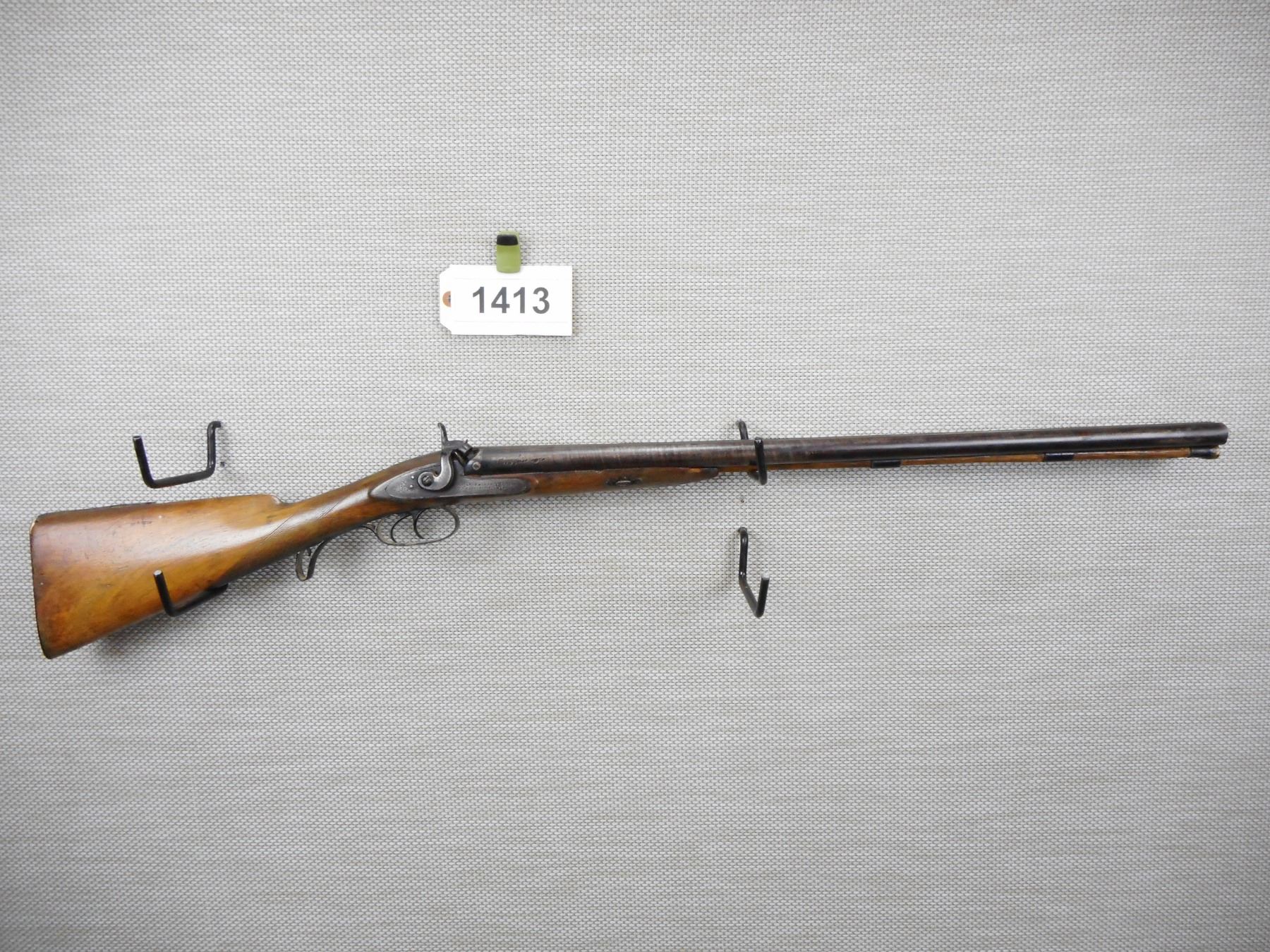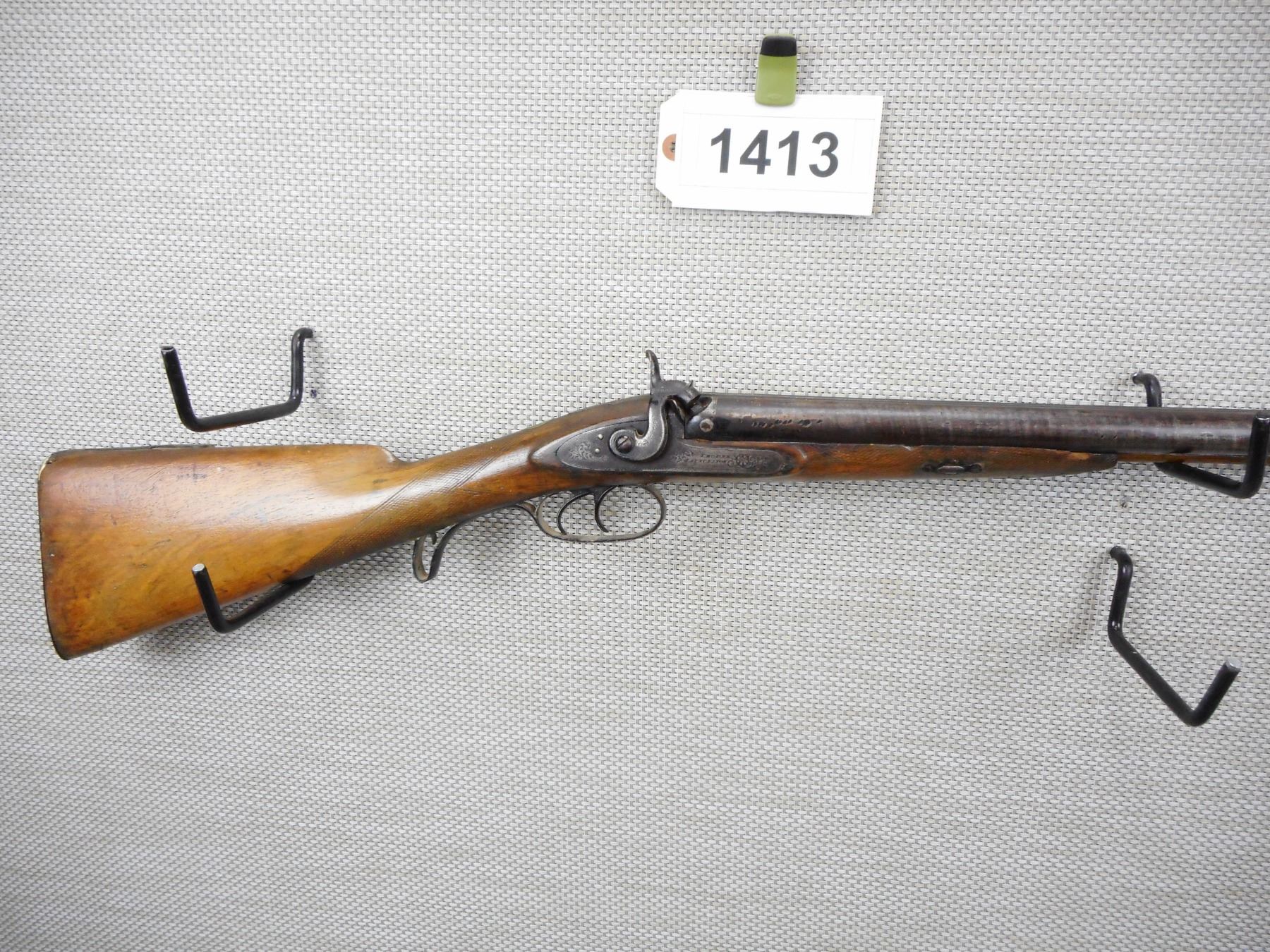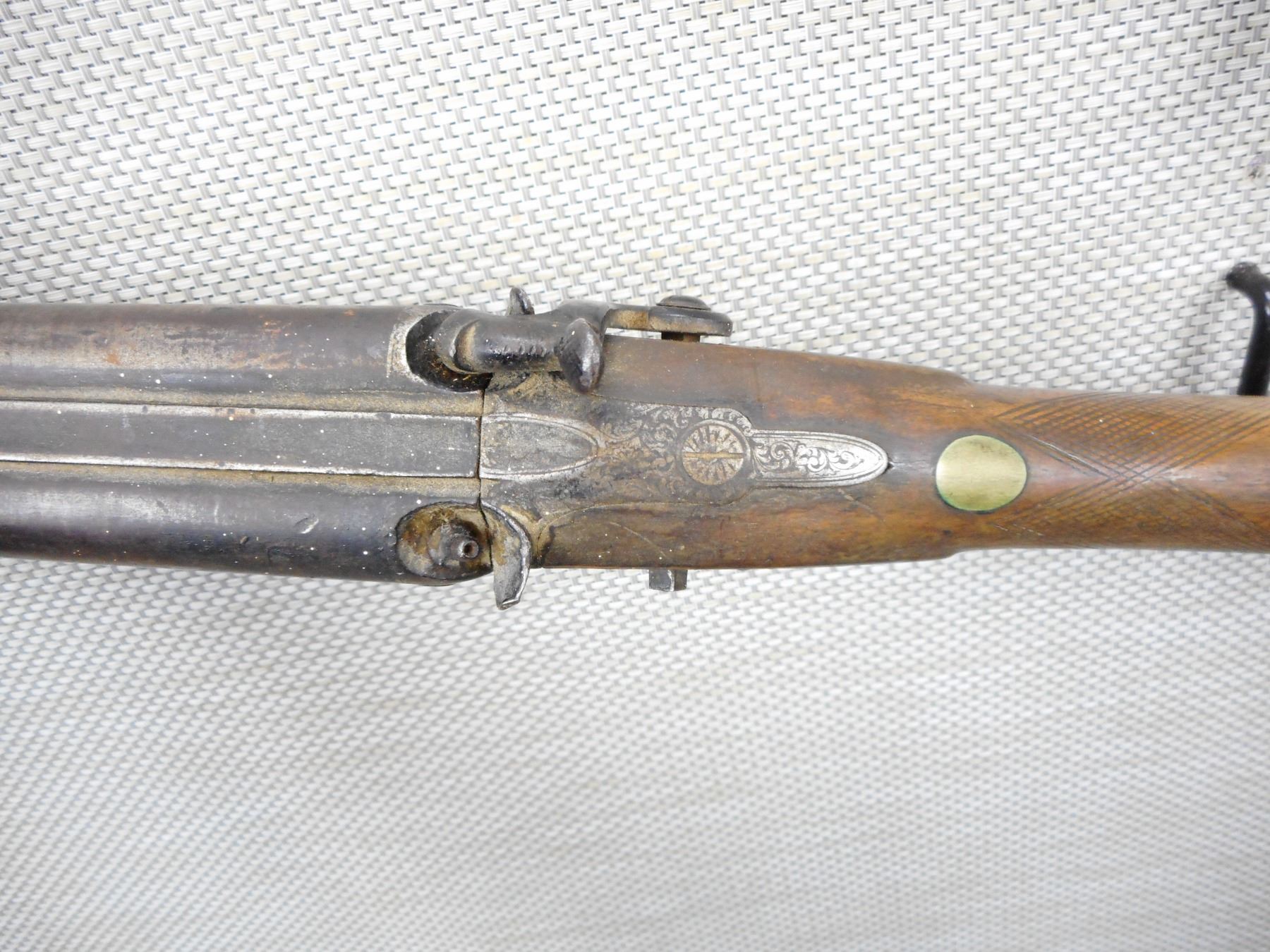 THORNE , MODEL: LAUNCESTON , CALIBER: 12 BORE , MADE IN LAUNCESTON, BORES ARE PITTED, BARRELS ARE DENTED ALL OVER, MISSING THE LEFTT HAMMER, RIGHT HAMMER DOES NOT HOLD IN THE COCKED POSITION, DOUBLE TRIGGERS, FINGER GRIP TRIGGER GUARD, HAS ORIGINAL WOOD RAM ROD, FLATTENED FRONT BEAD SIGHT, ENGRAVED SIDE LOCKS, CHECKERED STRAIGHT GRIP STOCK, STEEL BUTT PLATE, SHOWS EXTENSIVE HANDLING MARKS AND POSSIBLY SOME PREVIOUSLY PAINTED PARTS , ACTION: SIDE BY SIDE PERCUSSION SHOTGUN , SERIAL # N/A , BARREL LENGTH: 26" , CONDITION: 3/10 ANTIQUE , STOCK # , CLASS: CANADIAN ANTIQUE CLASS