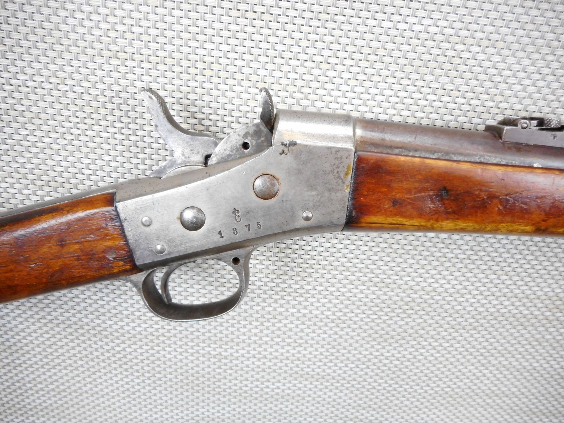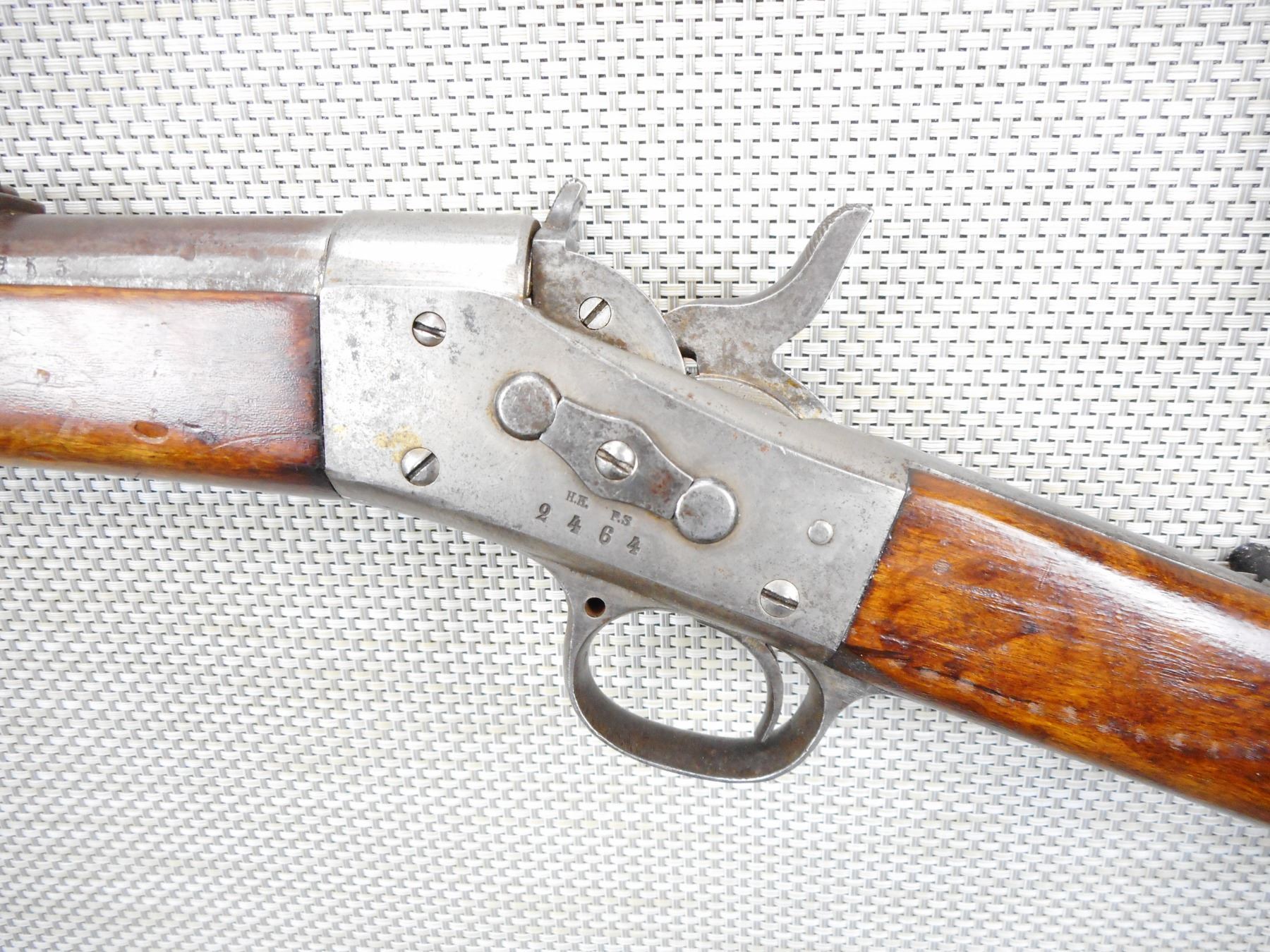 REMINGTON , MODEL: ROLLING BLOCK , CALIBER: 12.17 x 44 rim fire or 50 Swedish/Norwegian, DATED 1875, BORE IS VERY GOOD, BLADE FRONT AND ADJUSTABLE REAR SIGHTS, ACTION IS TIGHT, SLING SWIVEL LOOPS, STEEL BUTT PLATE, SHOWS SOME HANDLING MARKS , ACTION: ROLLING BLOCK , SERIAL # 2464 , BARREL LENGTH: 33" , CONDITION: 5/10 ANTIQUE , STOCK # , CLASS: CANADIAN ANTIQUE CLASS