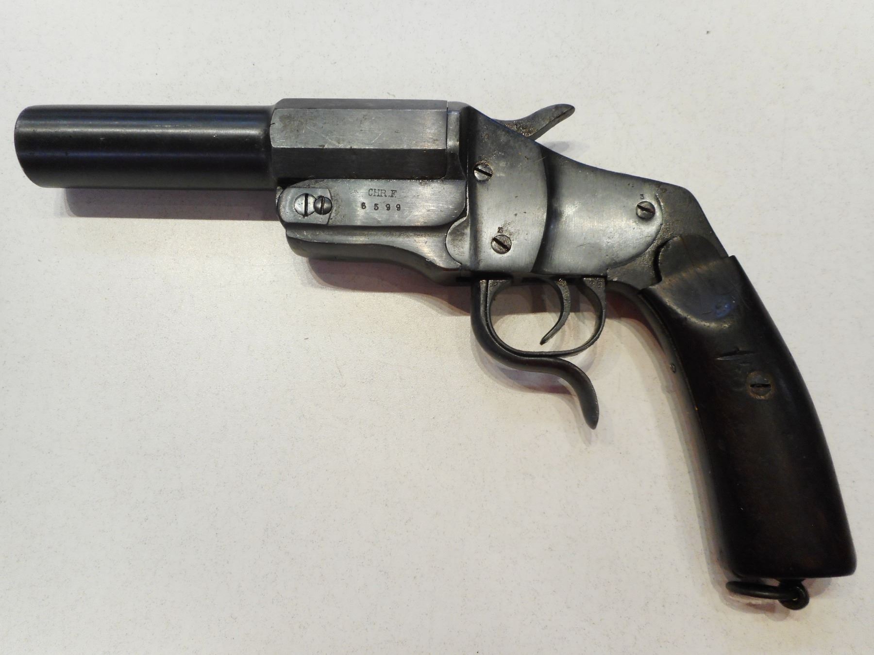 FLARE GUN, GERMAN MOD 1894 HEBEL, MAKER CHRISTIAN FUNK , MODEL: , CALIBER: N/A , 6" BBL, CAL 4 , 26.5MM , SERIAL # 6599 , NON FIREARM