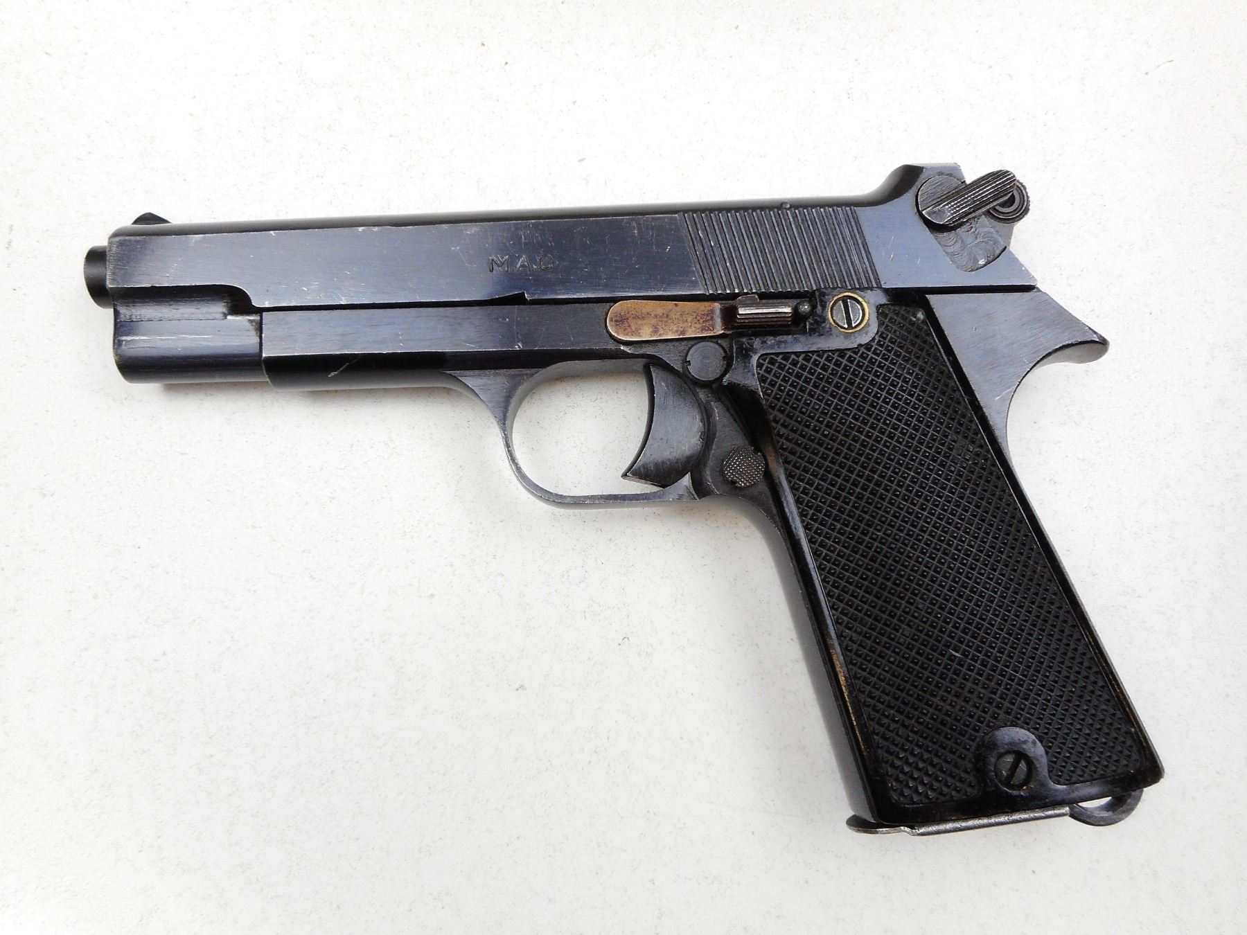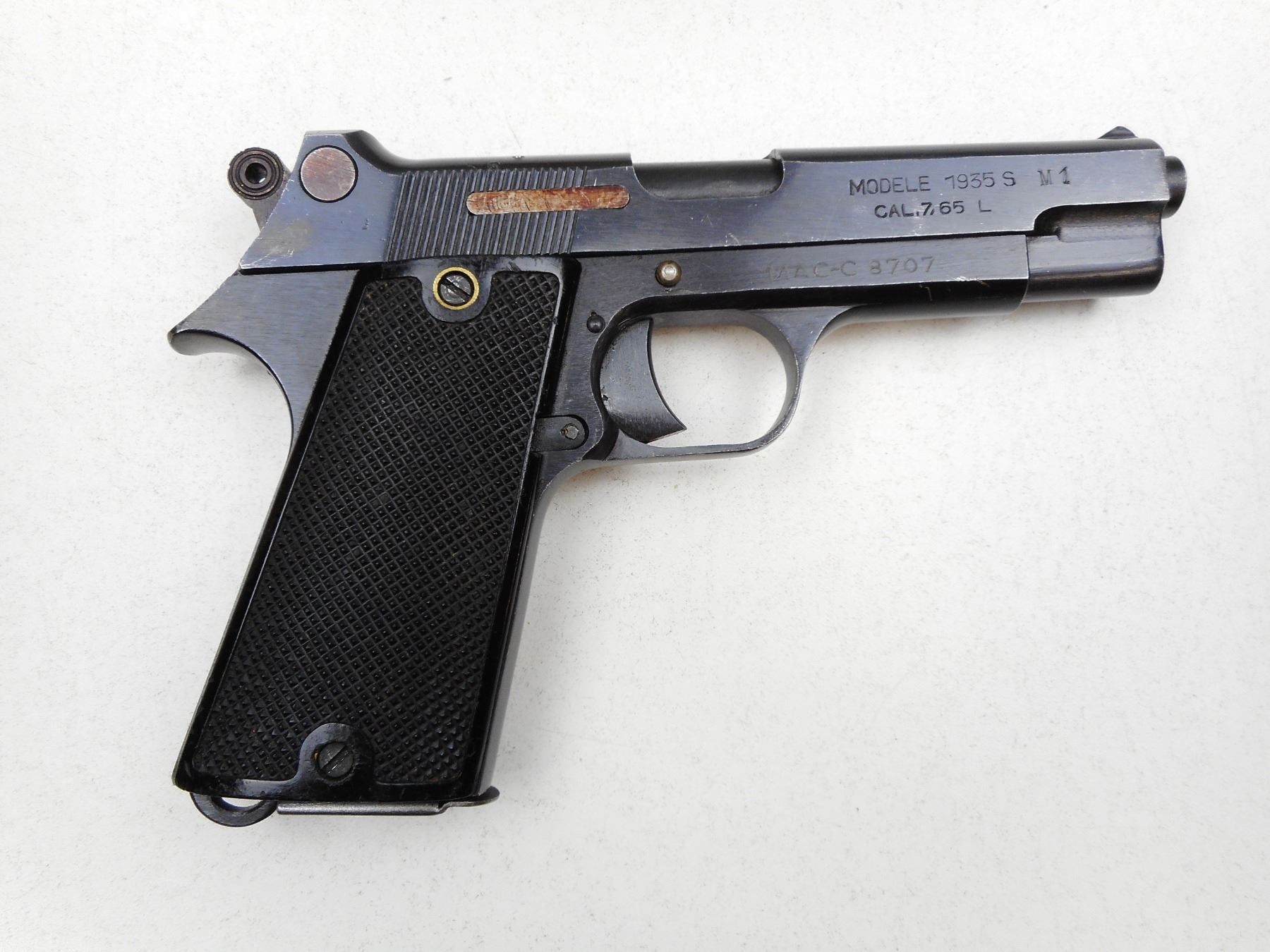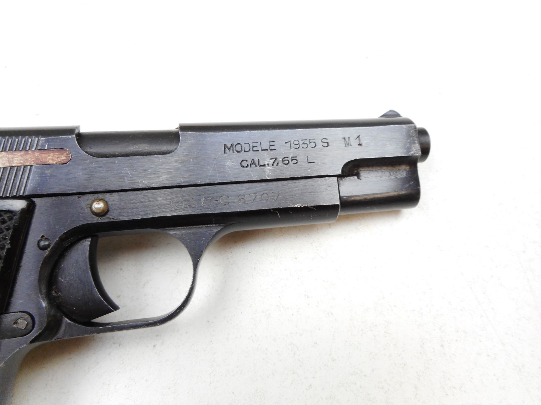 MAC (MANUFACTURE NATIONALE D'ARMES DE-CHATELLERAULT) , 1935S , 7.65MM FRENCH LONG , COMES WITH MAGAZINE, BORE IS GOOD, NOTCH AND BLADE SIGHTS, HARD RUBBER CHECKERED GRIPS, LANYARD LOOP, BLUE FINISH OVERALL , BARREL LENGTH: 106MM , ACTION: SEMI-AUTOMATIC , STOCK # 2821 , SERIAL # C8707 , CONDITION: 6/10 , CLASS: CANADIAN RESTRICTED CLASS