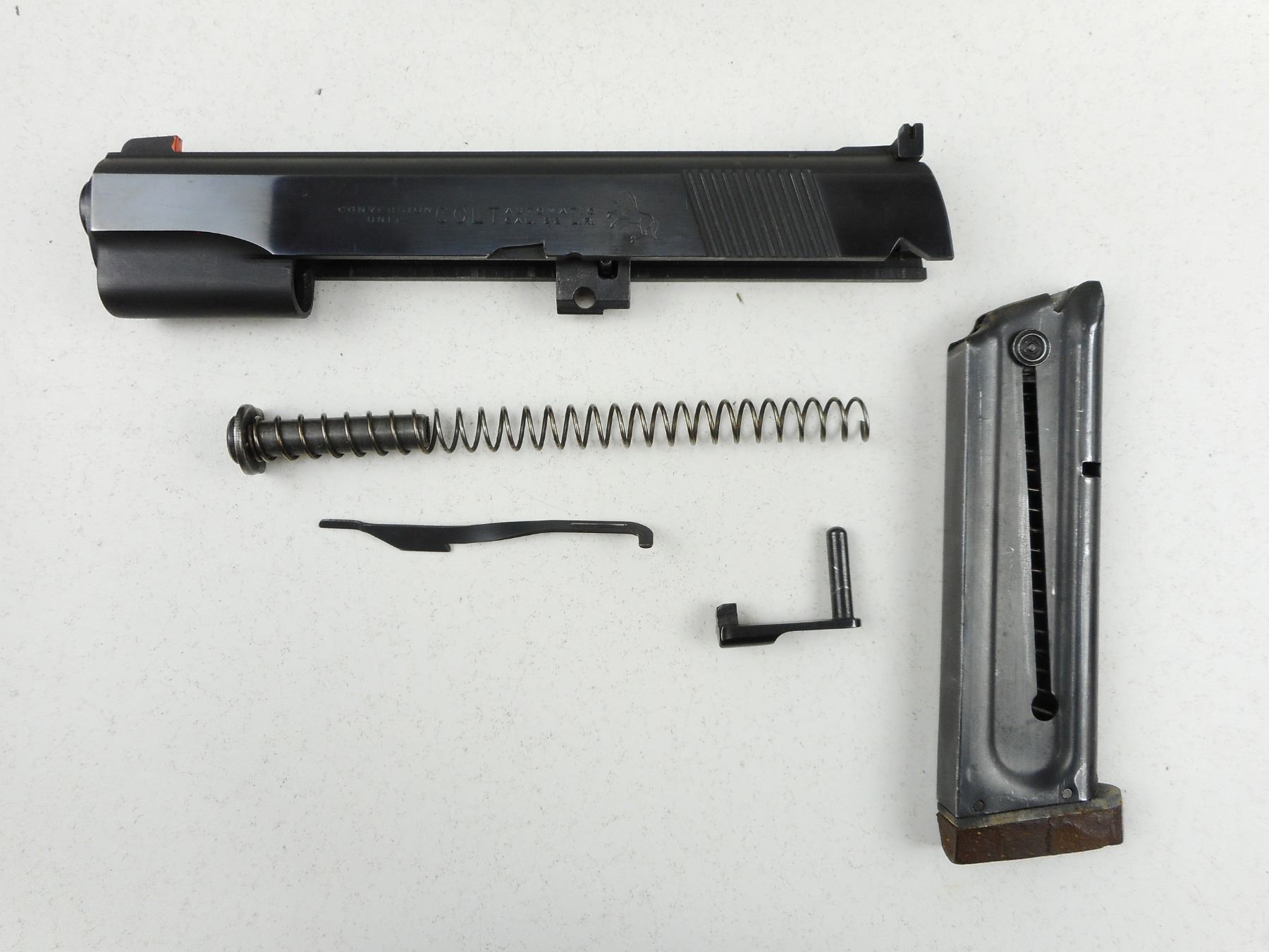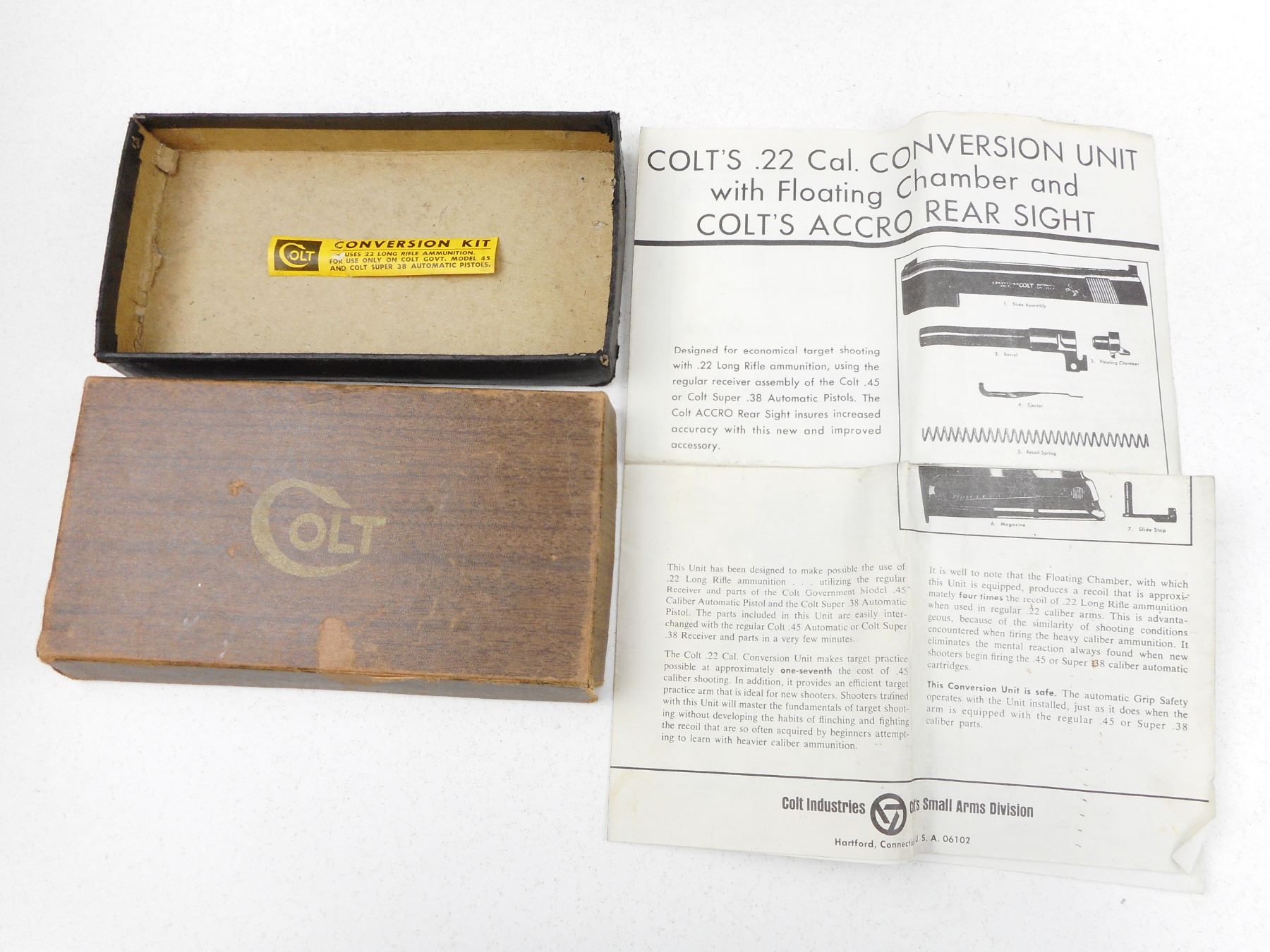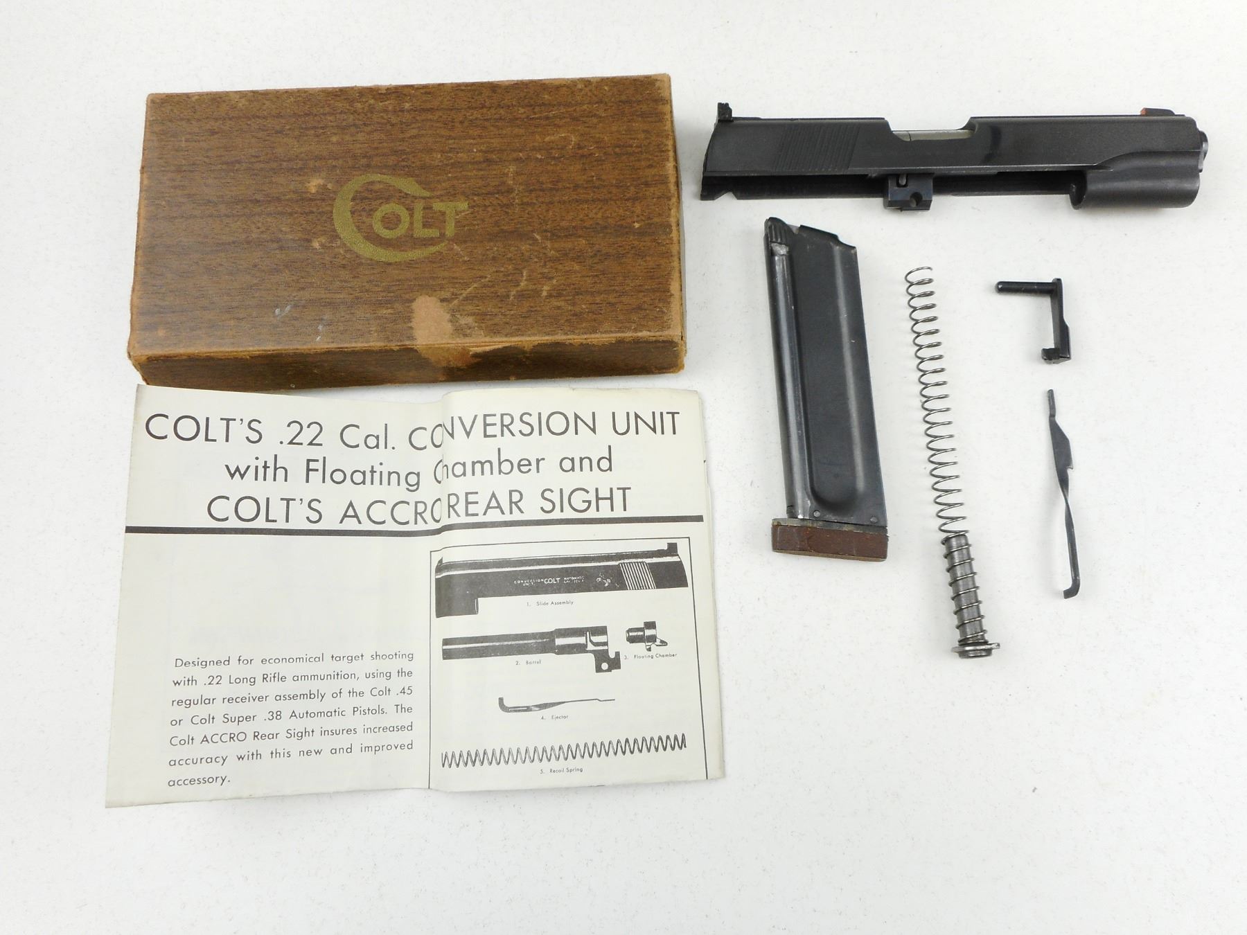 COLT AUTOMATIC 22 LR CONVERSION UNIT IN ORIGINAL BOX, COMES WITH MAGAZINE,CONVERSION UNIT WITH FLOATING CHAMBER, AND COLT'S ACCRO REAR SIGHT, COMPLETE WITH ALL PARTS, MANUAL AND ORGINAL BOX, SAYS FOR ONLY ON COLT GOVT. MODEL 45 AND COLT SUPER 38 AUTOMATIC PISTOLS. CONVERSION UNIT ONLY, NOT A COMPLETE FIREARM