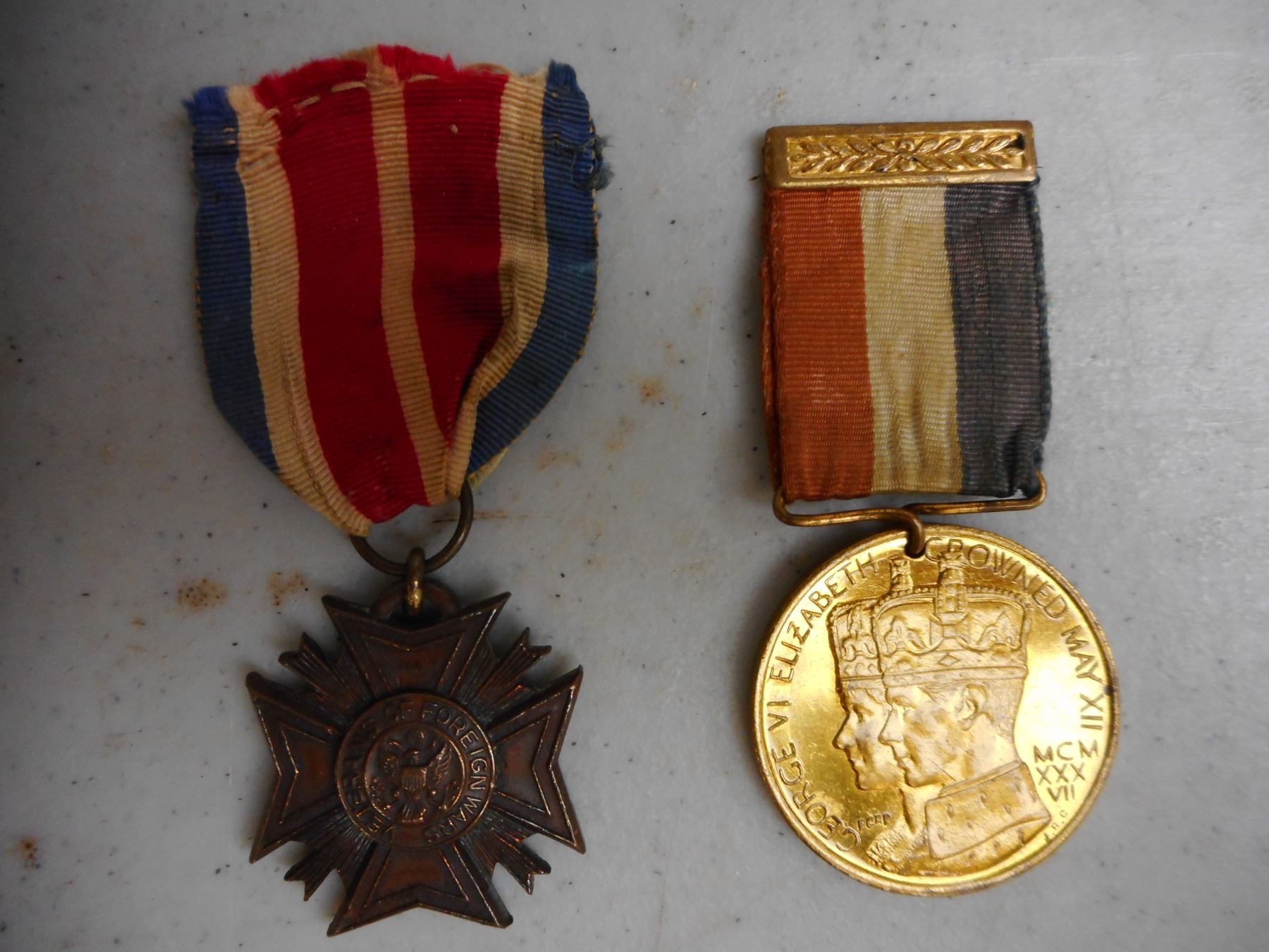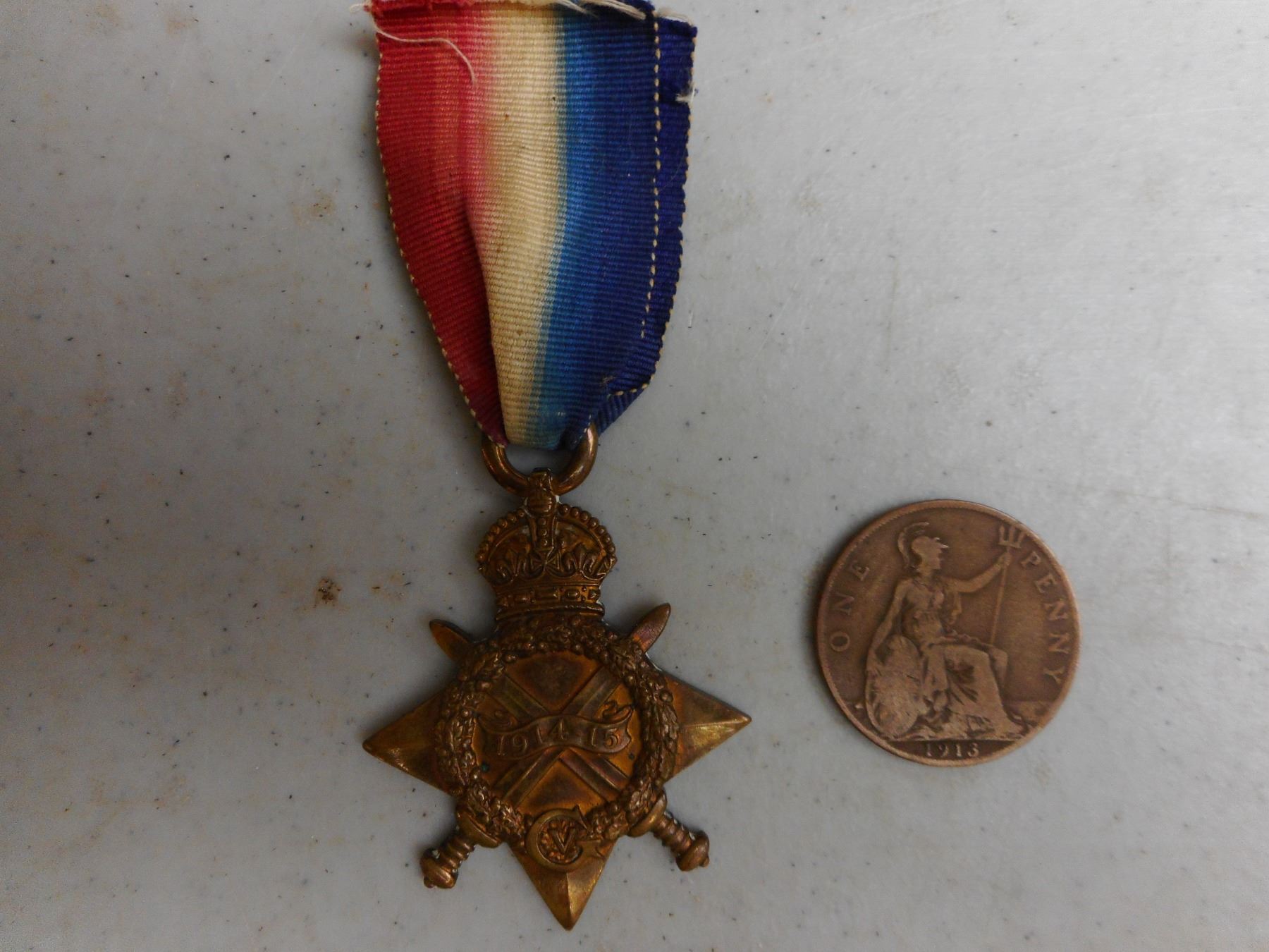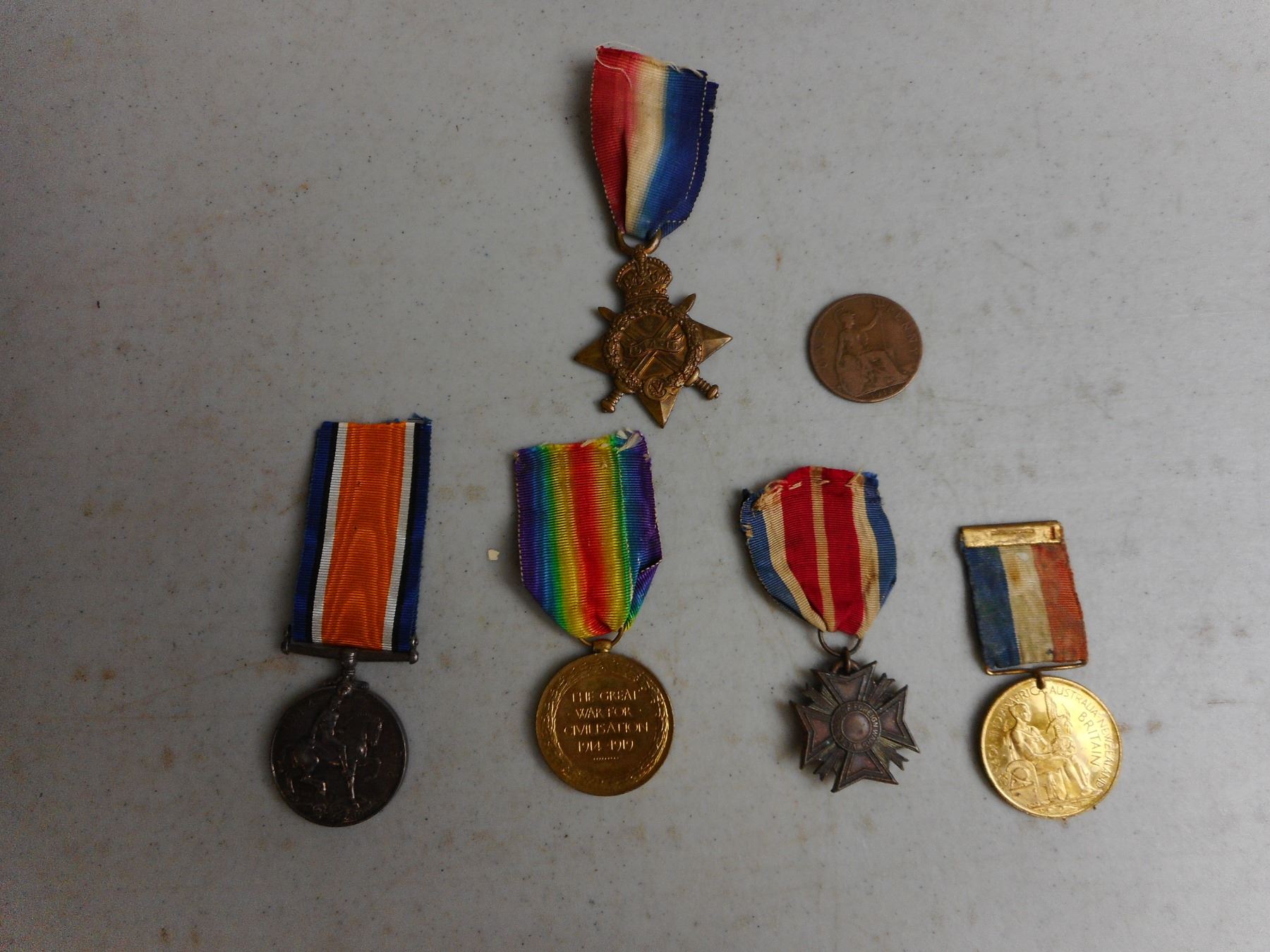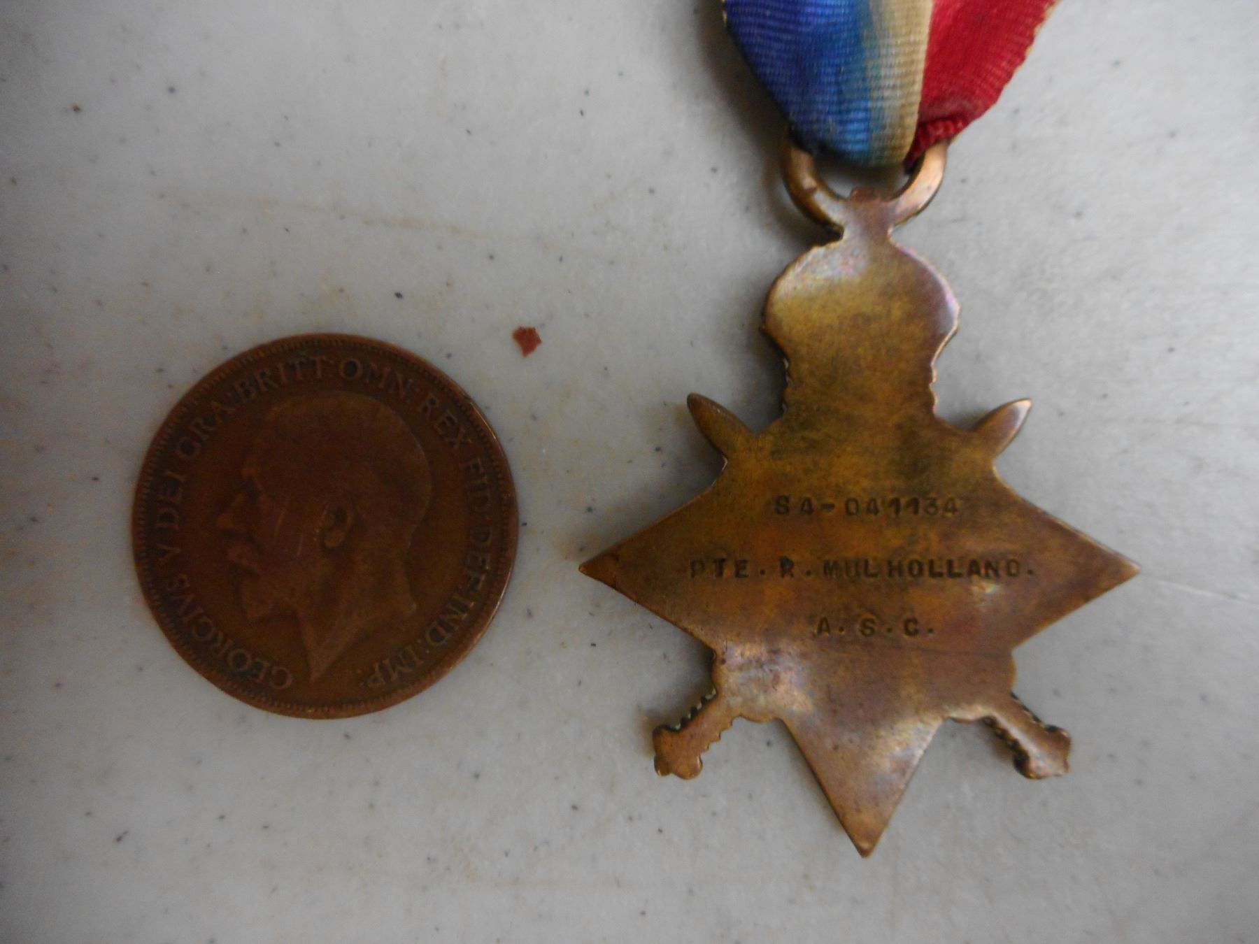 ASSORTED NAMED WWI VETERANS MEDALS , PTE. R. MULHOLLAND S4-041134 A.S.C. 1914-1919 BRITISH VICTORY MEDAL & 1914-1915 STAR WITH RIBBONS, GNR. C. HUGHES 160268 R.A. 1914-1918 WAR MEDAL WITH RIBBON, (2) UNMARKED MEDALS: VETERANS OF FOREIGN WARS STAR WITH RIBBON, & BRITISH SERVICE MEDAL WITH RIBBON, PENNY DATED 1913