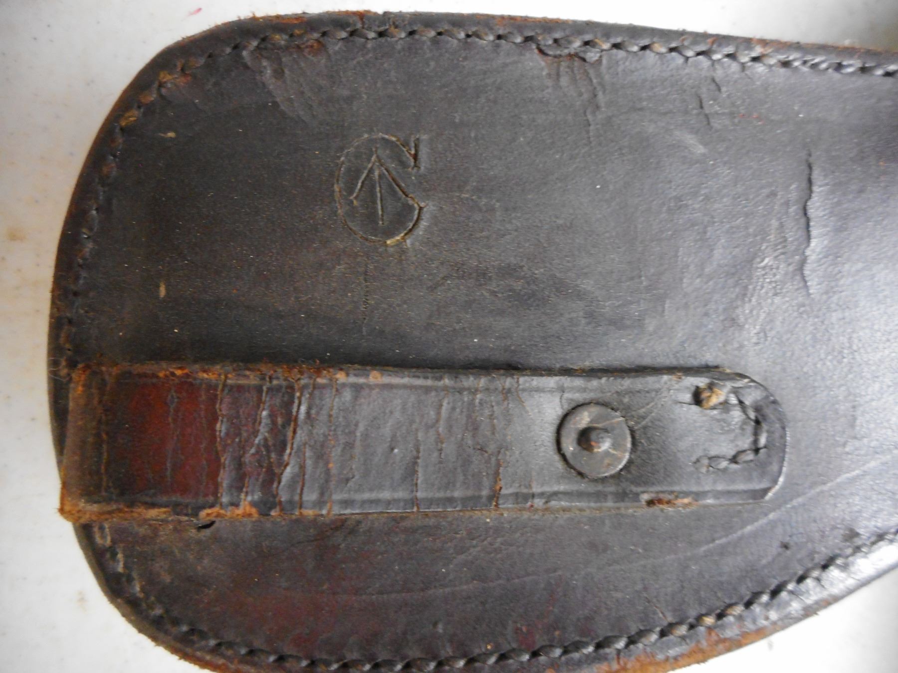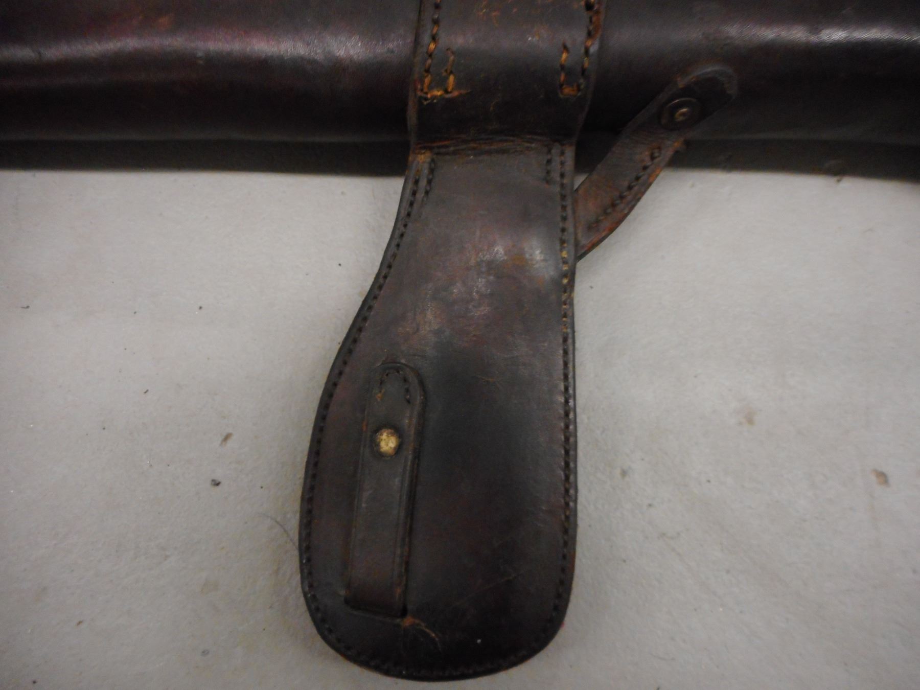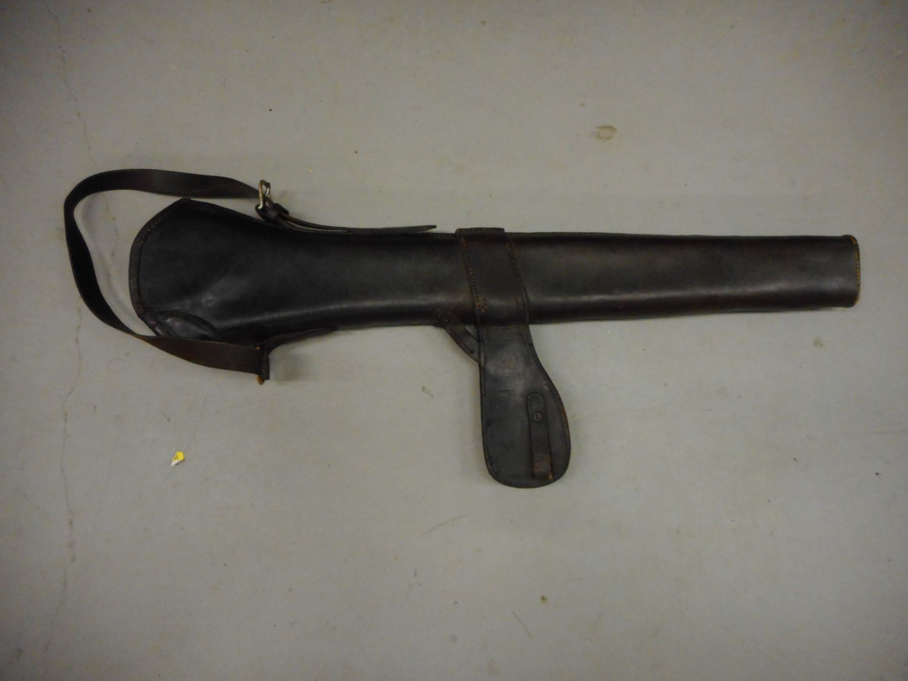 WWI CANADIAN CAVALRY LEATHER CARBINE BOOT/BUCKET , FOR EARLY LEE ENFIELD STAMPED HUGH CARSONCO. LTD.. OTTAWA 1922, CANADIAN BROAD ARROW MARKED