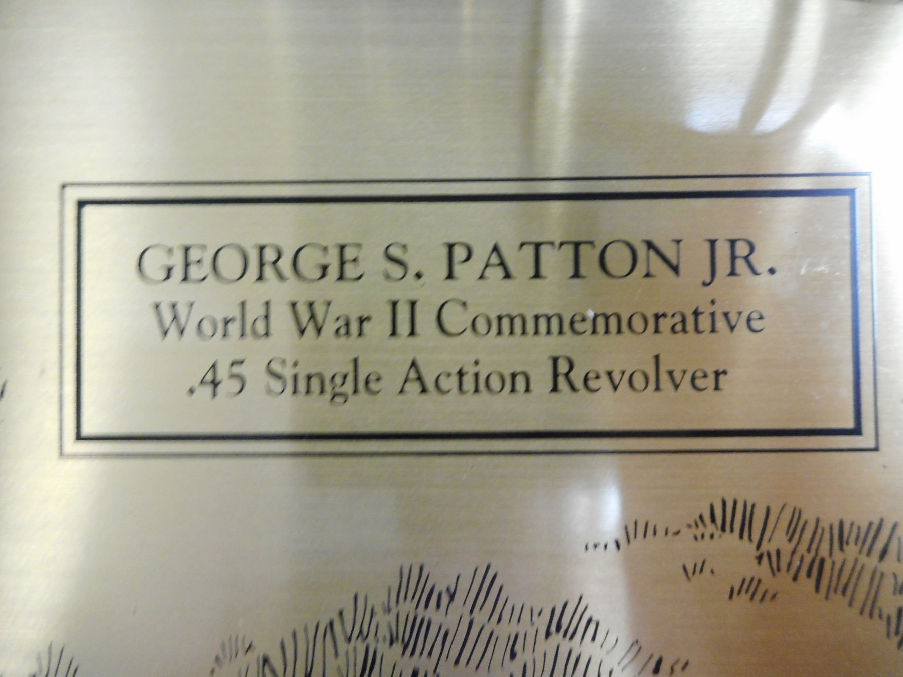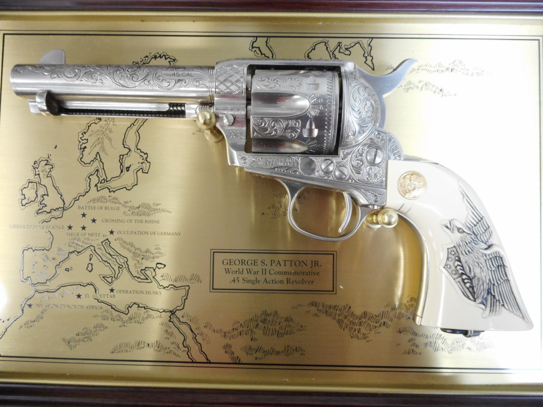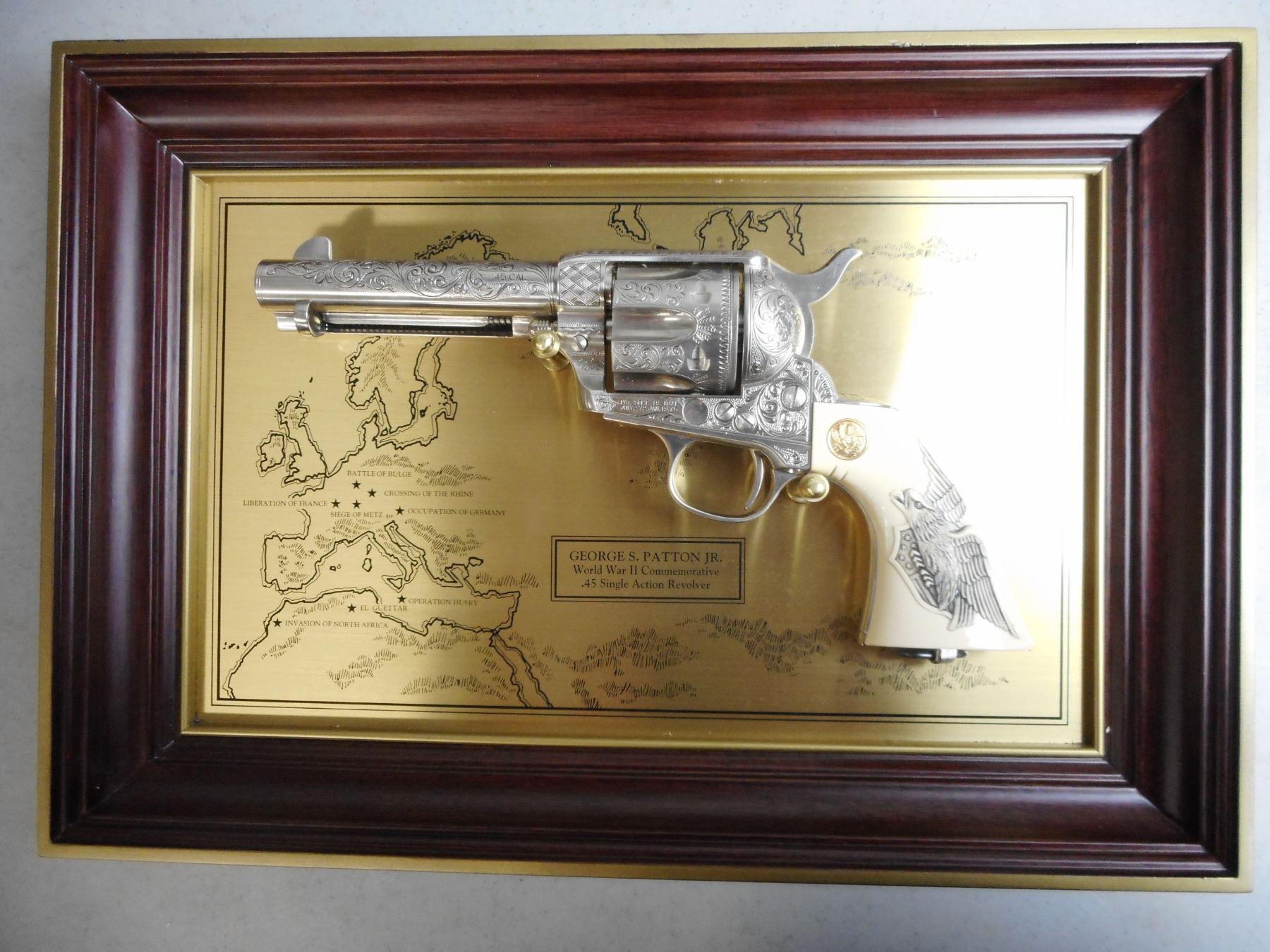 COLT SAA COMMEMORATIVE REVOLVER WITH DISPLAY PLAQUE , GEORGE S. PATTON JR WORLD WAR II COMMEMORATIVE .45 SINGLE ACTION REVOLVER, DISPLAY PLAQUE IS 15.5 X 10.5" WITH ENGRAVED COLT BY FRANKLIN MINT, NIB-CA 1980, THIS IS A NON FIREARM