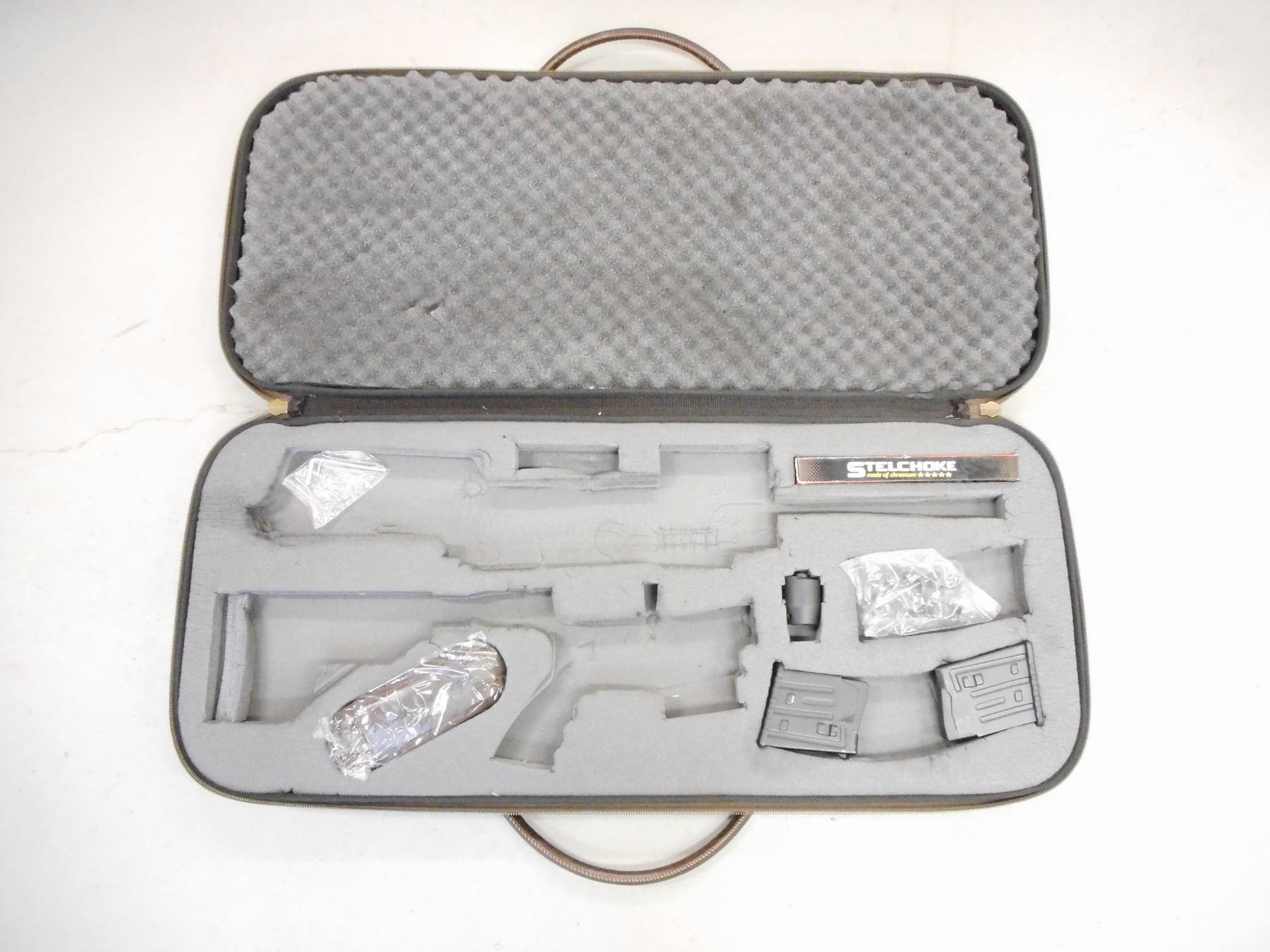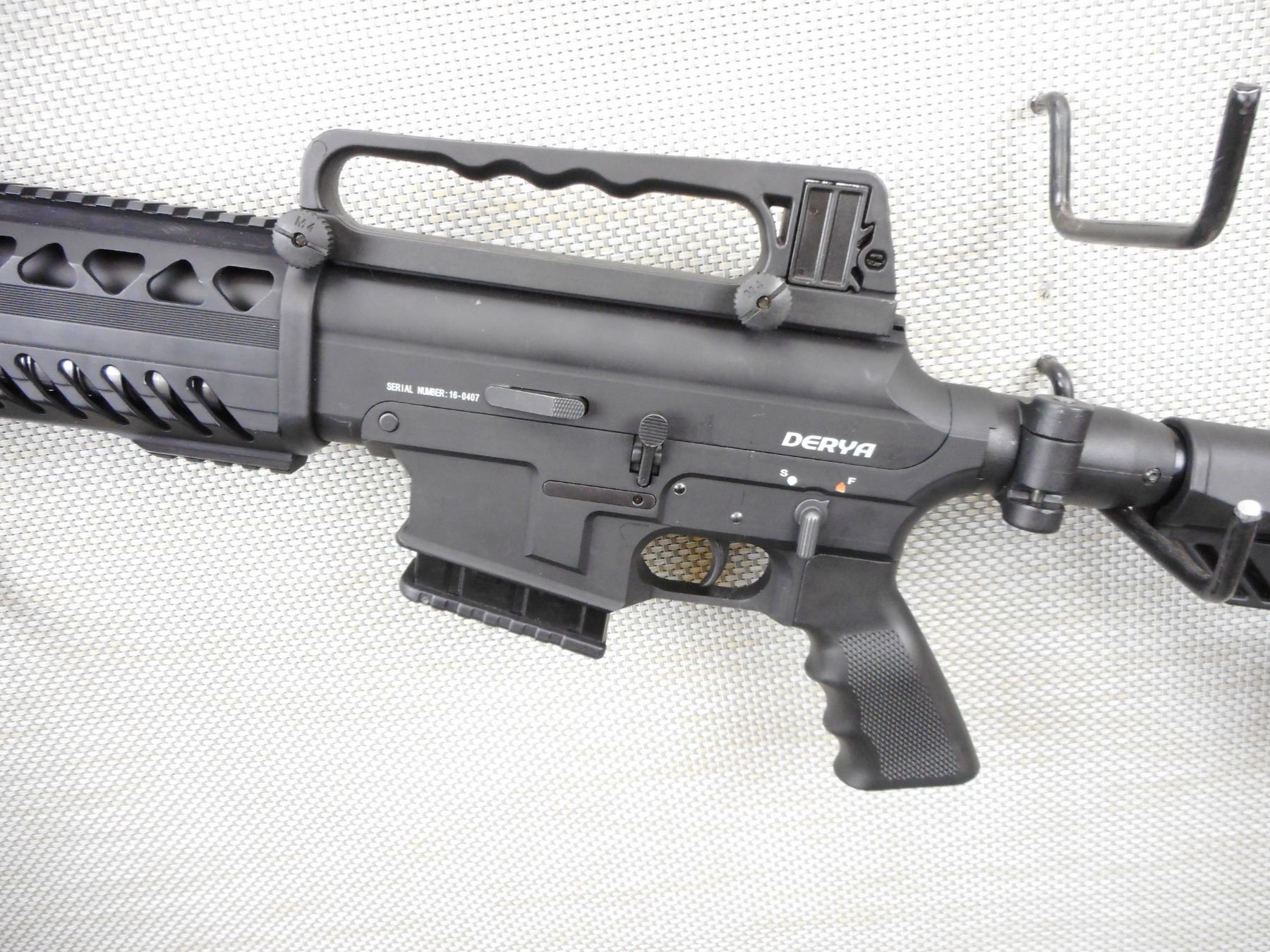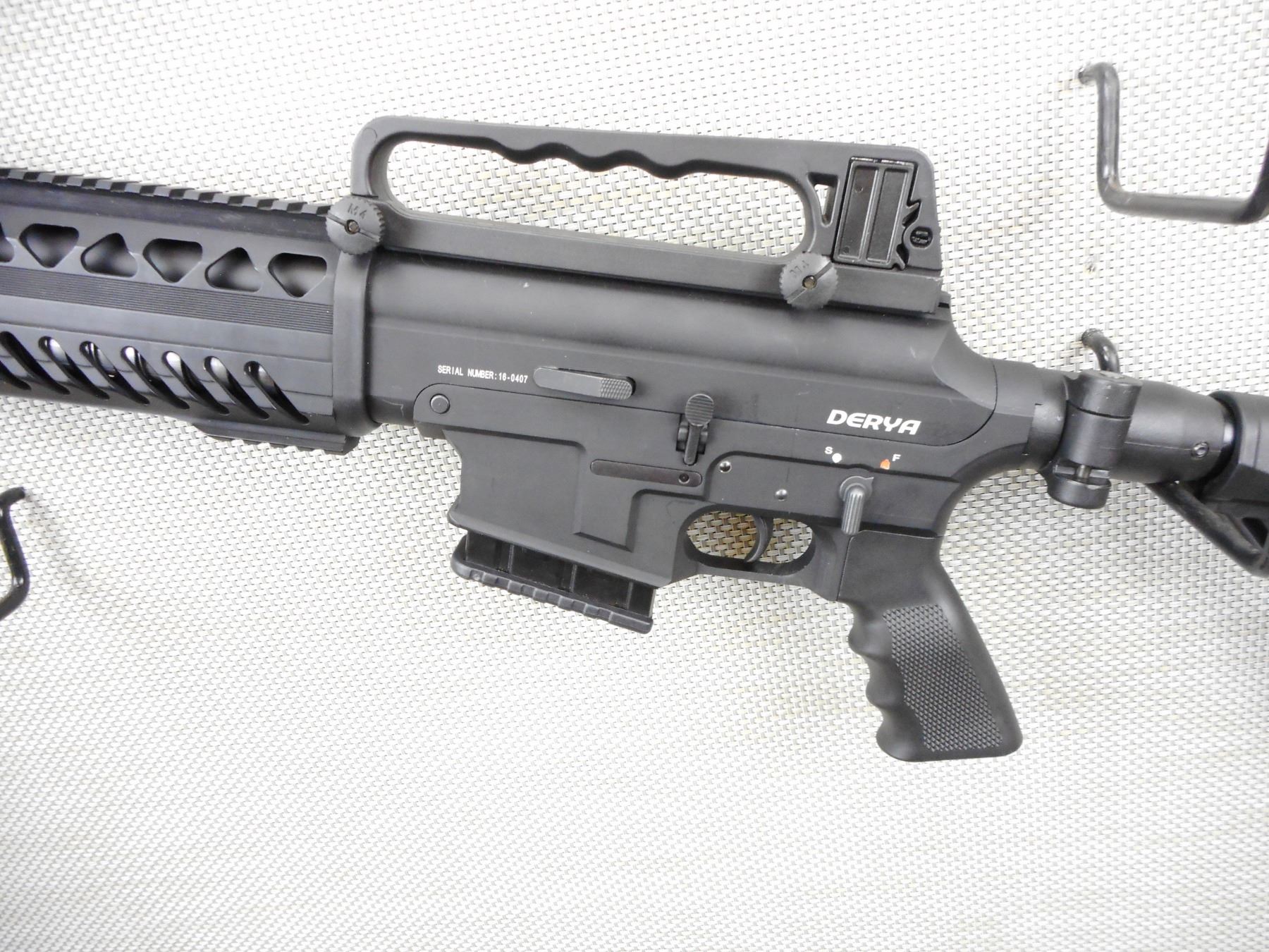 DERYA ARMS, MODEL: MK10, CALIBER, 12GA X 3",COMES IN SOFT FITTED CASE, WITH 3 MAGAZINES, BLACK SYNTHETIC COLLAPSIBLE FOLDING STOCK WITH ACCESSORY RAILS ON 4 SIDES AND CARRYING HANDLE, SLING ATTACHMENTS ON STOCK WITH A FULL PISTOL GRIP,, ADJUSTABLE REAR NOTCH SIGHT AND FRONT POST SIGHT, HEAT SHIELD, FLASH SUPPRESSOR THAT IS REMOVABLE AND A 3 SET OF STELCHOKE CHOKE TUBES, NYLON SLING, EXCELLENT BORE, ACTION: SEMI AUTOMATIC SHOTGUN, SERIAL #160407, CONDITION: 9+/10