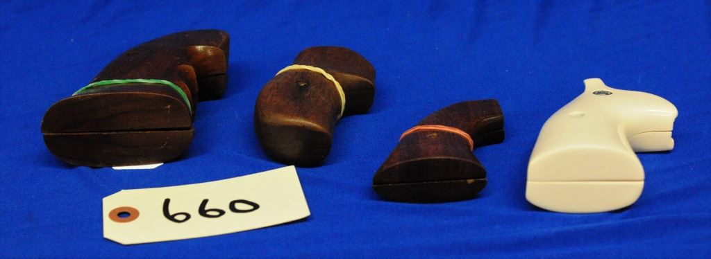 Wood S&W K RB, Wood Single Action Colt, White Plastic S&W , Wood Single Action Ruger.