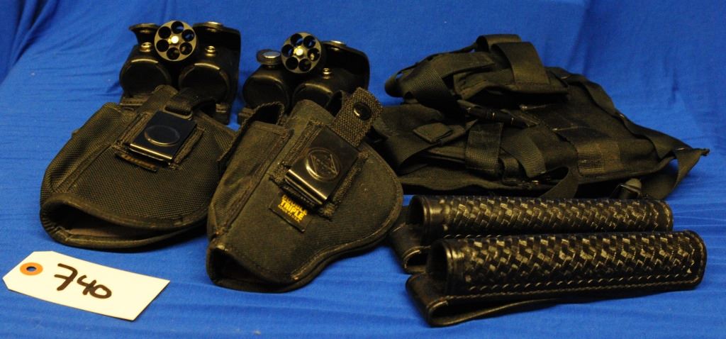 Leather mag holsters with HKS 10A mags, Nylon Thigh Holster, Two Leather Billy Stick Holsters, Two Nylon pistol holsters.