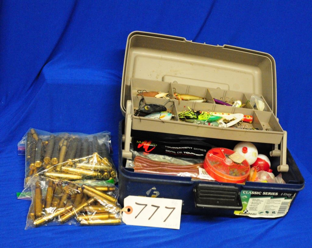 80 pces 30-06 Sprg brass, Flambeau tackle box with various tackle.