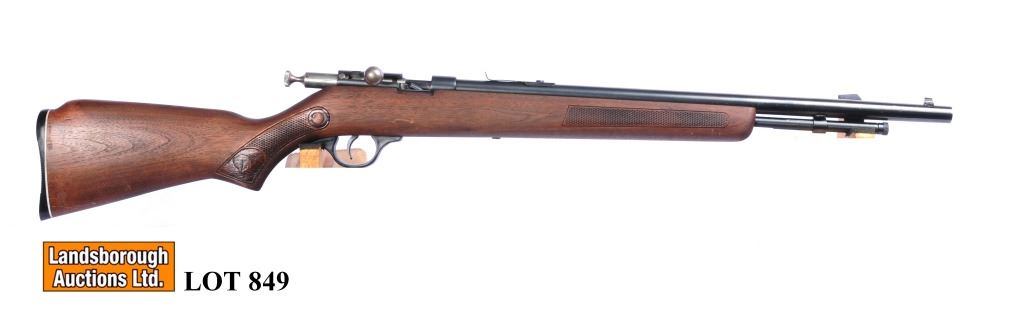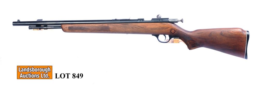 Non-restricted, bolt action single shot, 22 s-l-lr, 20" barrel, SN none, wood is a rabbit stock with just a few minor scratches, bluing is fair plus, bore is excellent