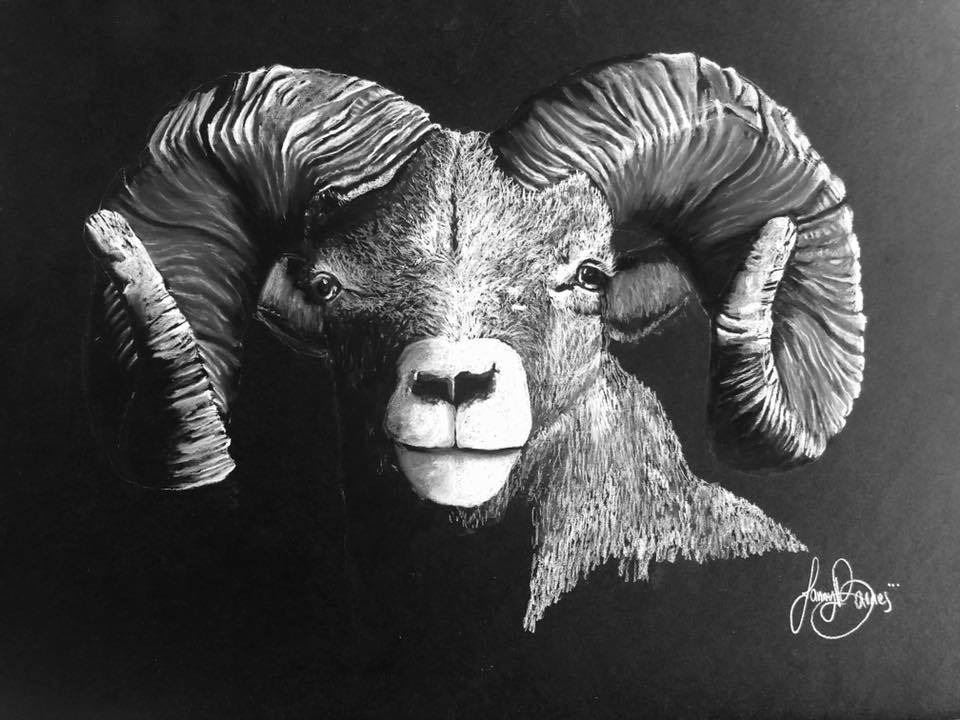 Bighorn Sheep original white charcoal backed drawing by The Olympian Artist, 3-time Olympian Lanny Barnes Siggins. Lanny started drawing and painting at an early age and despite very little instruction in art, she became a professional artist in 2000. She specializes in wildlife art in charcoal, but has done everything from still life, to portraits, to landscapes in every form of media.