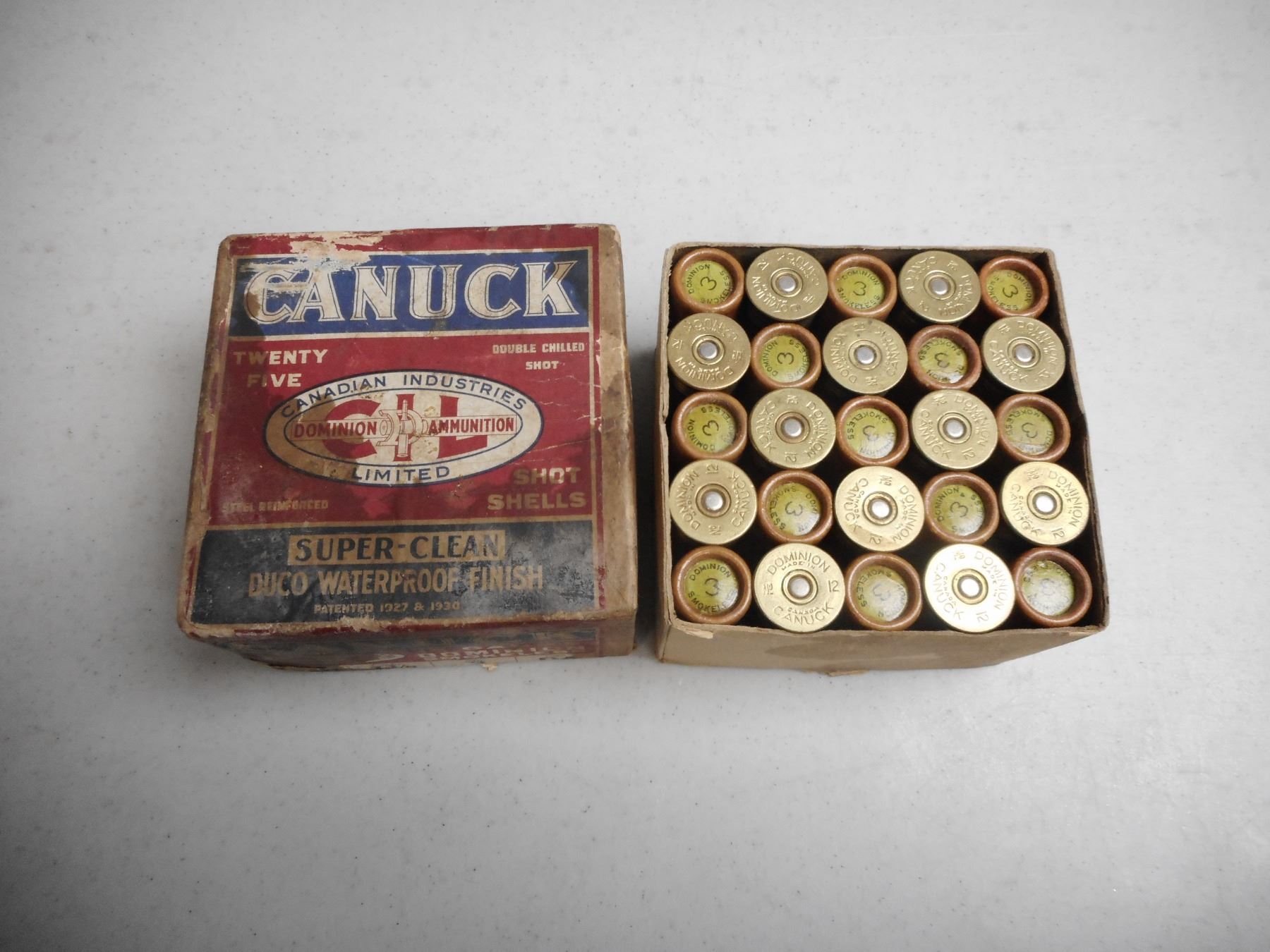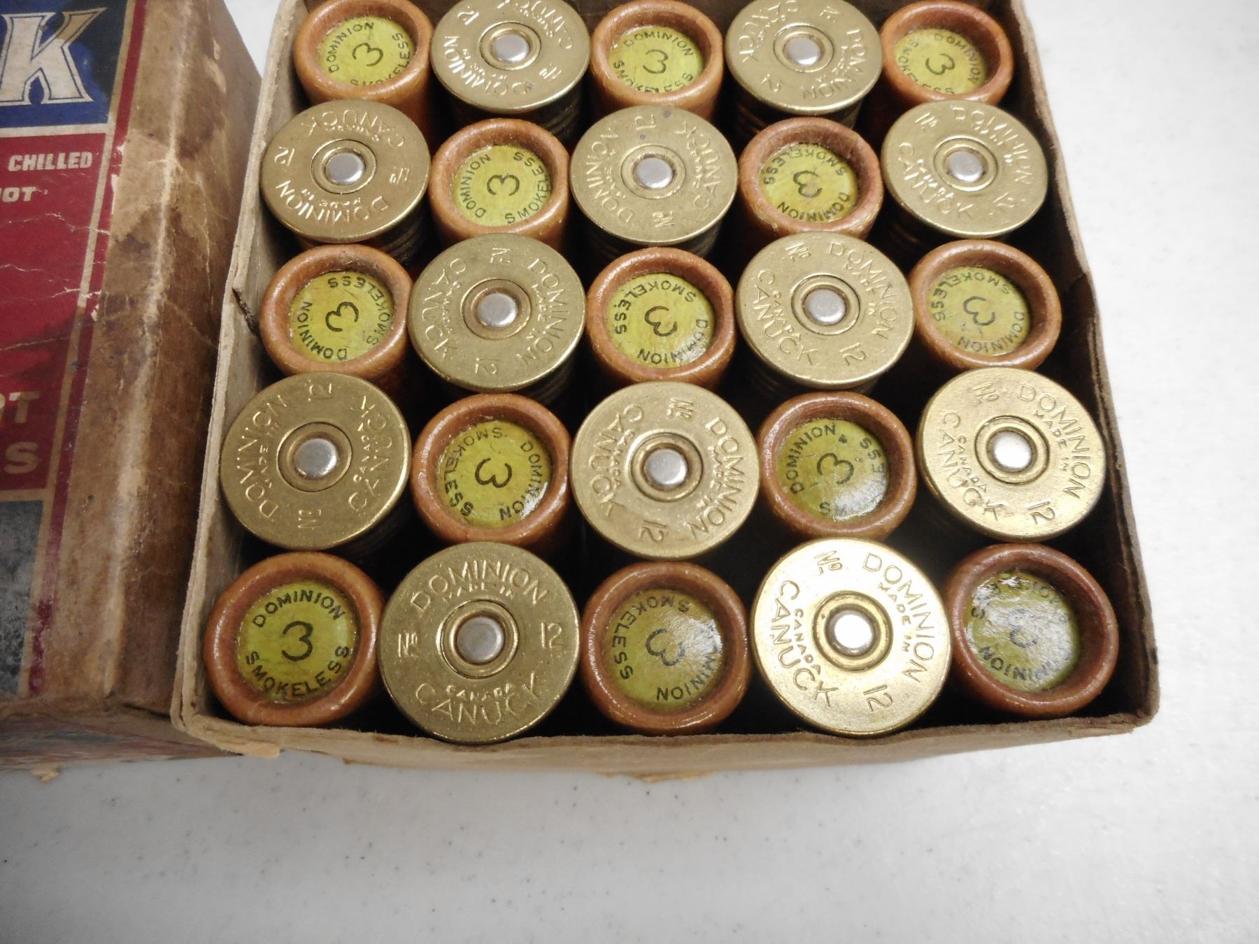 12 GA. 2 3/4 # 3 SHOT IN DOMINION CANUCK VINTAGE BOX , 25 RNDS 12 GA. 2 3/4 #3 SHOT IN DOMINION CANUCK VINTAGE BOX. UNSEALED