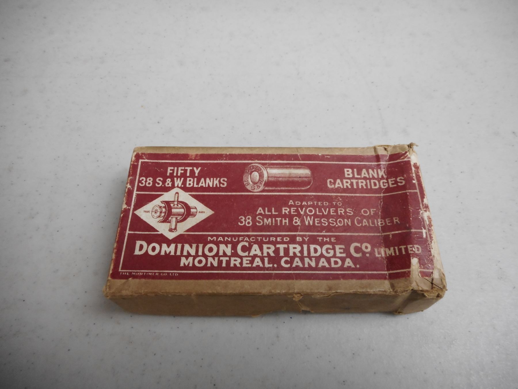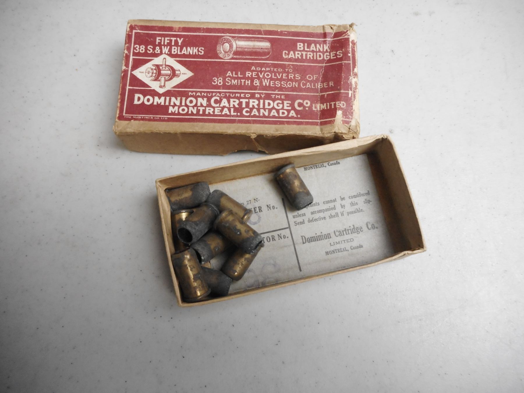 38 SMITH AND WESSON BLANKS , 10 BRASS IN VINTAGE 38 S & W DOMINION CARTRIDGE CO LTD BOX