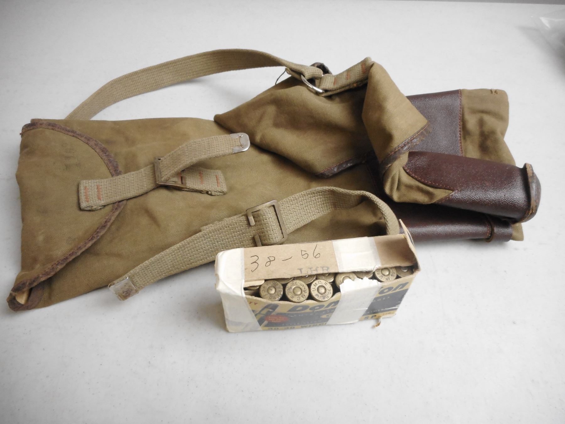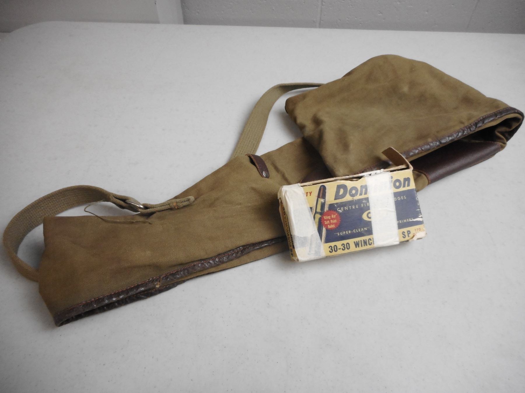 ASSORTED 38-56, WITH CANVAS RIFLE CASE , 22 RNDS ASSORTED 38-56 AMMO, IN VINTAGE DOMINION BOX, WITH CANVAS RIFLE CASE