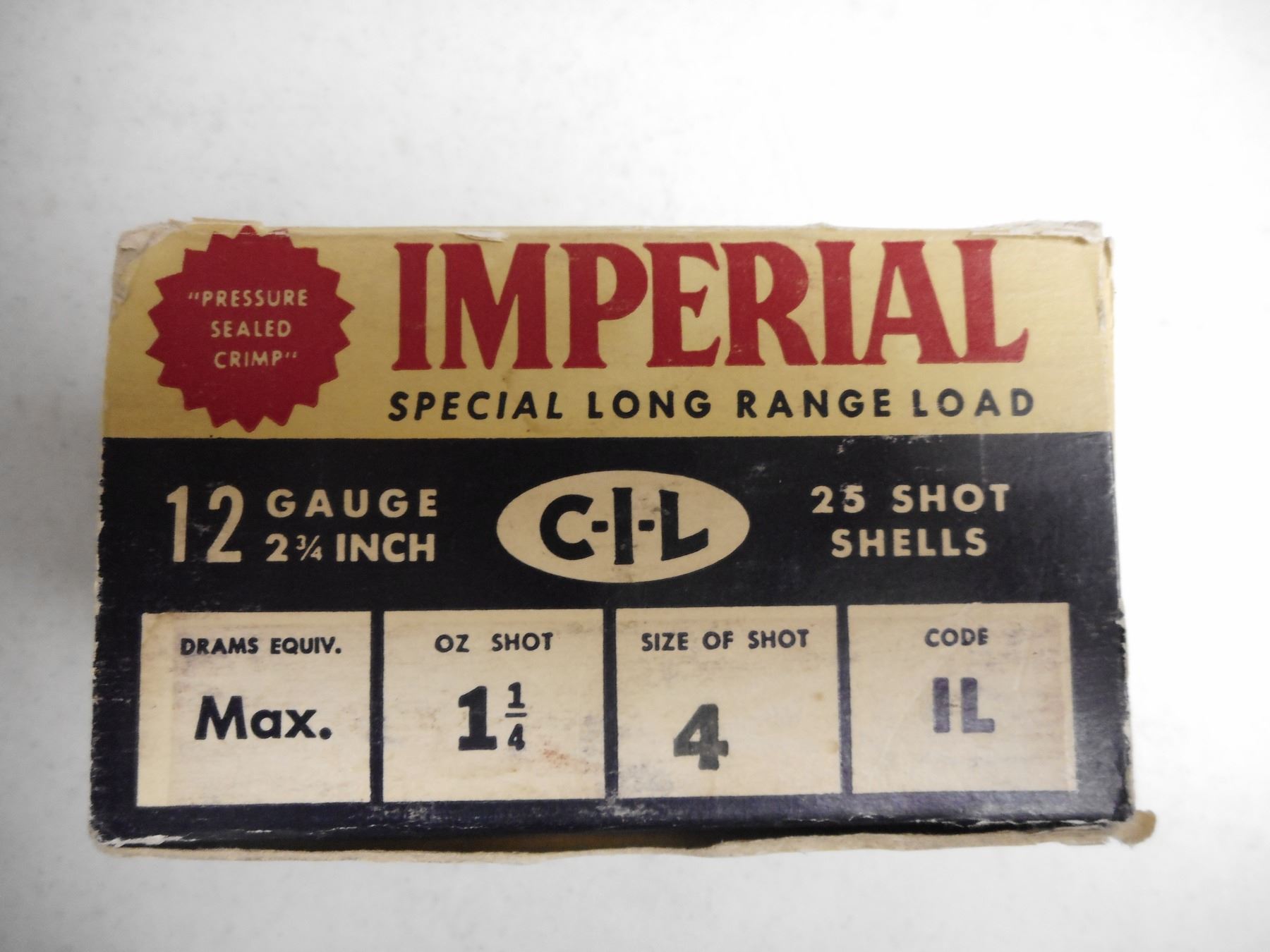 IMPERIAL 12 GA. 2 3/4" # 4 SHOT AMMO , 25 RNDS IMPERIAL 12 GA. 2 3/4" #4 SHOT AMMO, IN VINTAGE IMPERIAL BOX