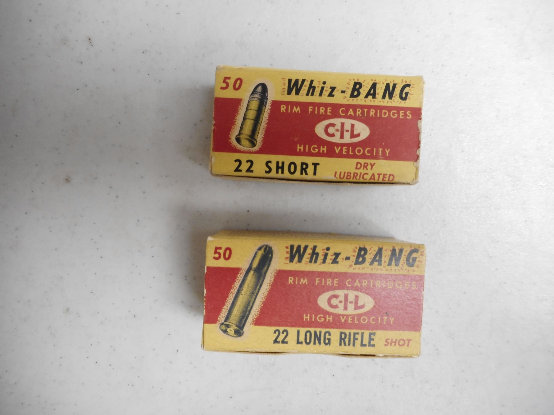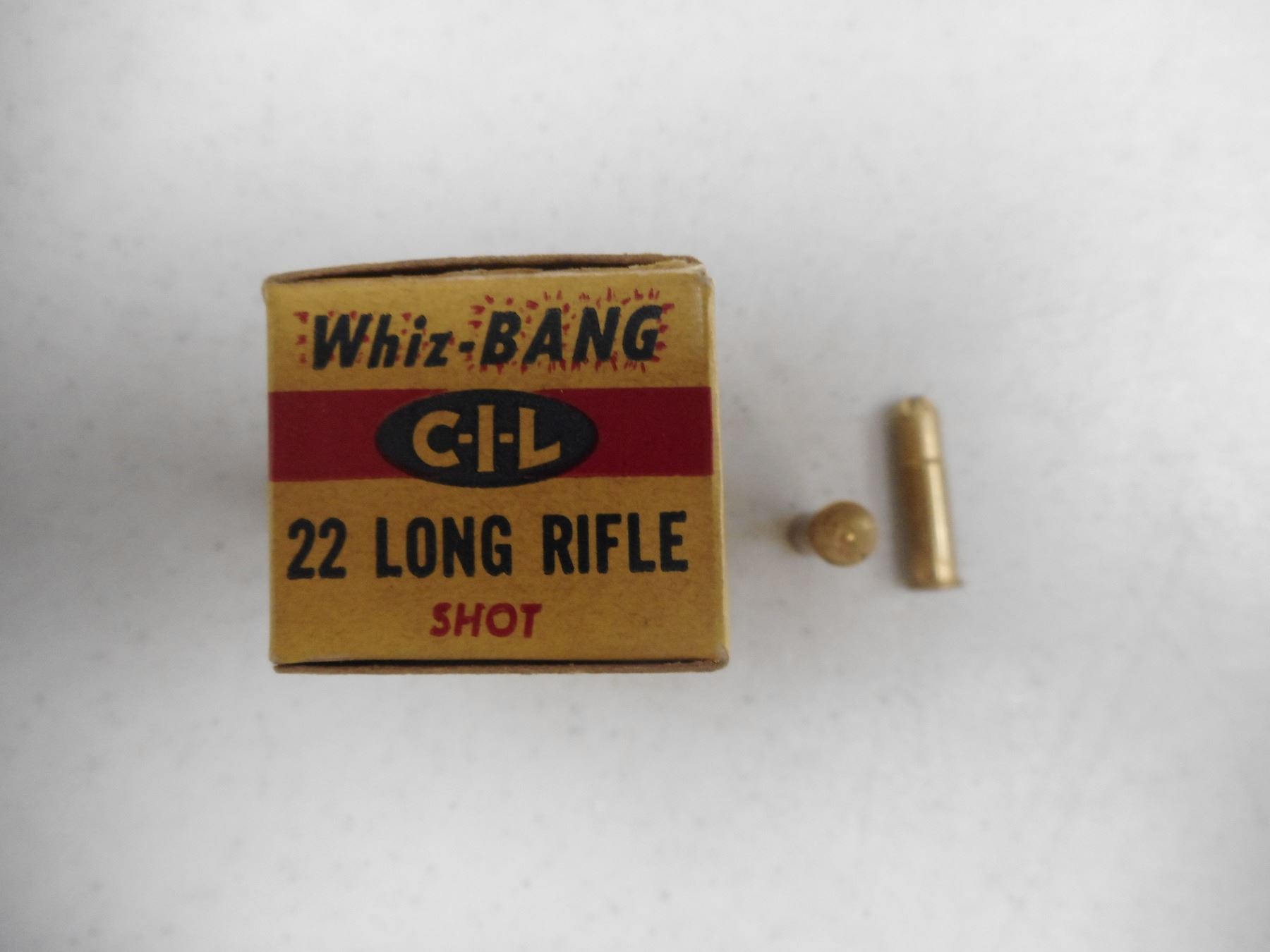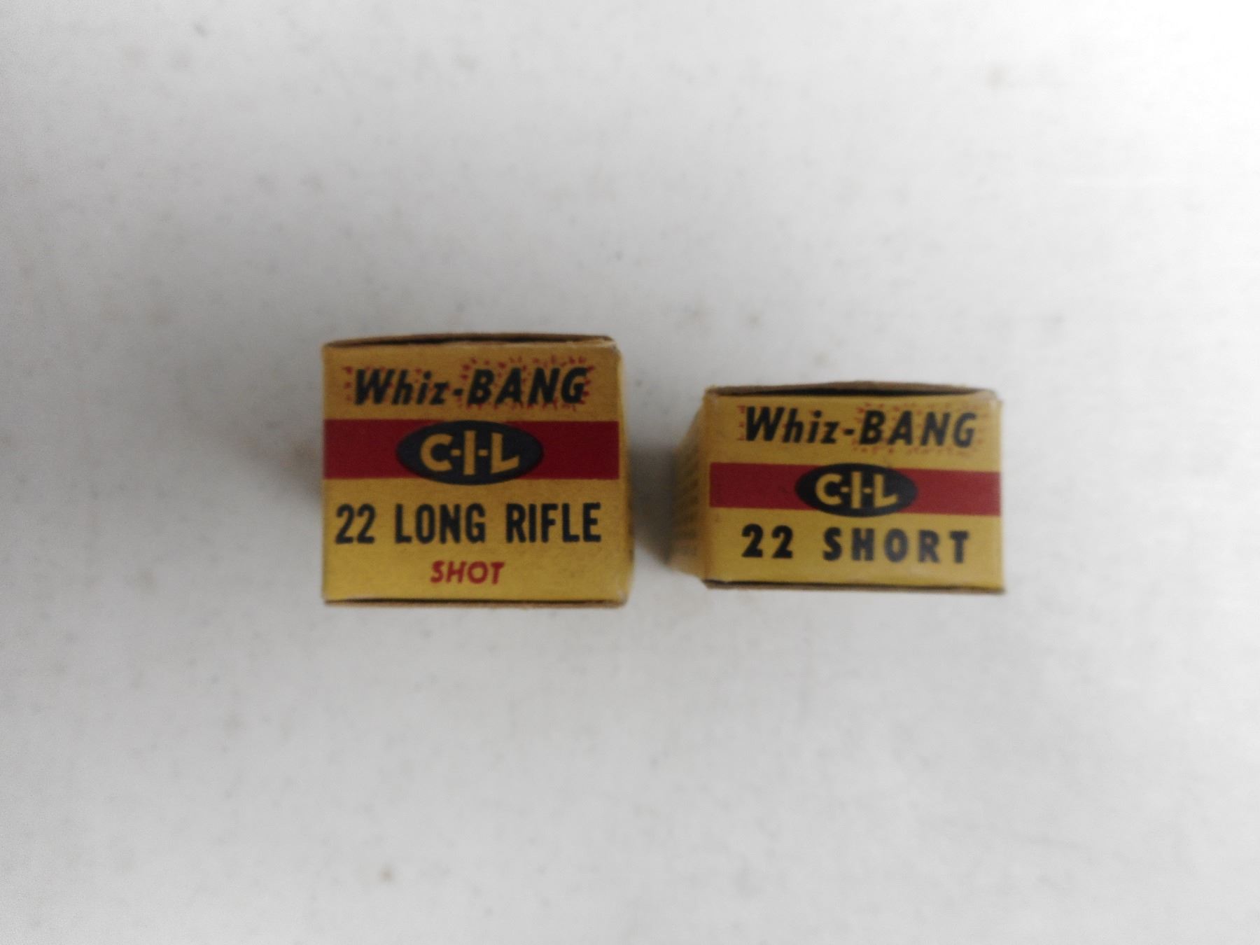 CIL 22 SHORT, AND 22 LONG WHIZ-BANG AMMO , 25 RNDS 22 SHORT CIL WHIZ-BANG AMMO IN VINTAGE CIL BOX, 44 RNDS CIL WHIZ-BANG 22 LONG RIFLE BLANKS IN VINTAGE CIL BOX