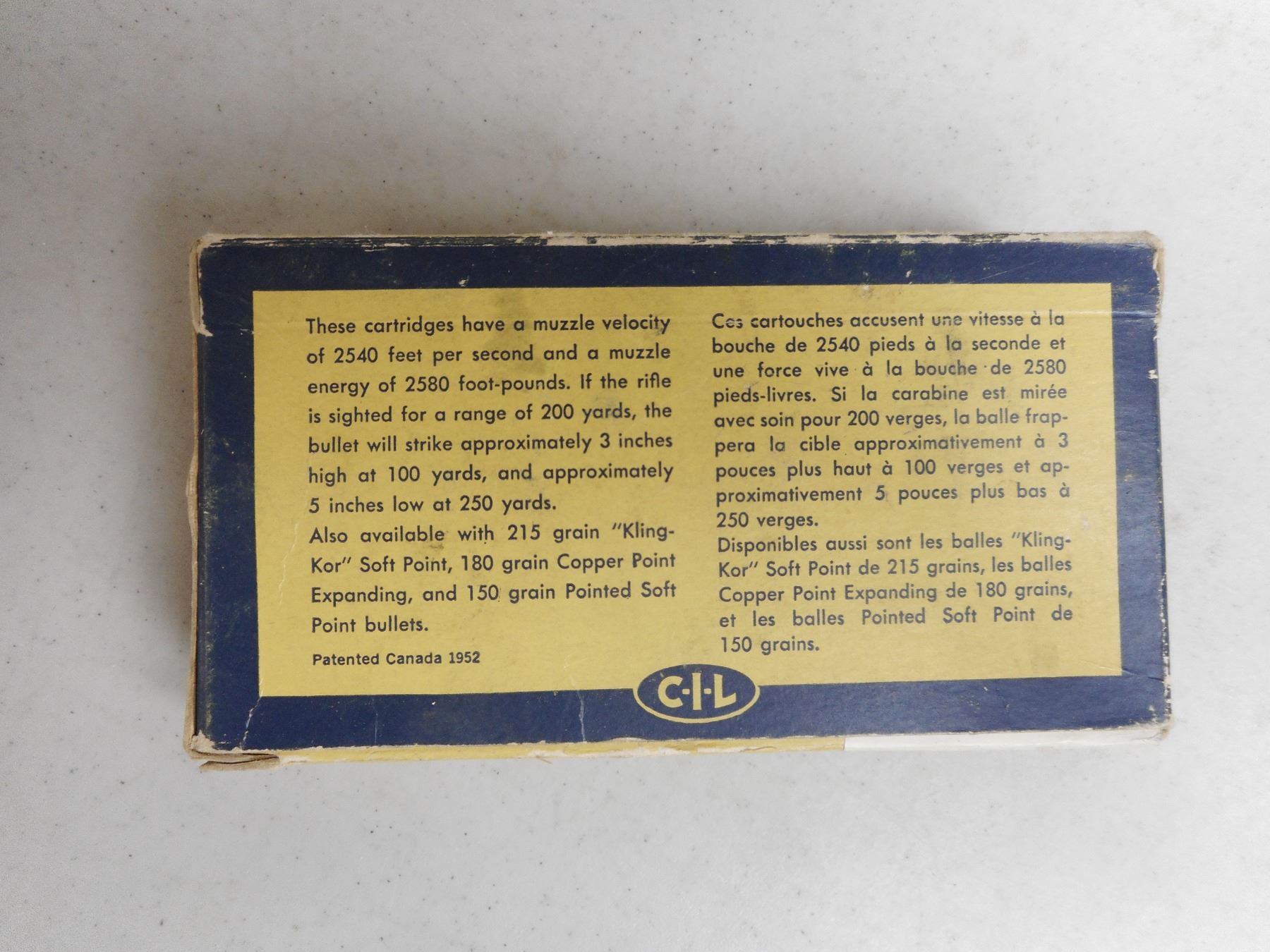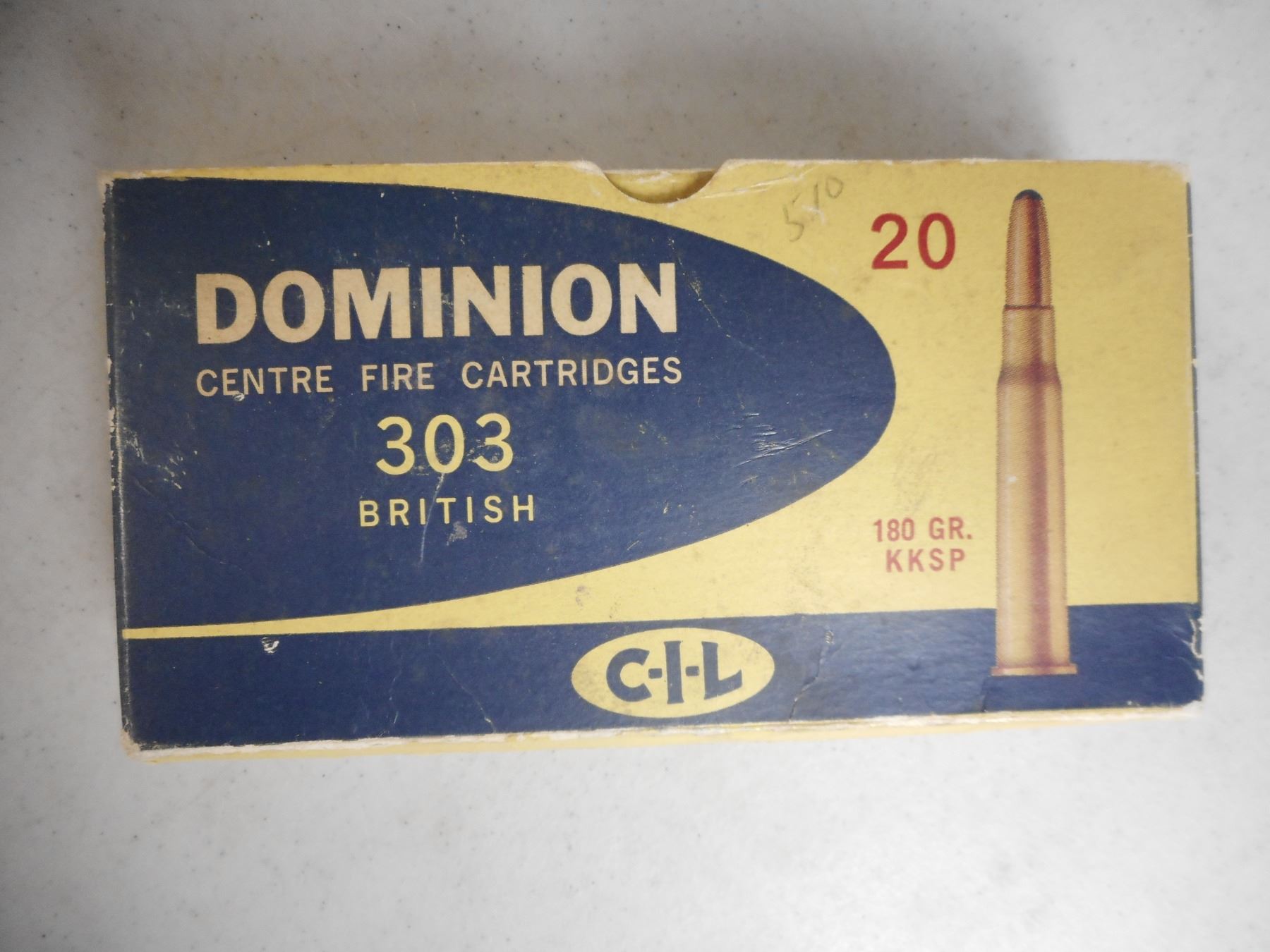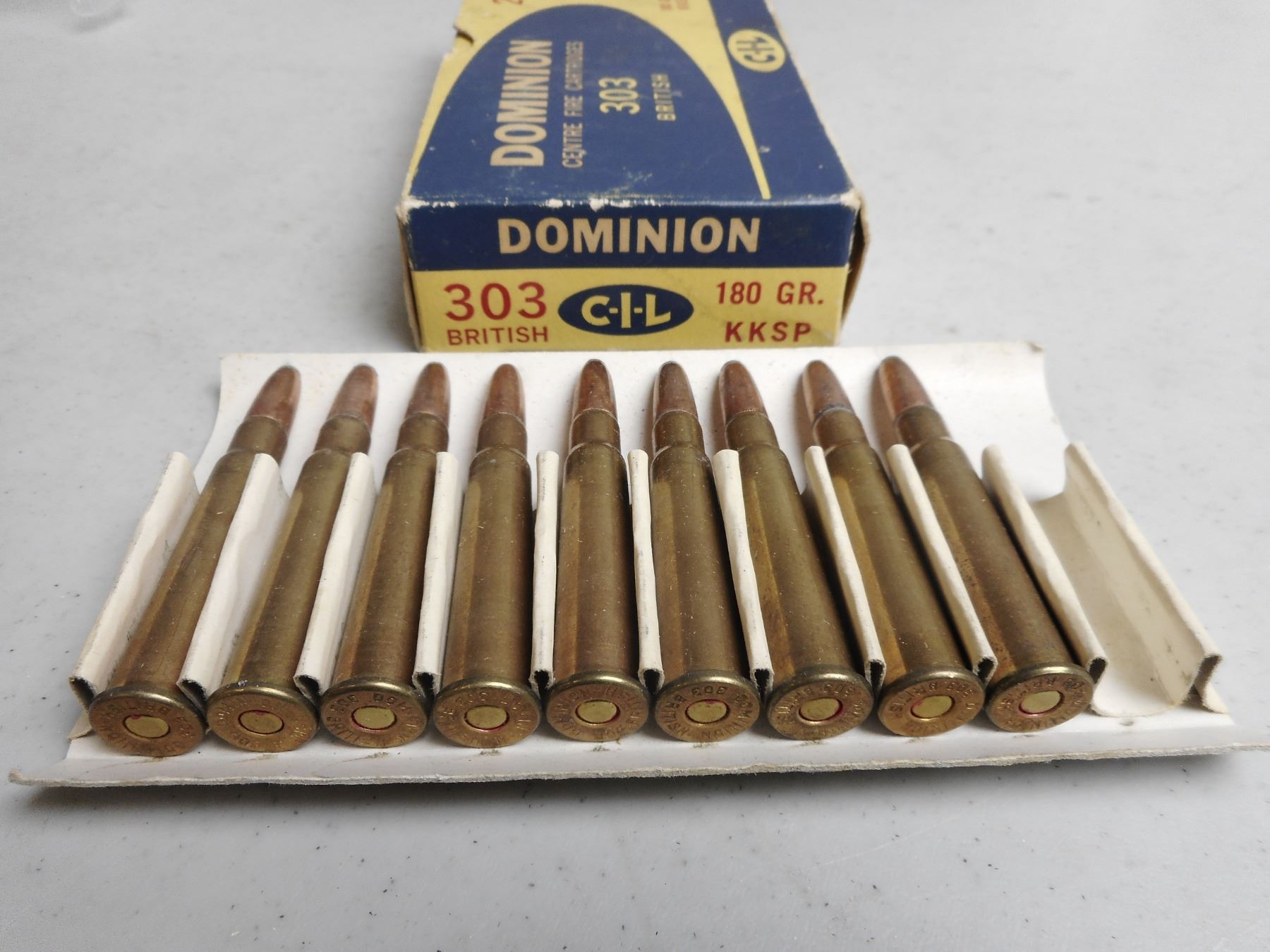 DOMINION 303 BRITISH AMMO , 9 RNDS .303 BRITISH AMMO, 11 303 BRASS IN VINTAGE DOMINION BOX