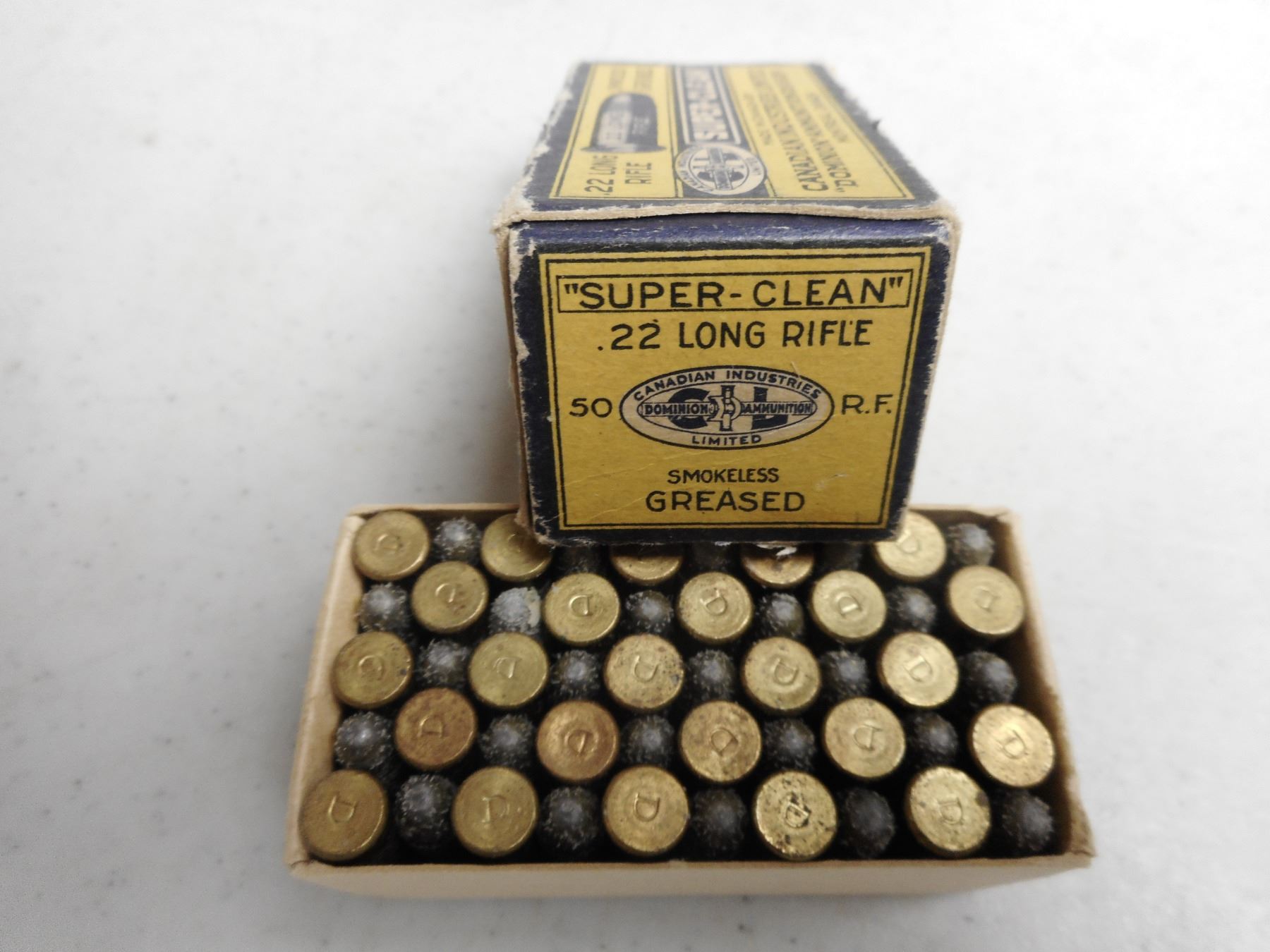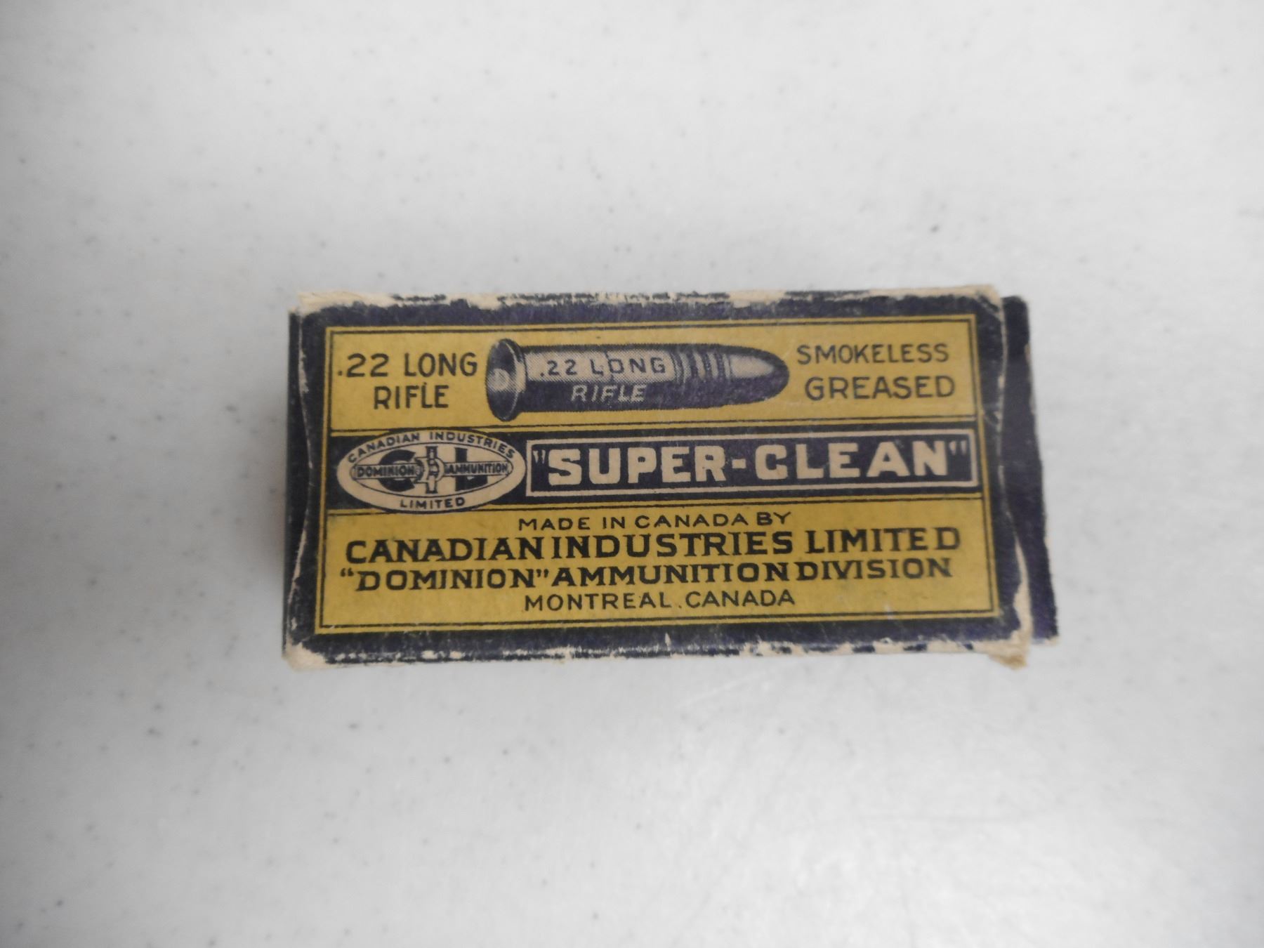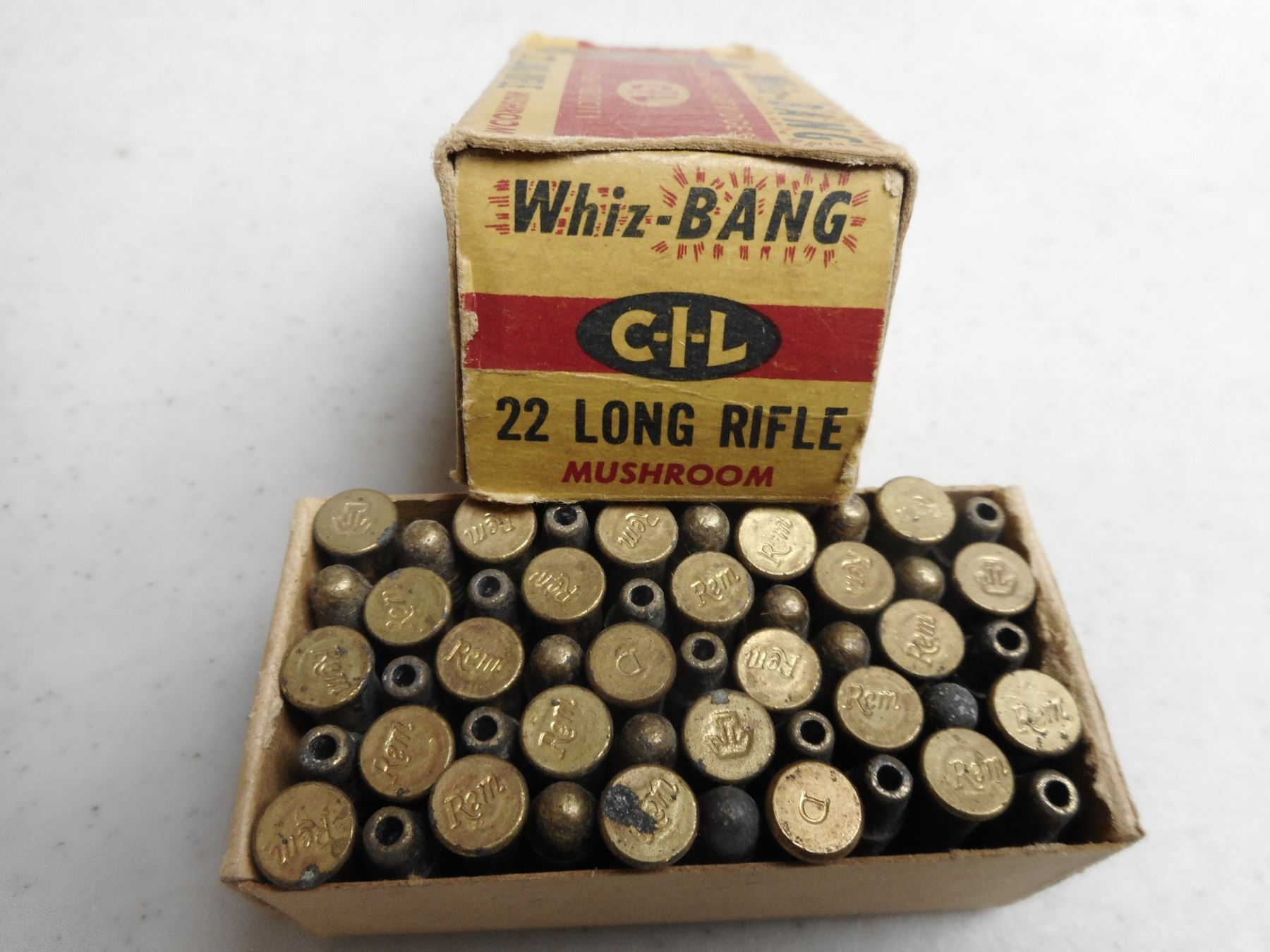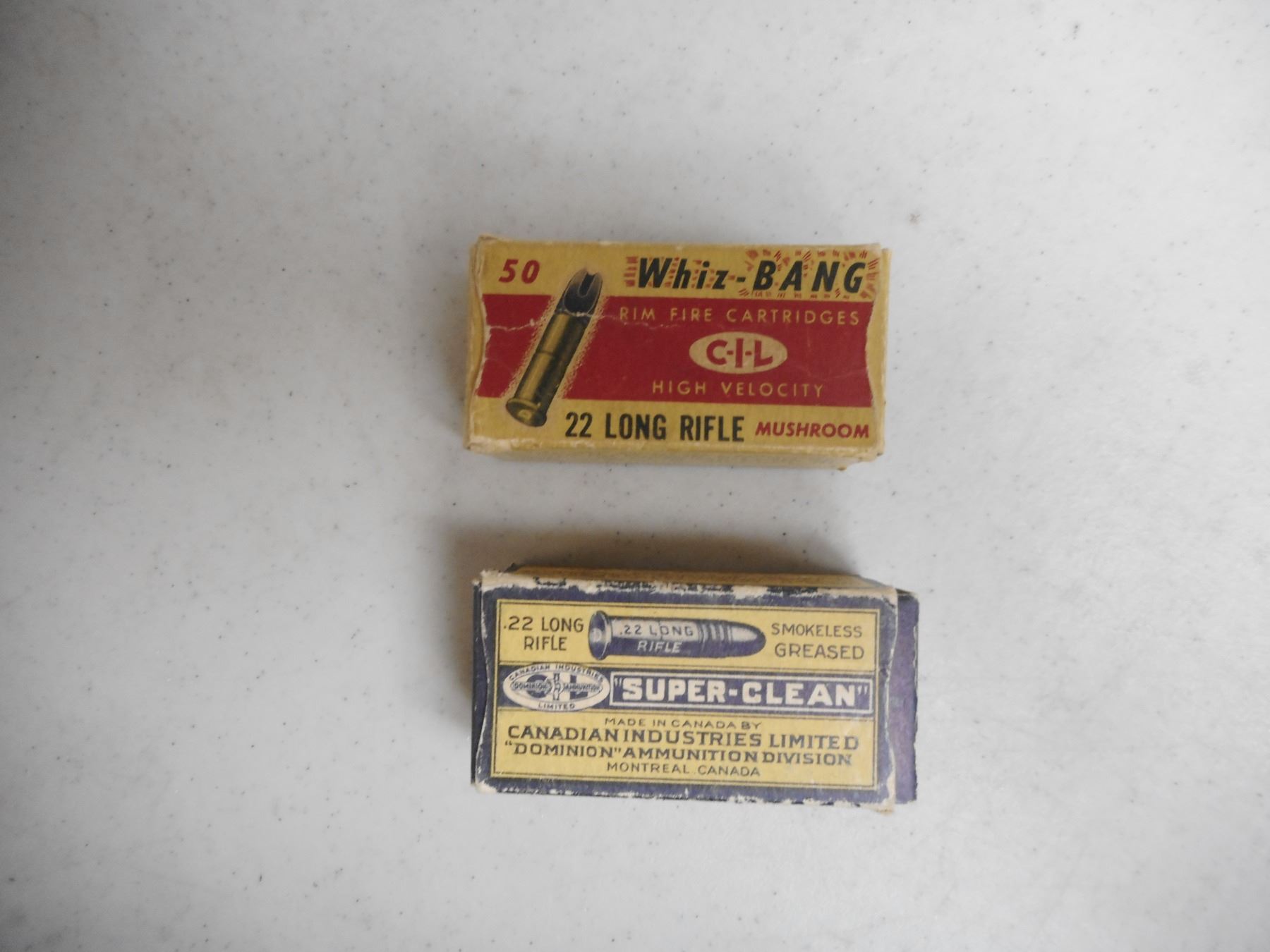 22 LONG RIFLE AMMO , 100 RNDS 22 LONG RIFLE AMMO, IN VINTAGE DOMINION AND CIL WHIZ-BANG BOXES