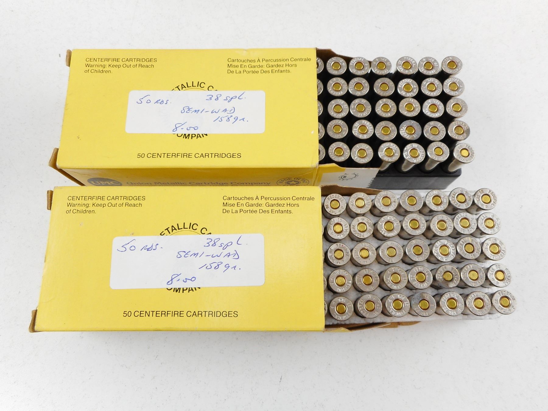 UMC 38 SPECIAL RELOADED AMMO , 100 RNDS 158 GRAIN LEAD LABELLED 38 SPL SEMI-WAD