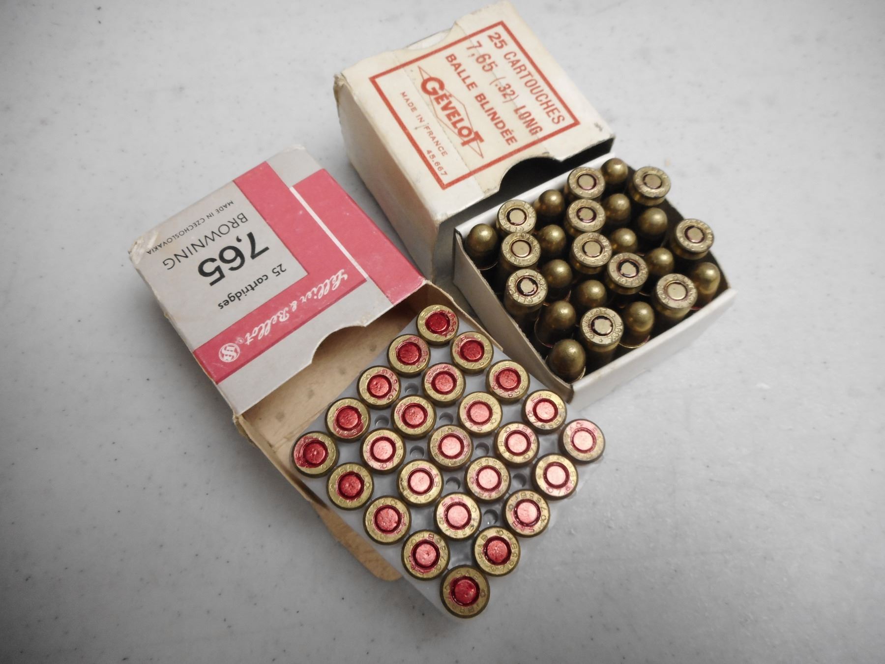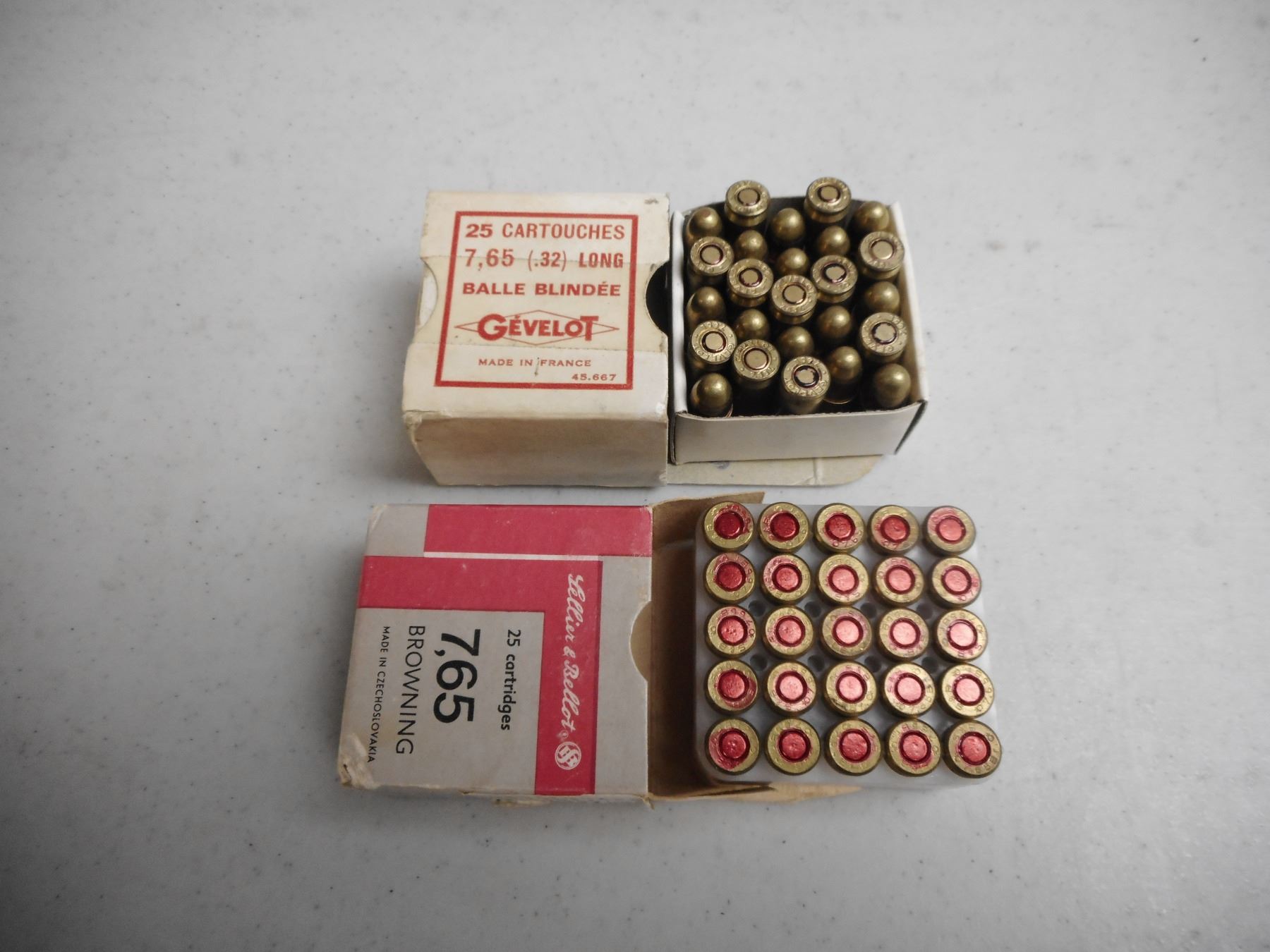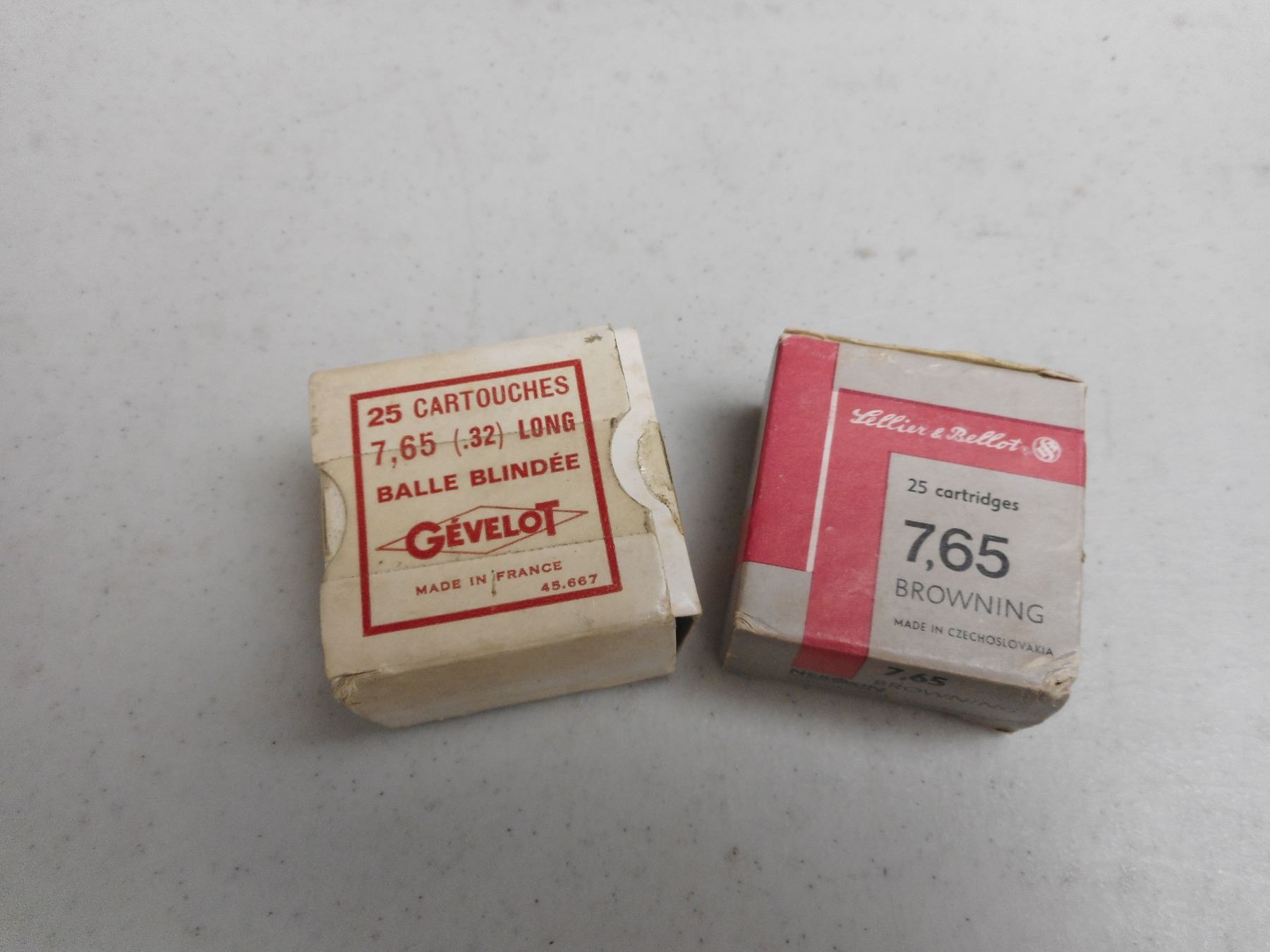 7.65MM (.32) LONG AMMO , 50 RNDS TOTAL/ONE BOX GEVELOT CO., 2ND BOX LELLIER & BELLOT. 7.65MM