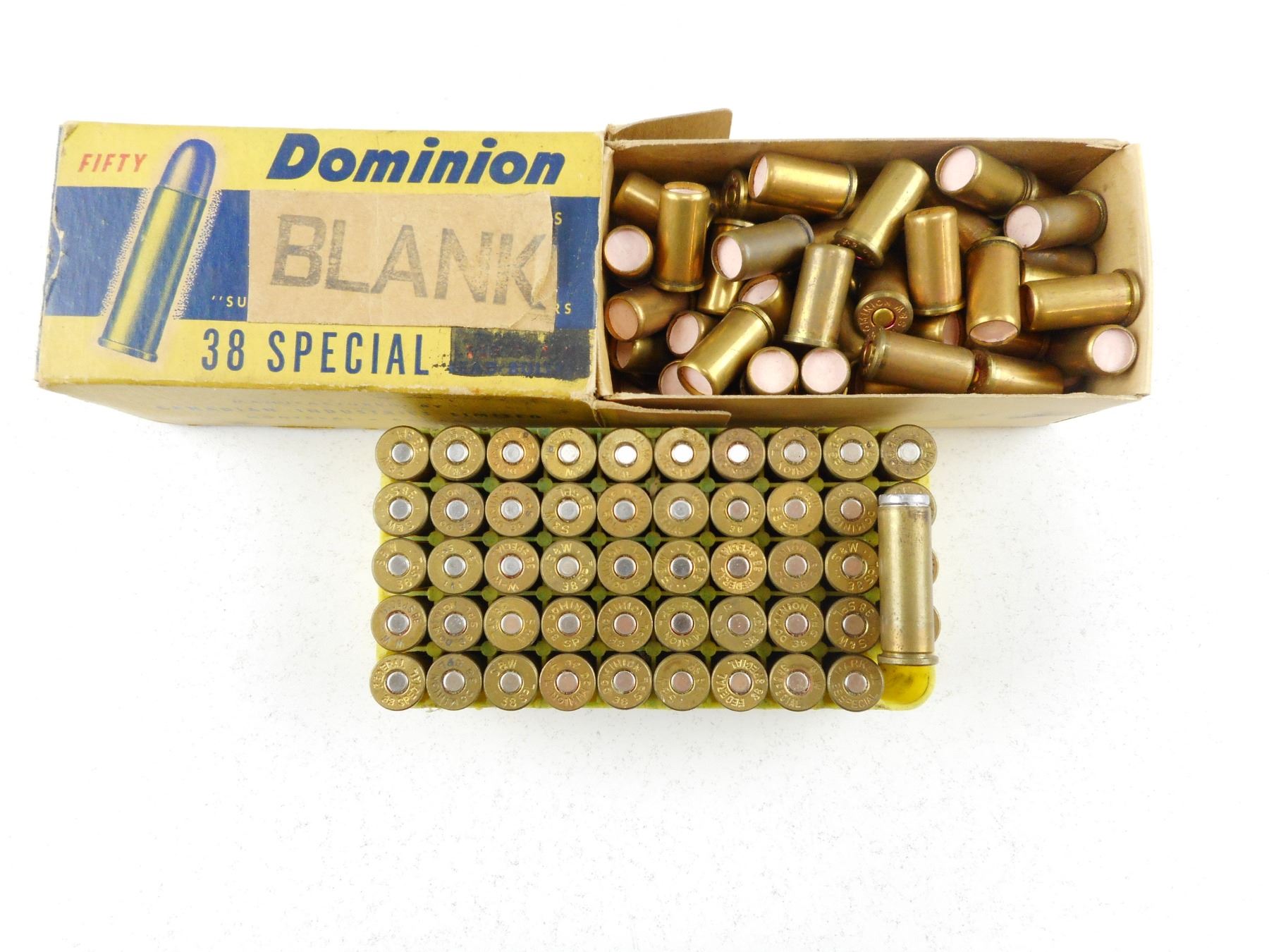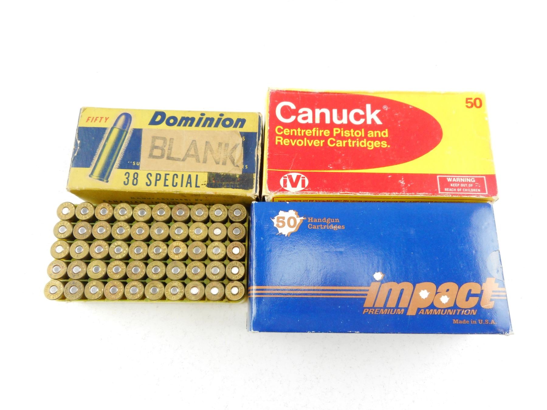 38 SPECIAL IMPACT, CANUCK AMMO , 150 RNDS ASSORTED (IMPACT, CANUCK, STAMPED SBW, 71 DOMINION BLANKS IN VINTAGE BOX