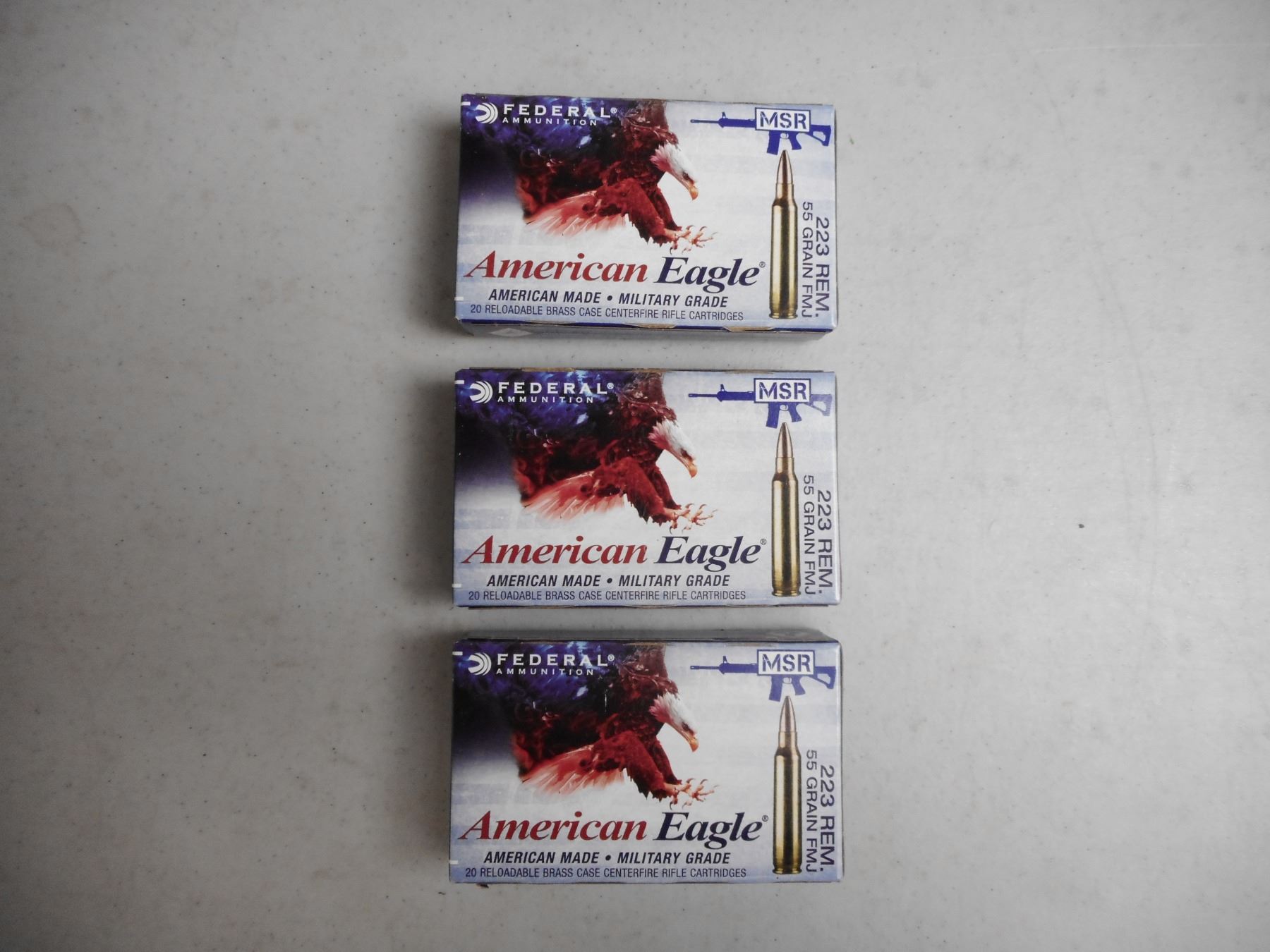 223 REM. AMERICAN EAGLE AMMO , 60 RNDS 223 REM. 55 GRNS FMJ, SEALED BOXES