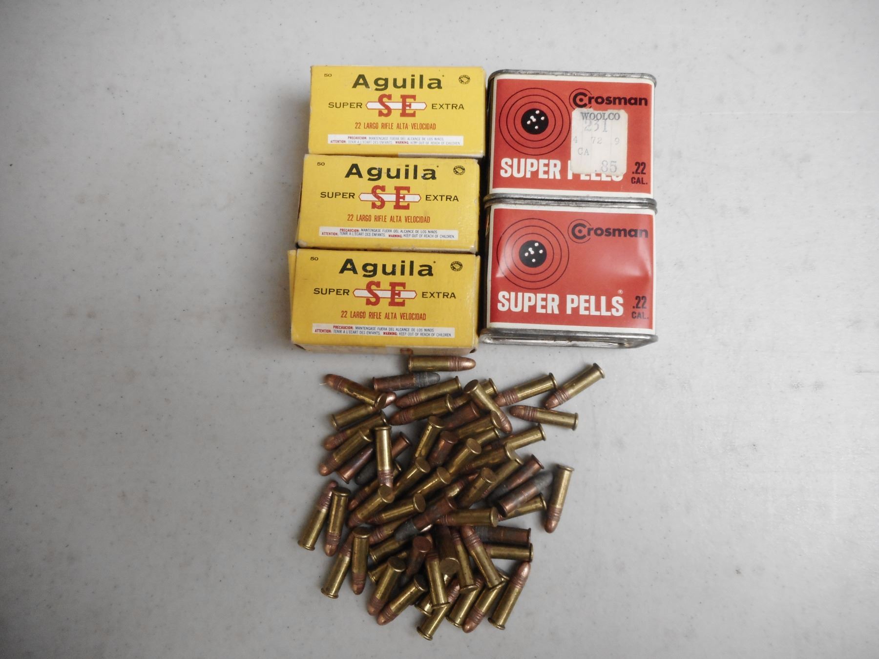 .22 LR AQUILA SE AMMO, .22 CAL PELLETS , 210 RNDS .22 LR AQUILA SUPER EXTRA AMMO, APPROX. 500 CROSMAN SUPER PELLS IN TIN BOXES