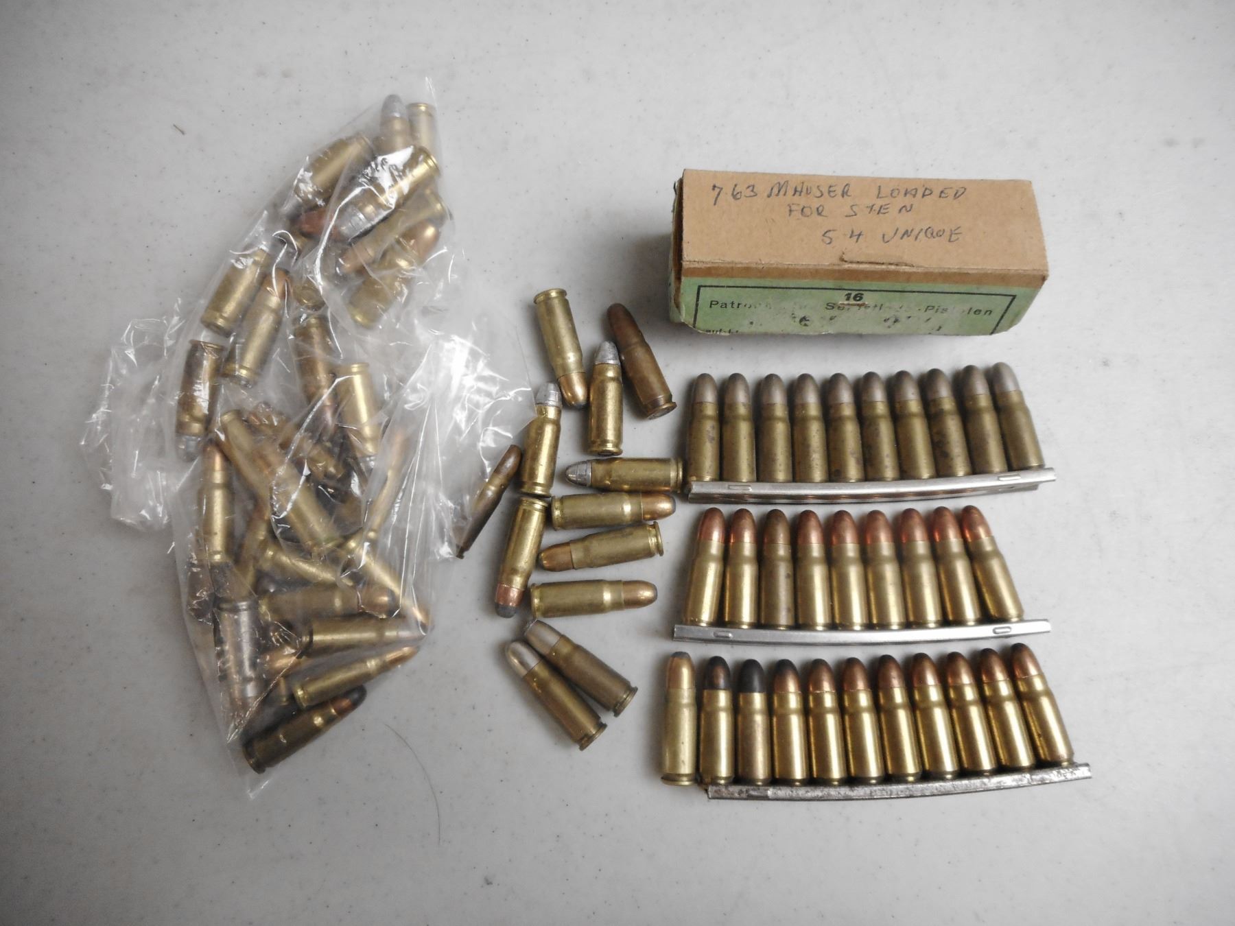 ASSORTED .30CAL, 7.62X25, AND 7.63 MAUSER , 91 RNDS TOTAL ASSORTED AMMO AND RELOADS, .30 CAL, 7.62X25, AND 7.63 MAUSER, SOME ON STRIPPER CLIPS,