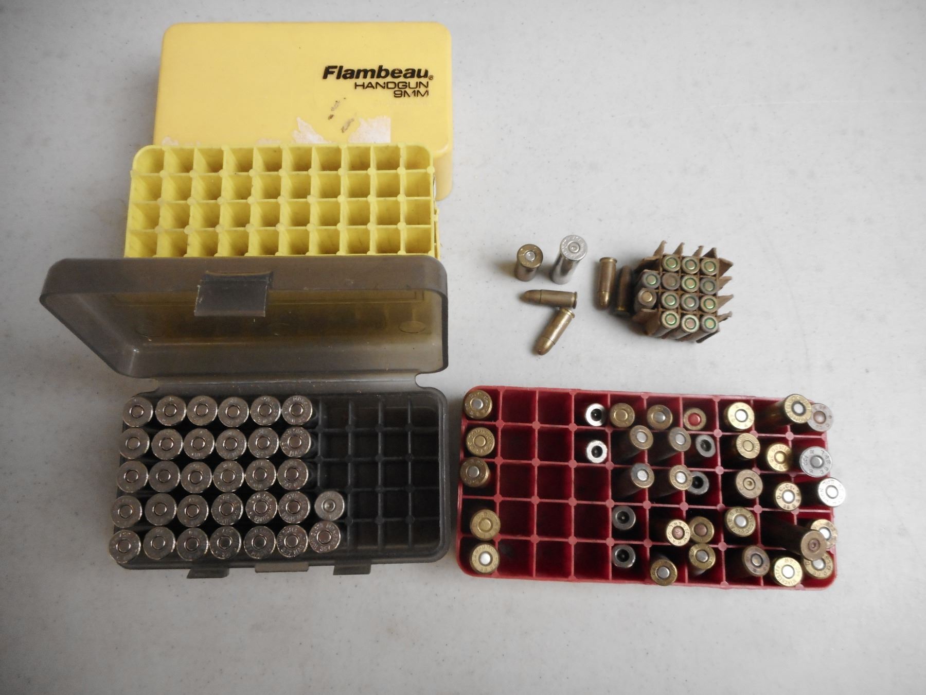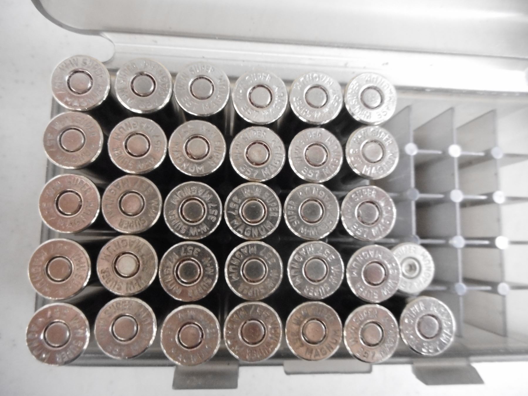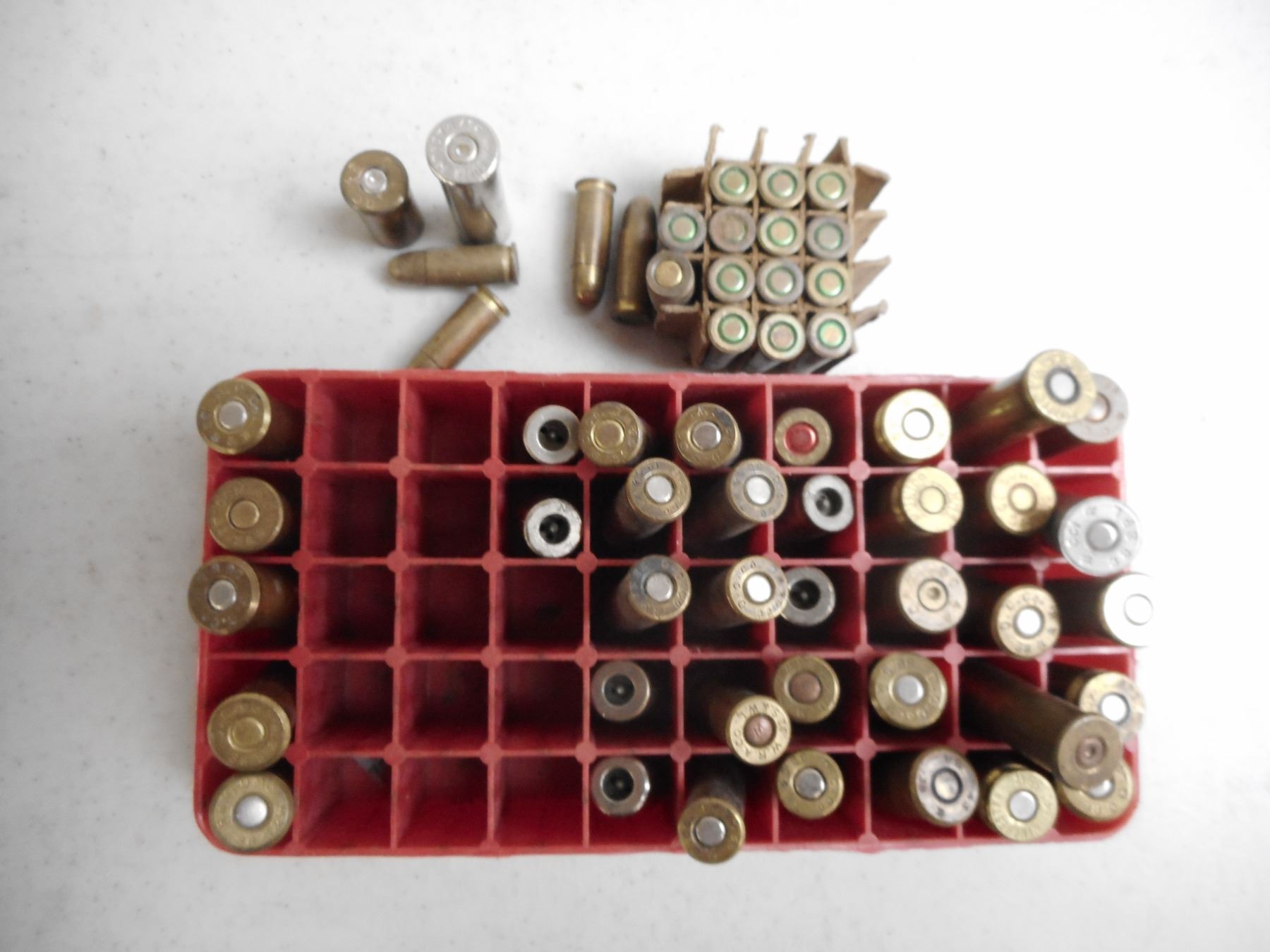 ASSORTED AMMO, SOME SIZED INCLUDE 38 S & W, 357 MAGNUM, 32 S &W , 85 RNDS TOTAL OF ASSORTED AMMO INCLUDED 38 S&W, 357 MAGNUM, 32 S& W, 2 BRASS, HARD PLASTIC CASES
