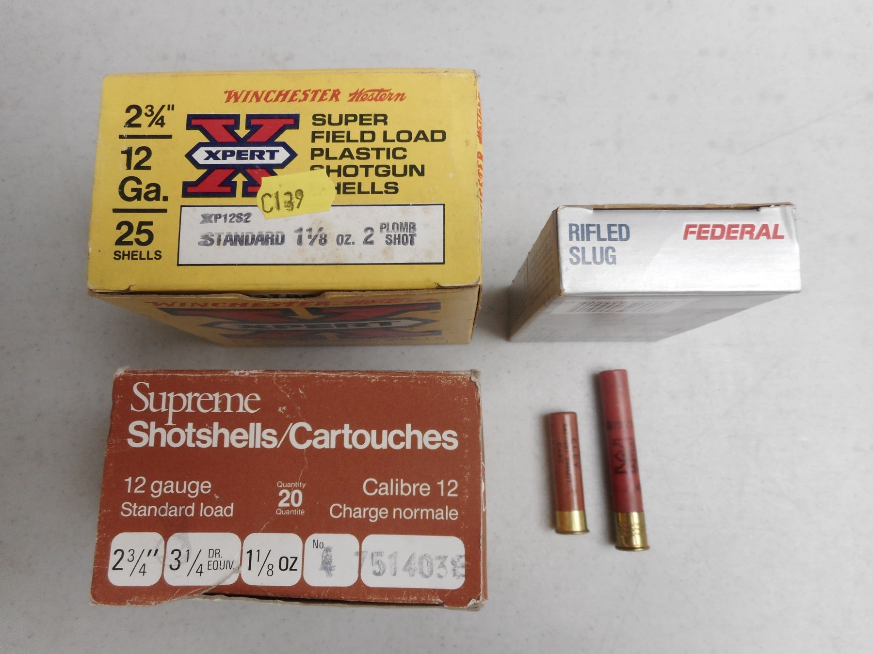 ASSORTED 12 GAUGE SHOTGUN SHELLS , 46 SHOTGUN SHELLS, 12 GAUGE, 2 3/4", ASSORTED SHOTS, SLUGS, 12 GA, 1/3/4" , 2 SHOT