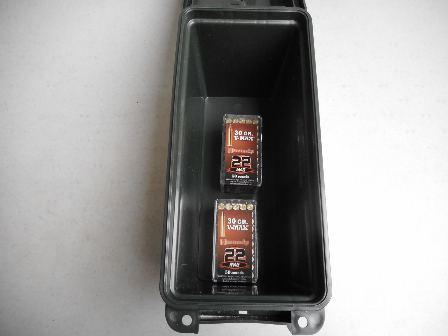 HORNADY 22 MAG AMMO IN AMMO CAN MILITARY STYLE PLASTIC BOX , 100 RNDS HORNADY 22 MAG AMMO SEALED IN AMMO CAN MILITARY STYLE PLASTIC CASE